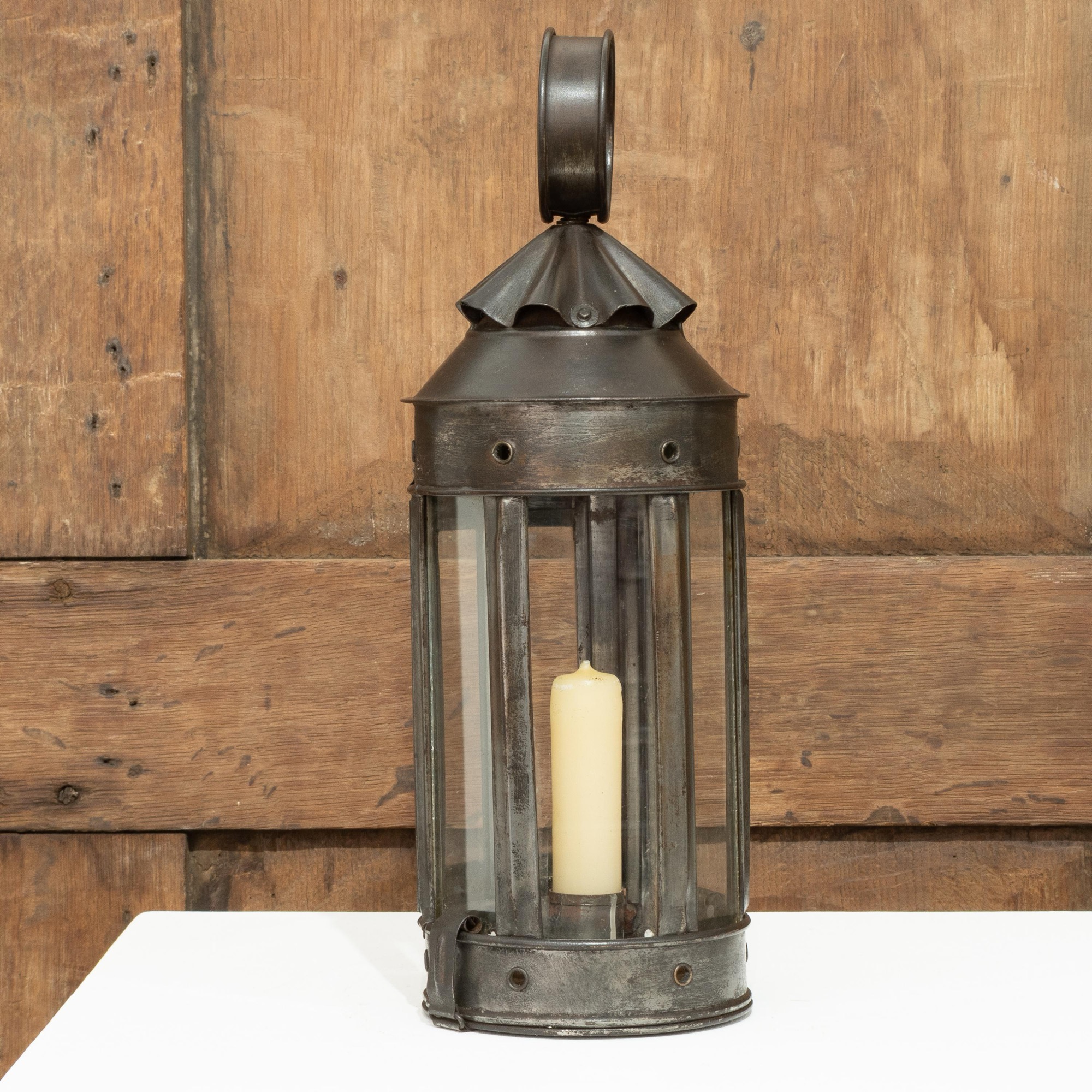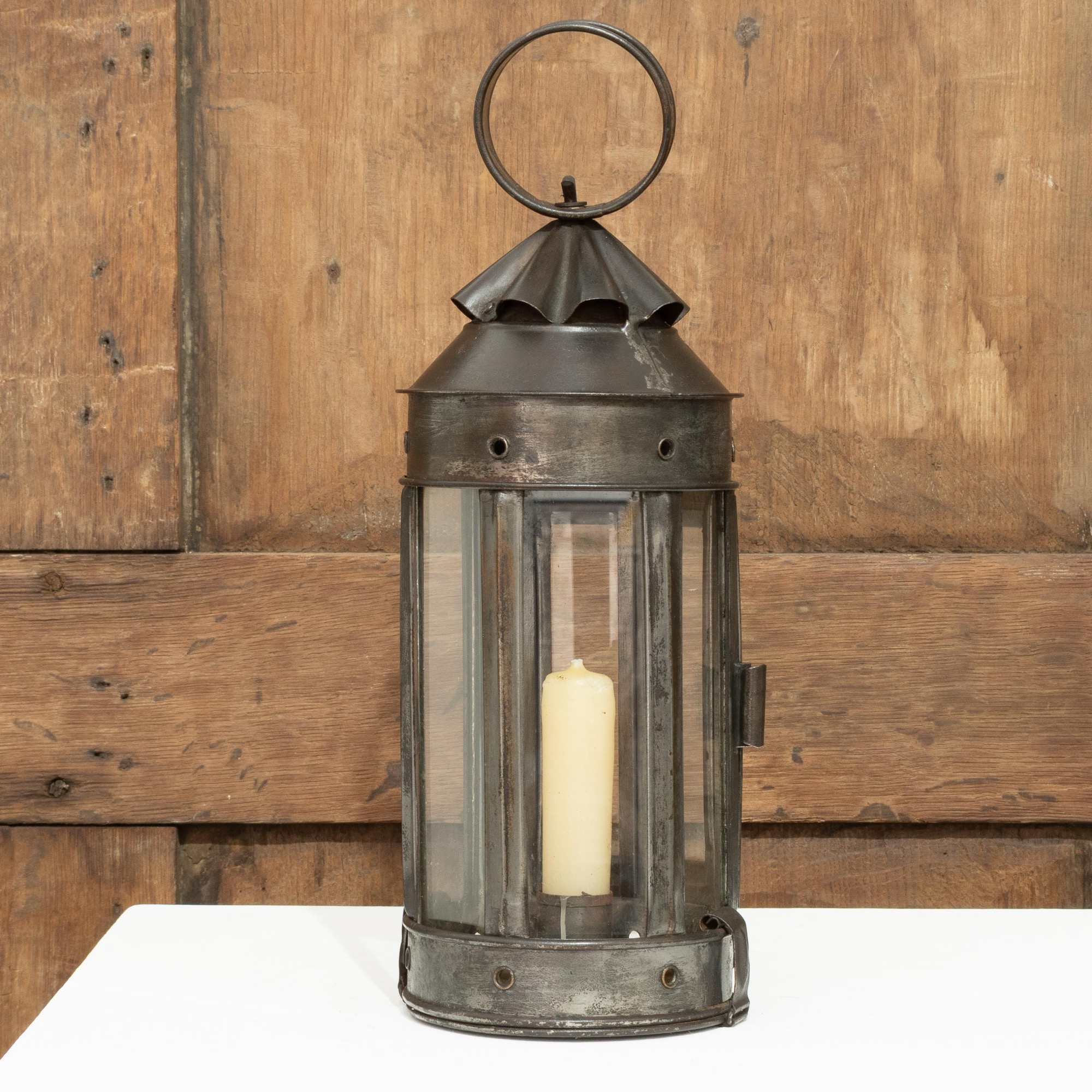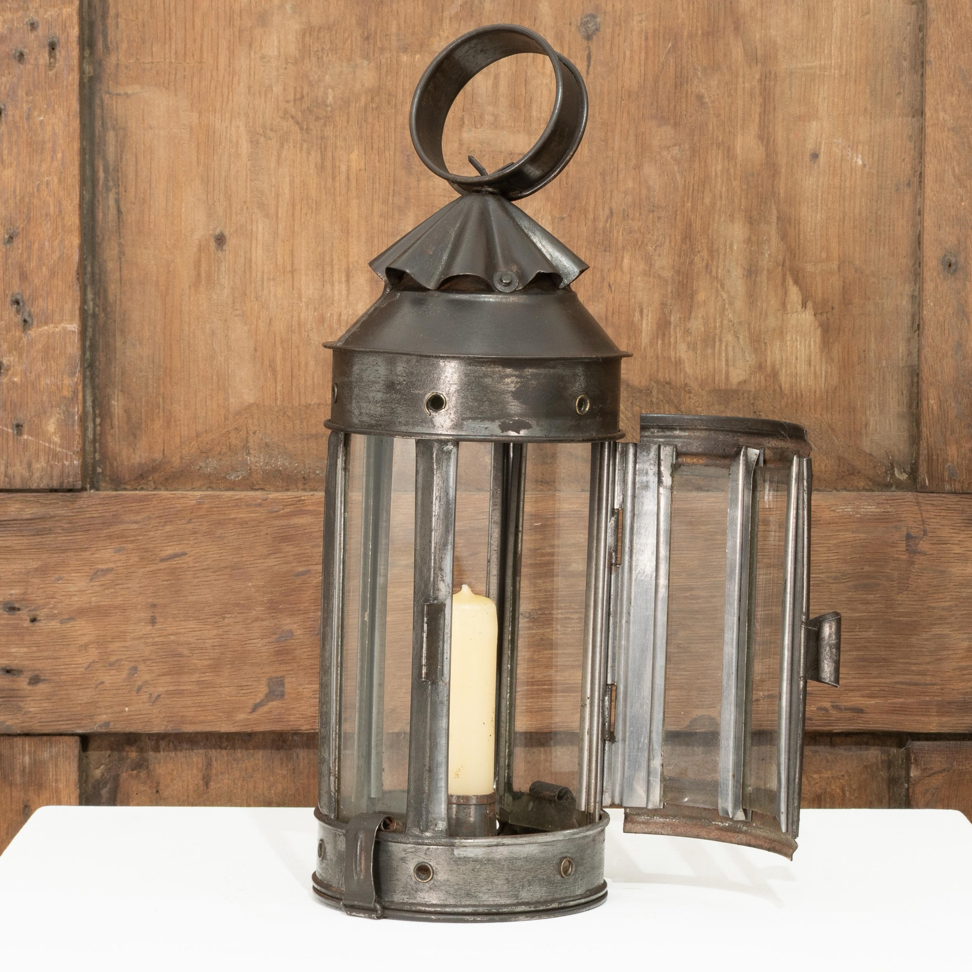 Having a crimped conical chimney surmounted by a hanging/carry loop, the body of cylindrical form with glass panels to either side and in the hinged door, enclosing a candle socket