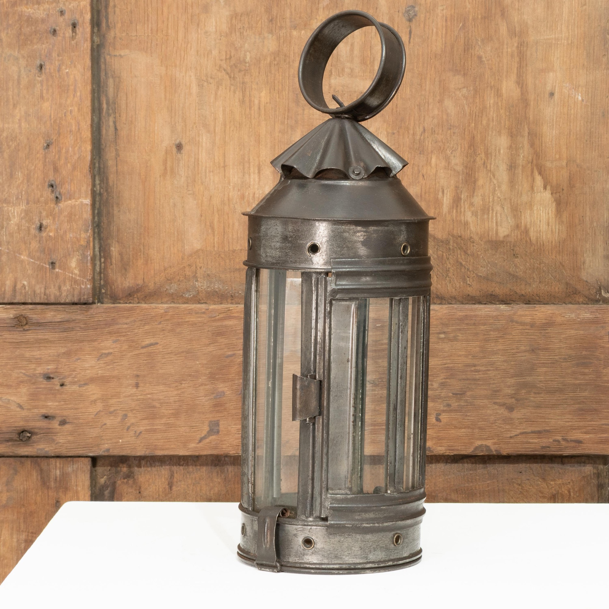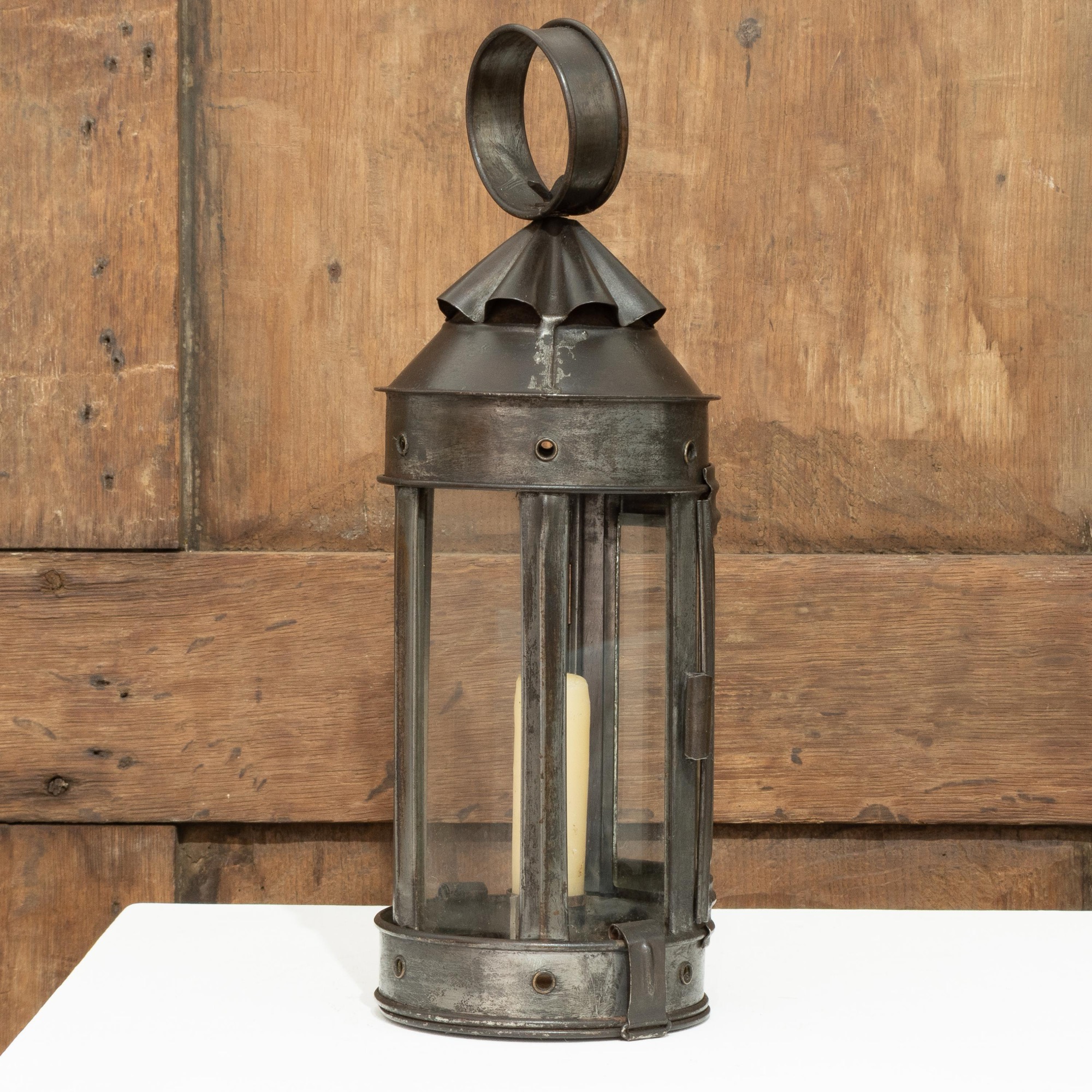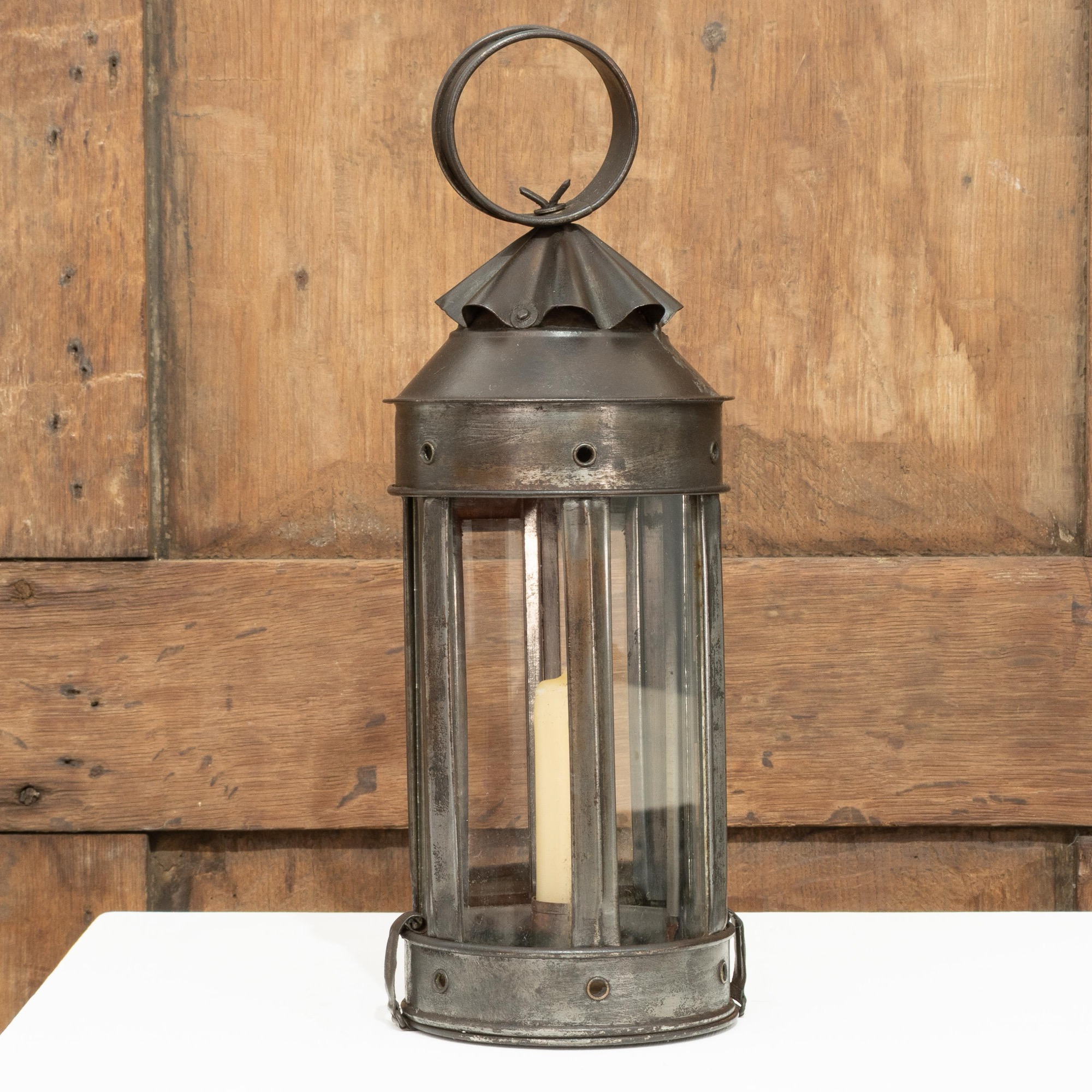 Having a crimped conical chimney surmounted by a hanging/carry loop, the body of cylindrical form with glass panels to either side and in the hinged door, enclosing a candle socket