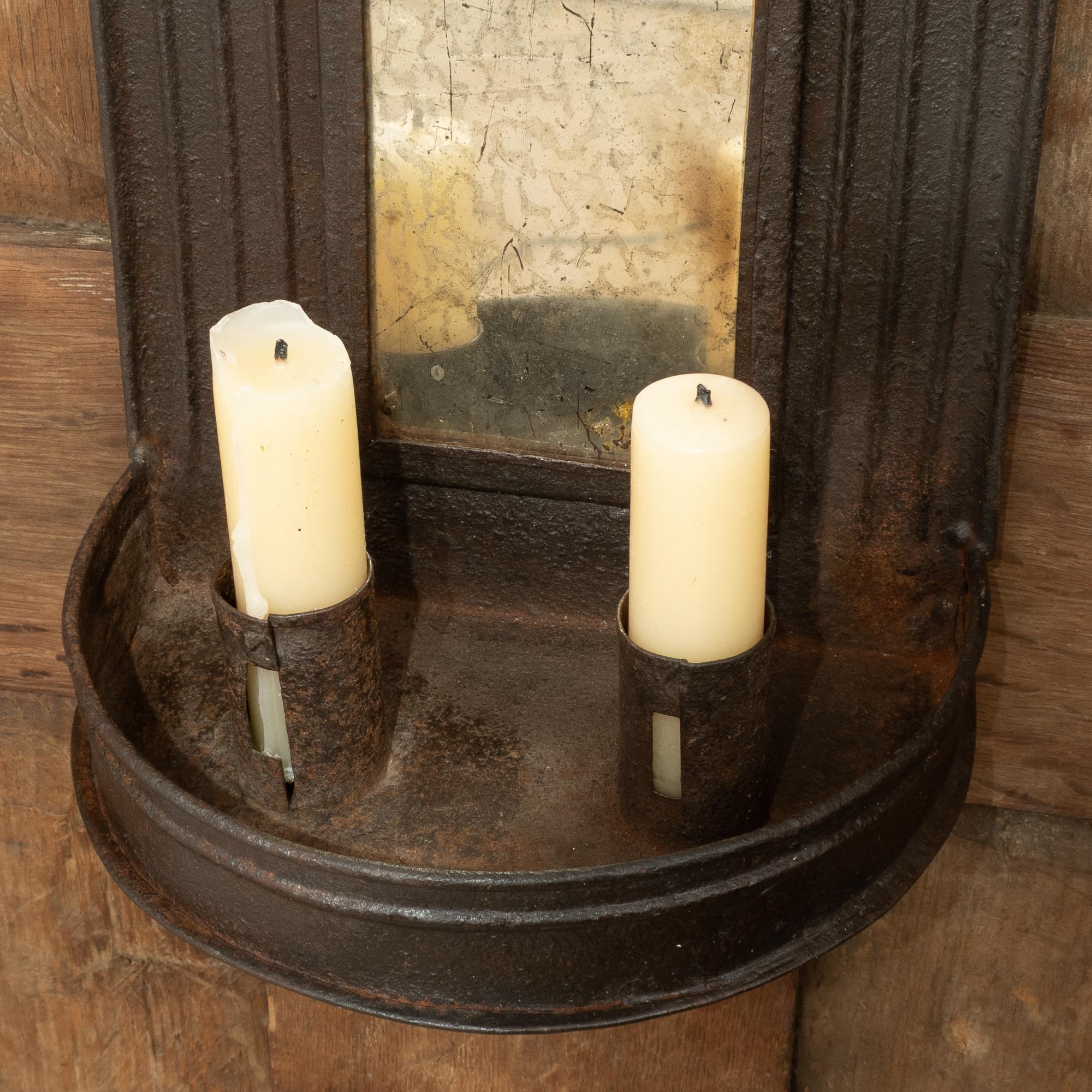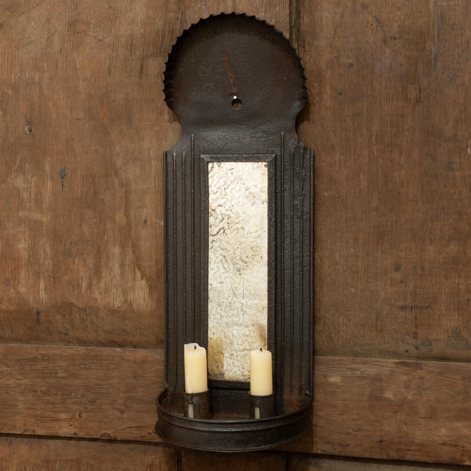 The backplate centred with a mirror plate, beneath an arched and crimped canopy cresting, pierced to the centre for hanging, the D-shaped tray base with a pair of candle sockets
