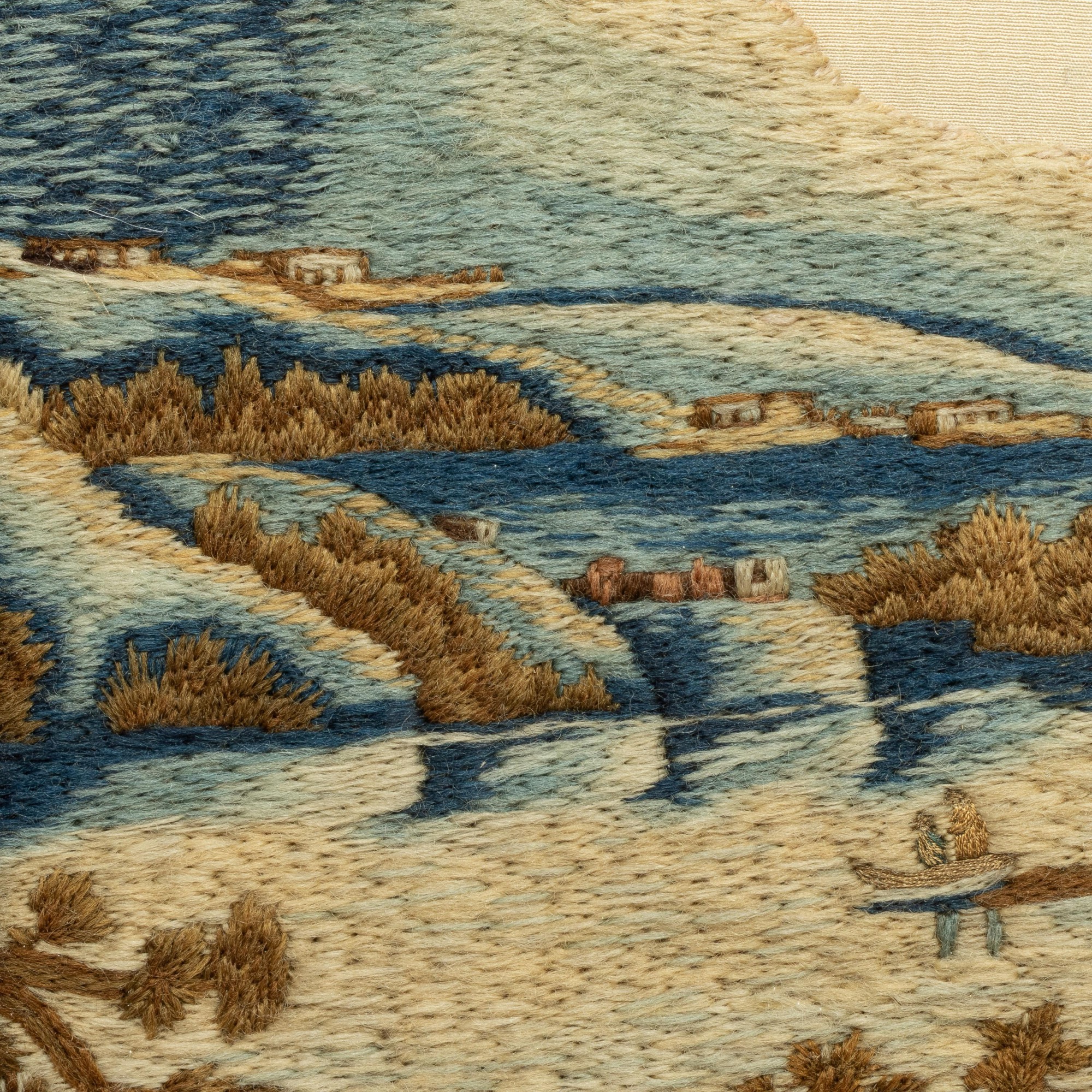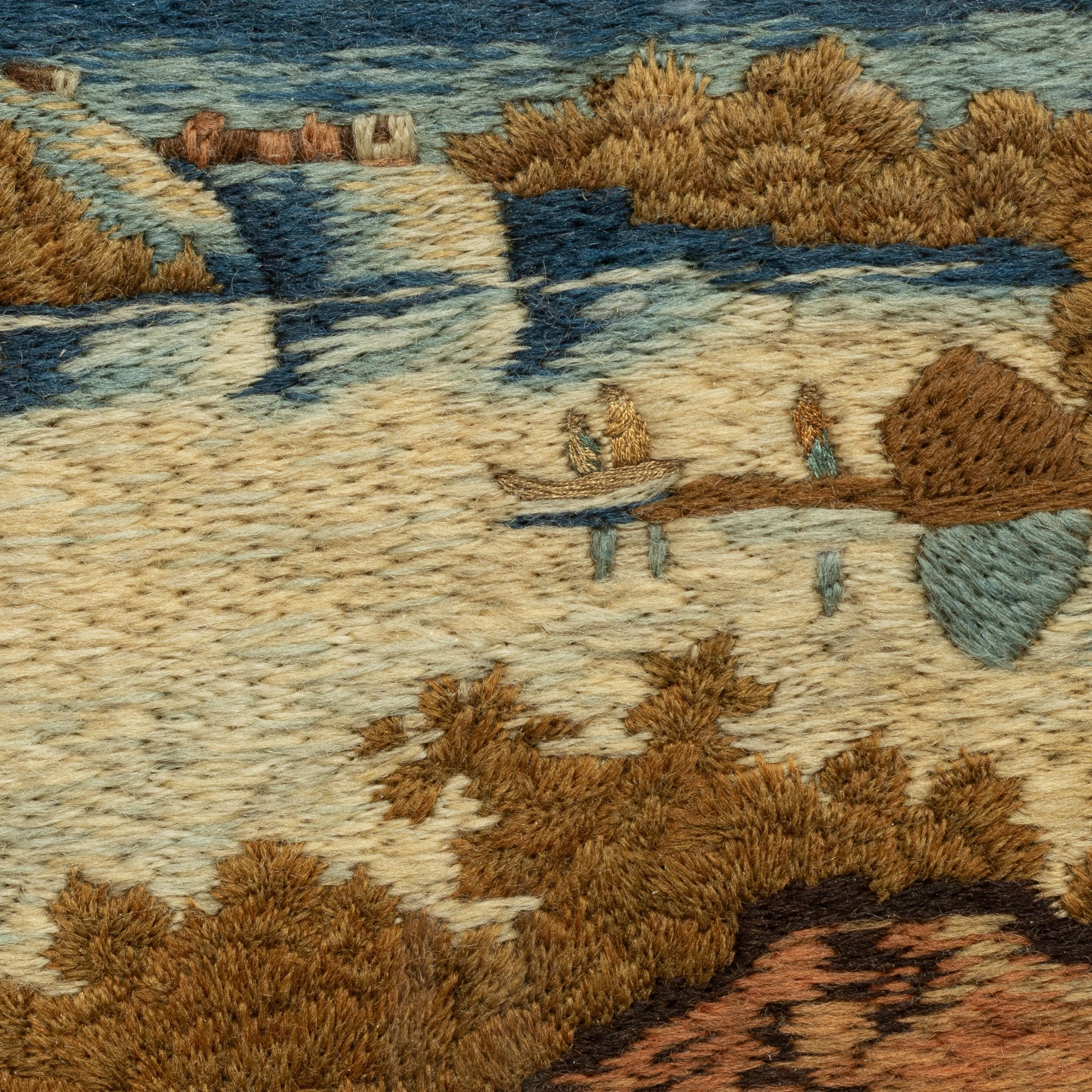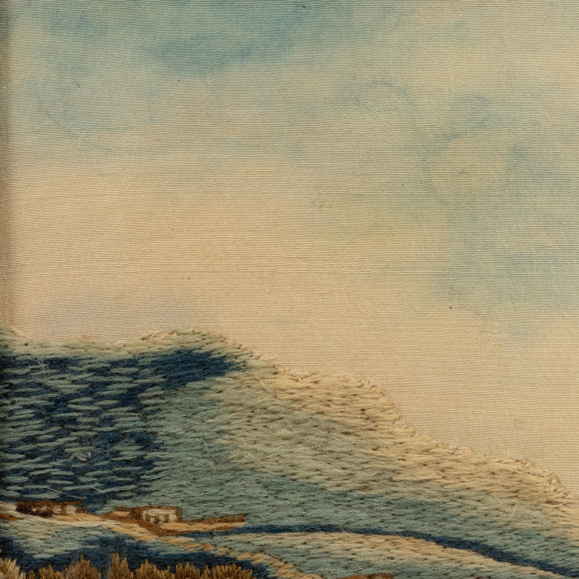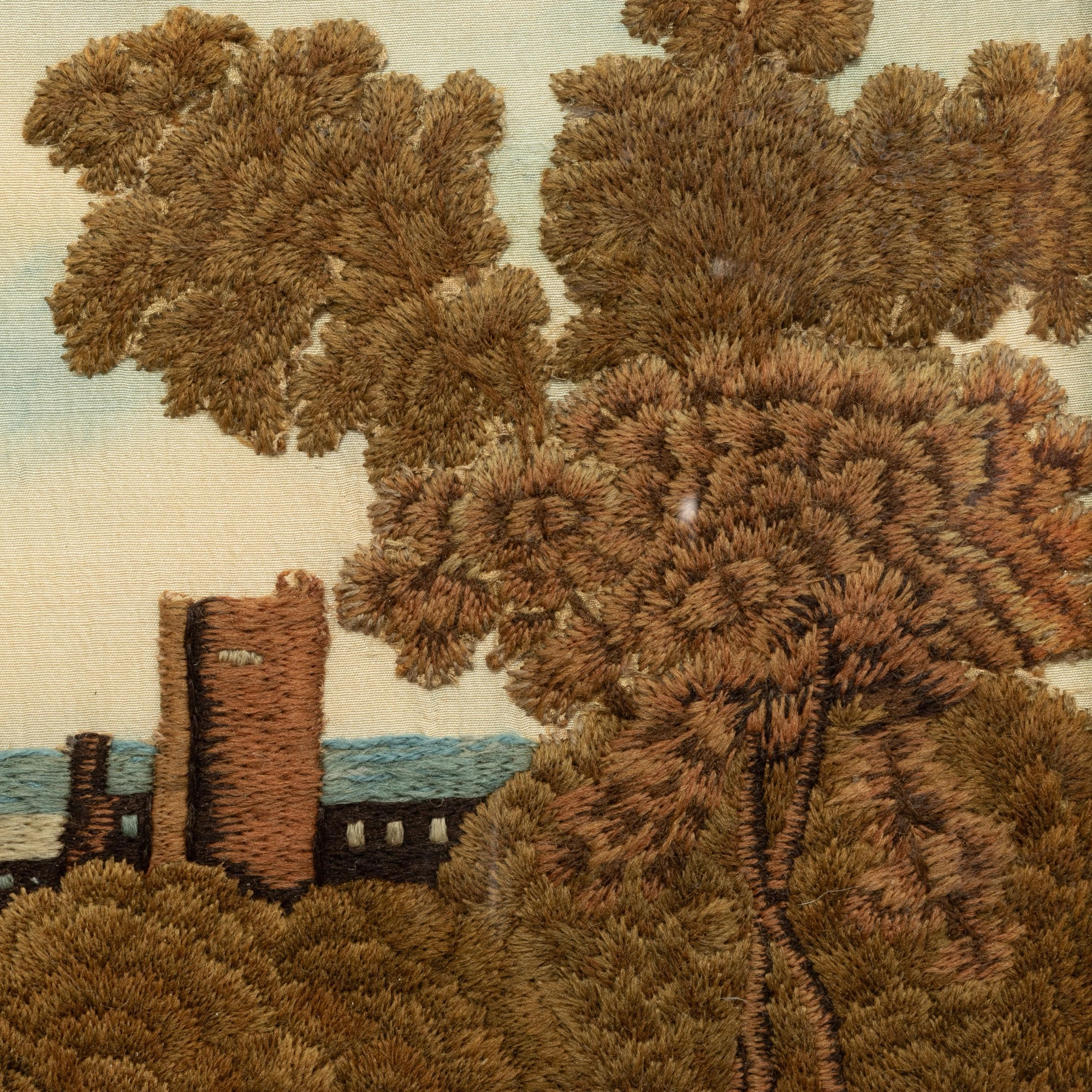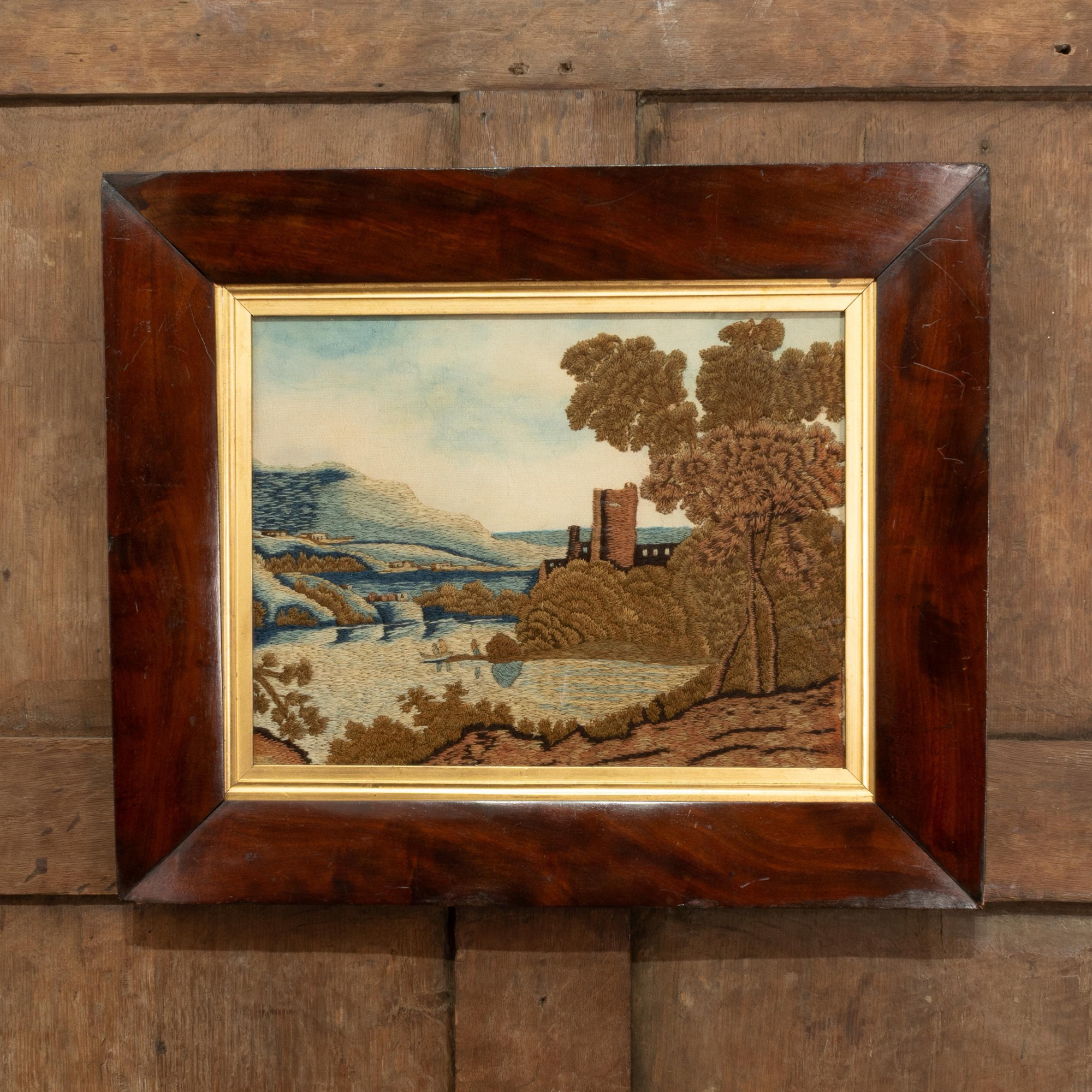 Worked in coloured wools on painted silk, designed with a wooded mountainous lake scene, a boat coming in to moor and a castle or folly to the mid distance, dimensions include mahogany frame, glazed