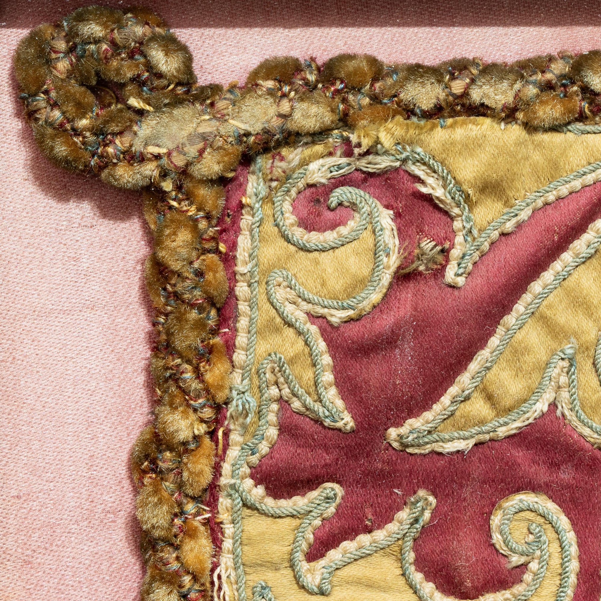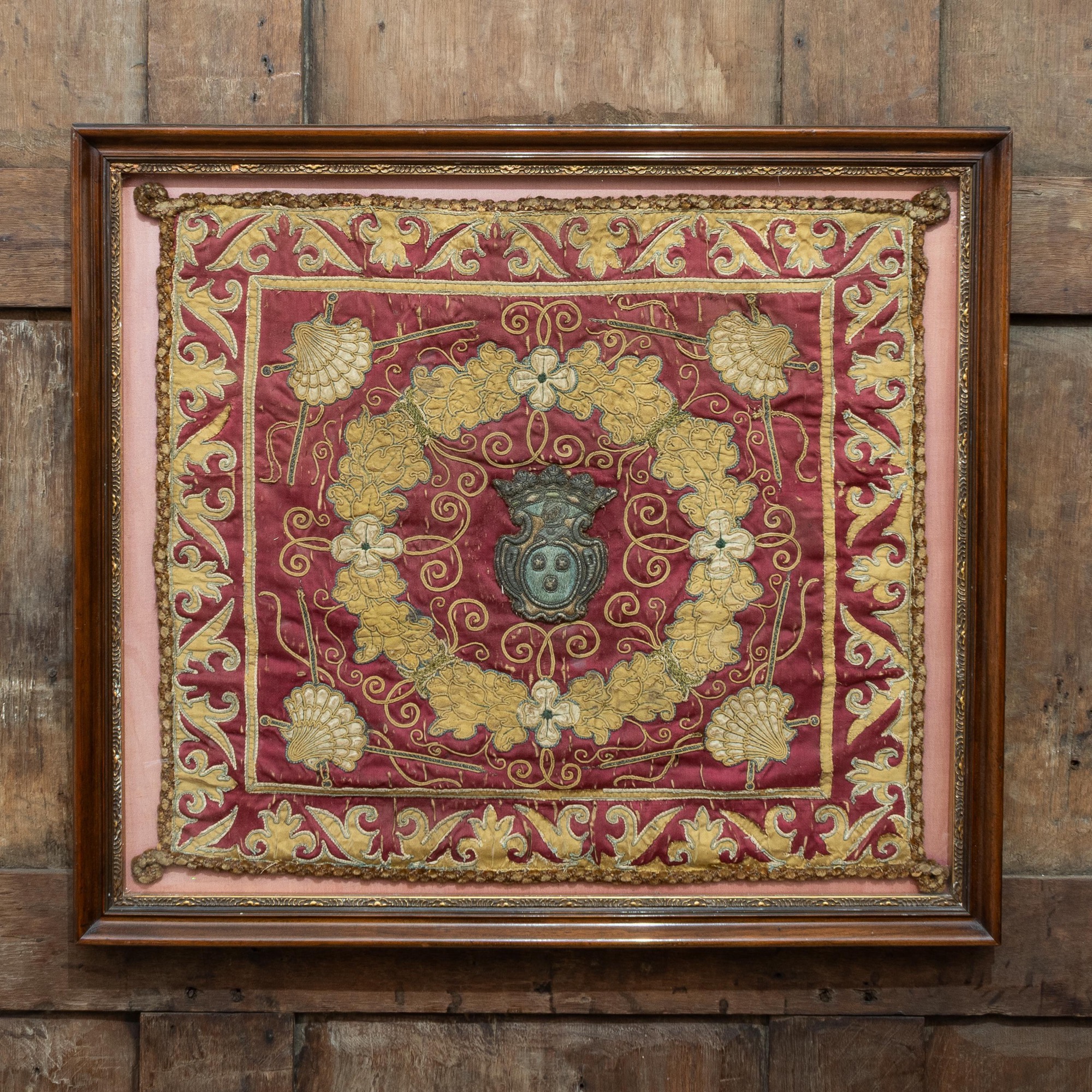 Centred by a coronet cartouche within a floral and foliate wreath, scallop shell and crossed staffs spandrels, within a scrollwork border, chenille rope edging, framed and glazed, cushion cover 47cm high, 52cm wide