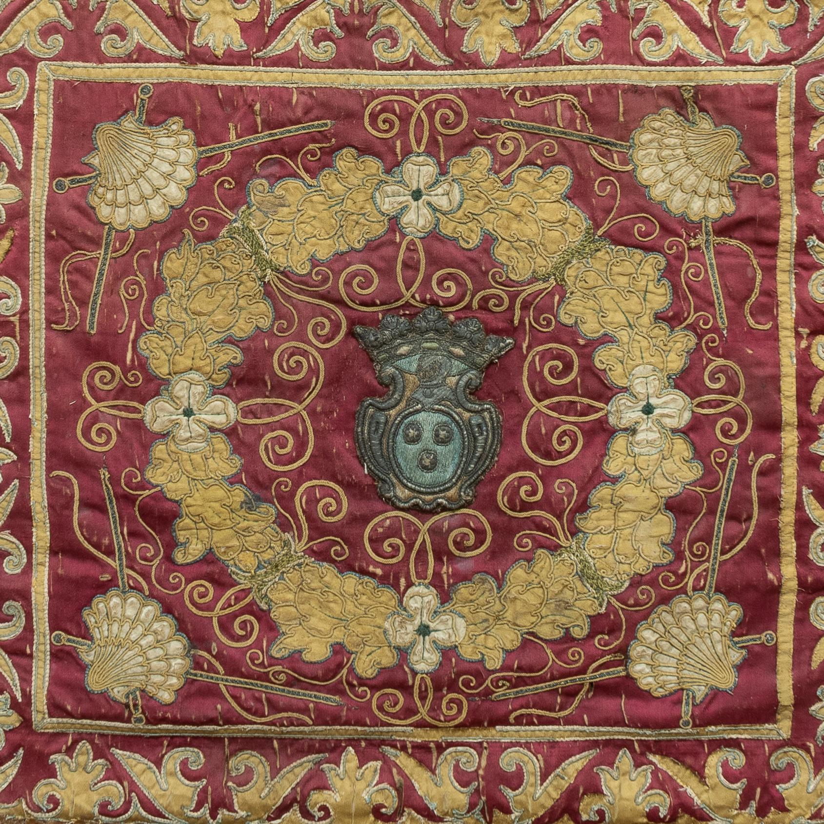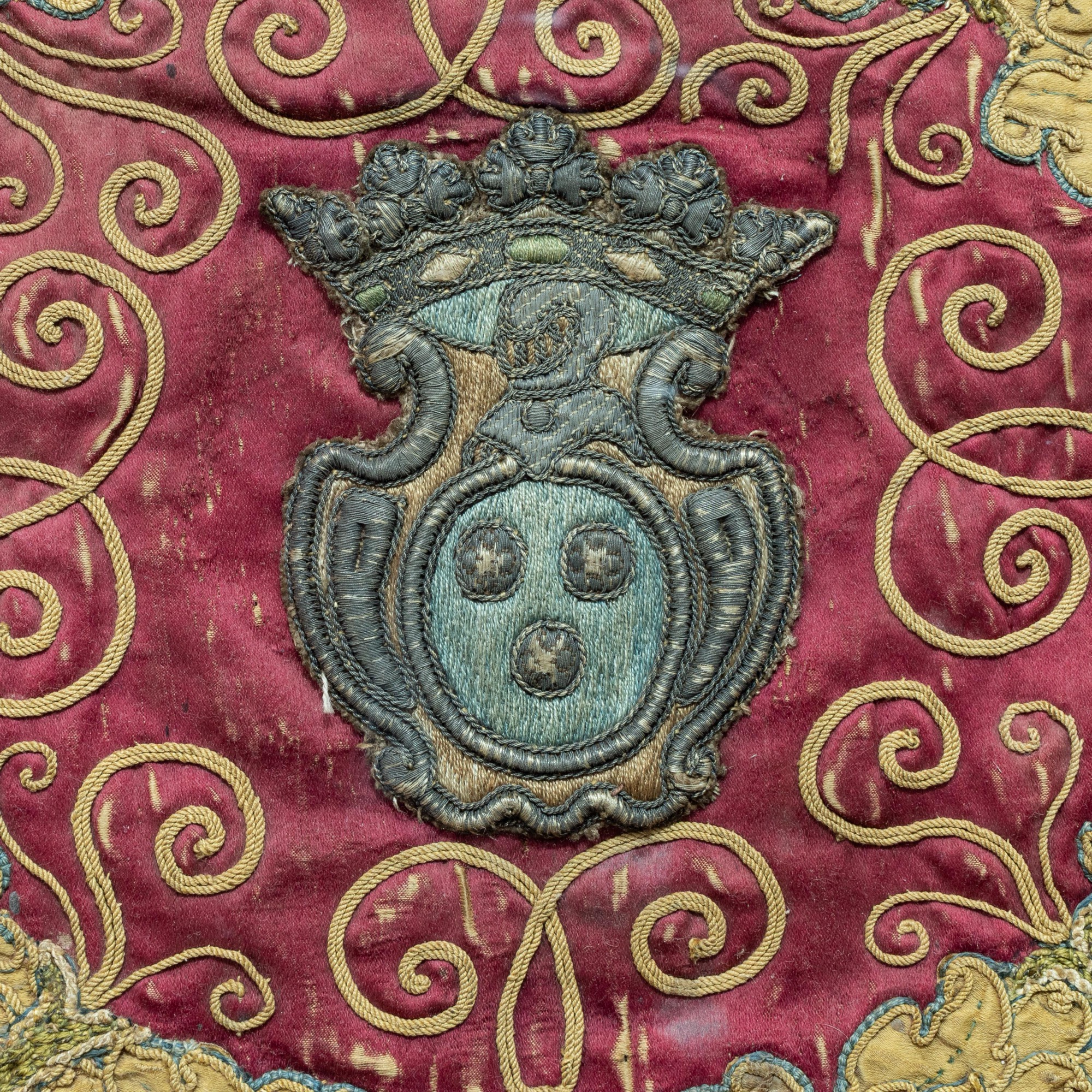 For a pair of comparable cushion covers, again centred by a coat of arms, dated to the 16th century, Italian, see the Metropolitan Museum of Art, New York, acc. no. 59.39.1, .2