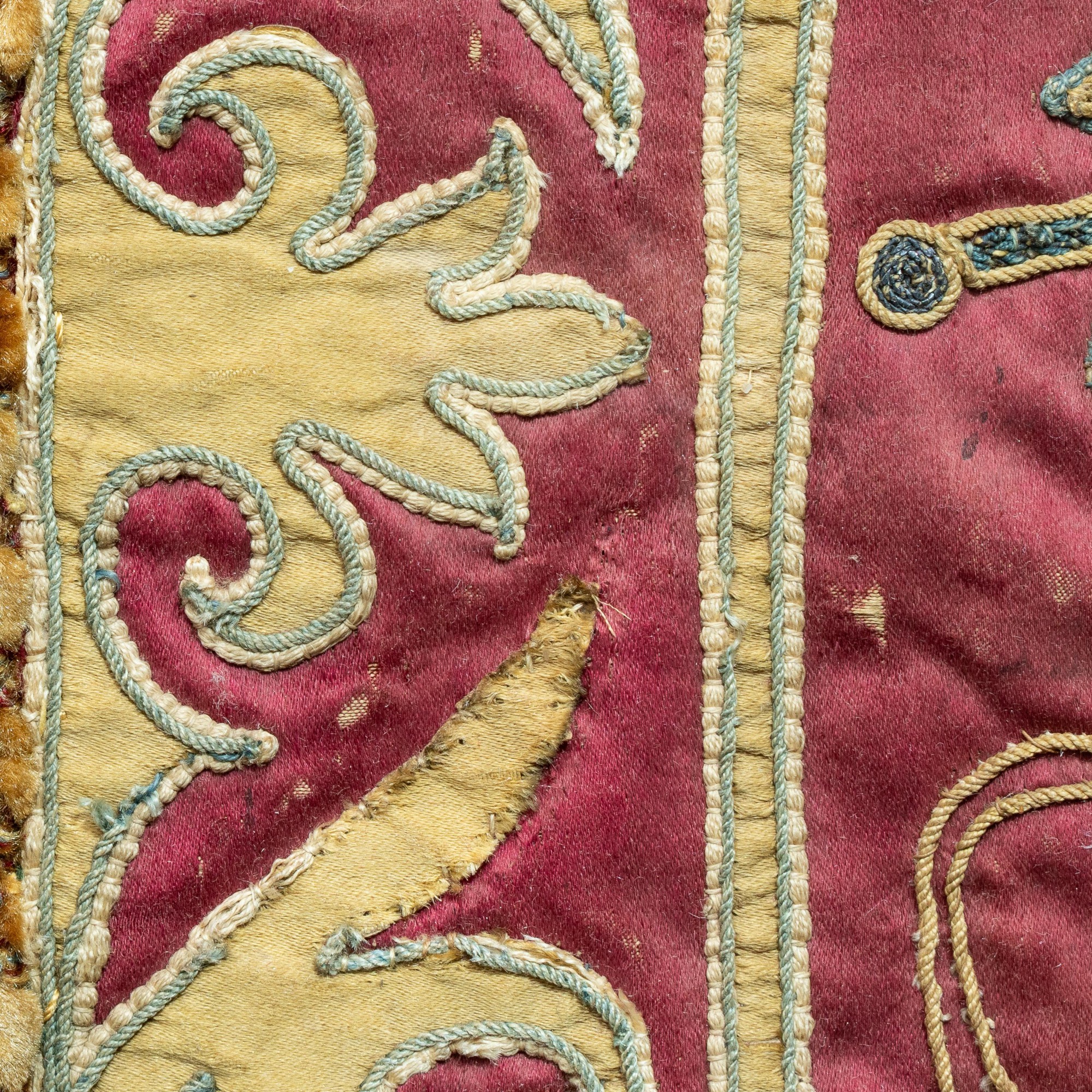 A needlework and appliqué silk cushion cover, Italian or possibly Spanish, circa 1600-40