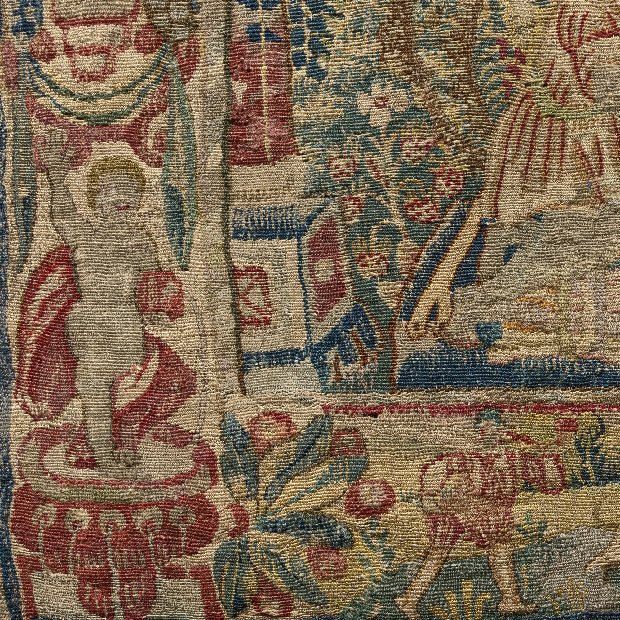 Worked in coloured wools and silks, designed with a scene from the Binding of Isaac; Abraham central with his sword raised high to strike his son, who is bound on a wooden pyre, an angel appearing from above to stop him, a ram caught in a thicket to the left, a servant waiting on the donkey in the background to the right, the whole scene framed within a naive classical arcade, the top and lower borders contain hunting scenes, the sides decorative motifs, fountains, fruit and floral displays, museum glazed, framed