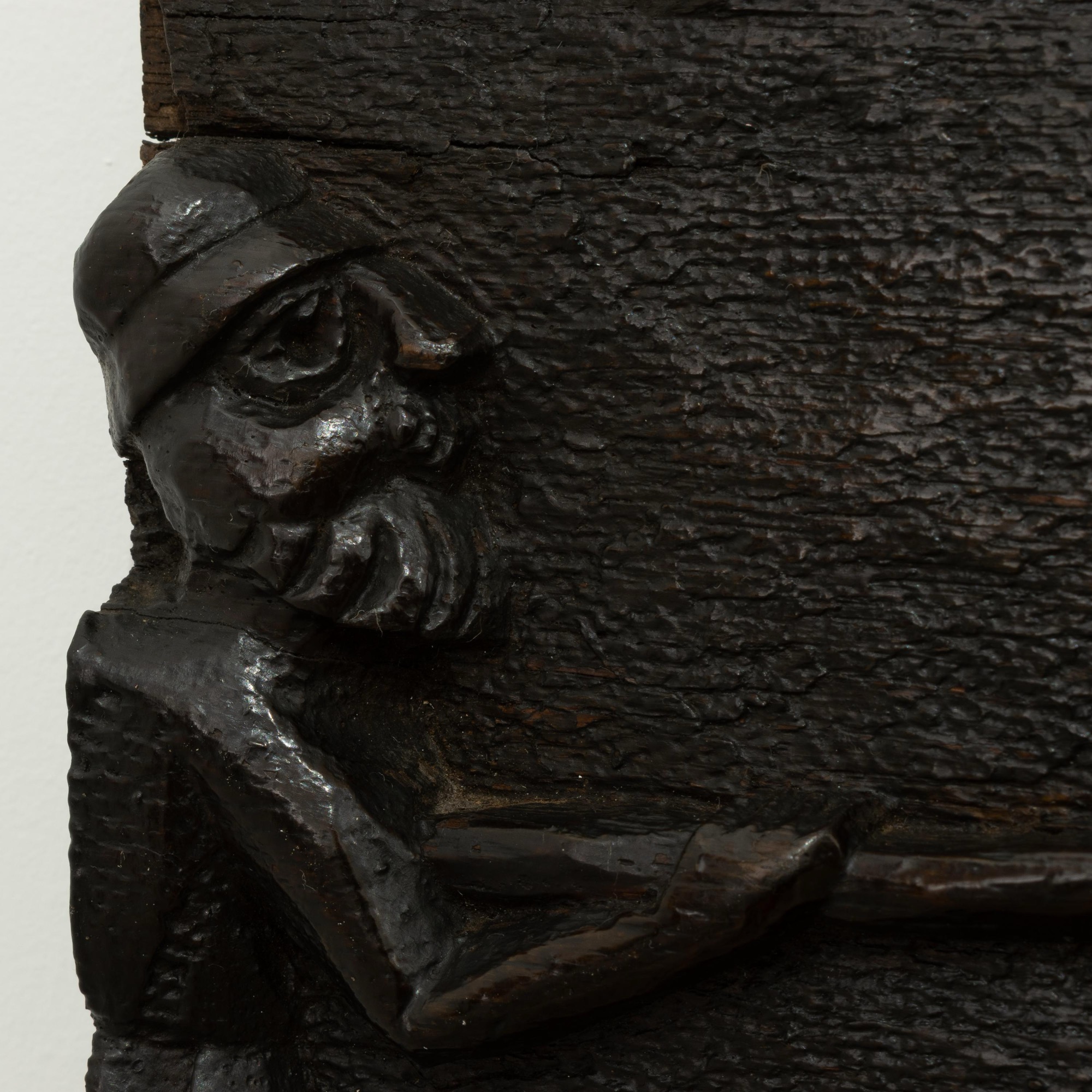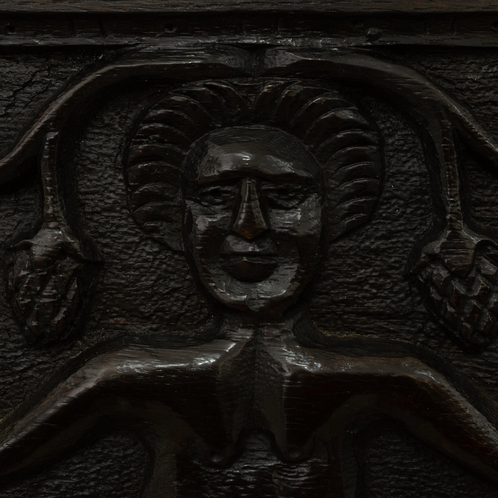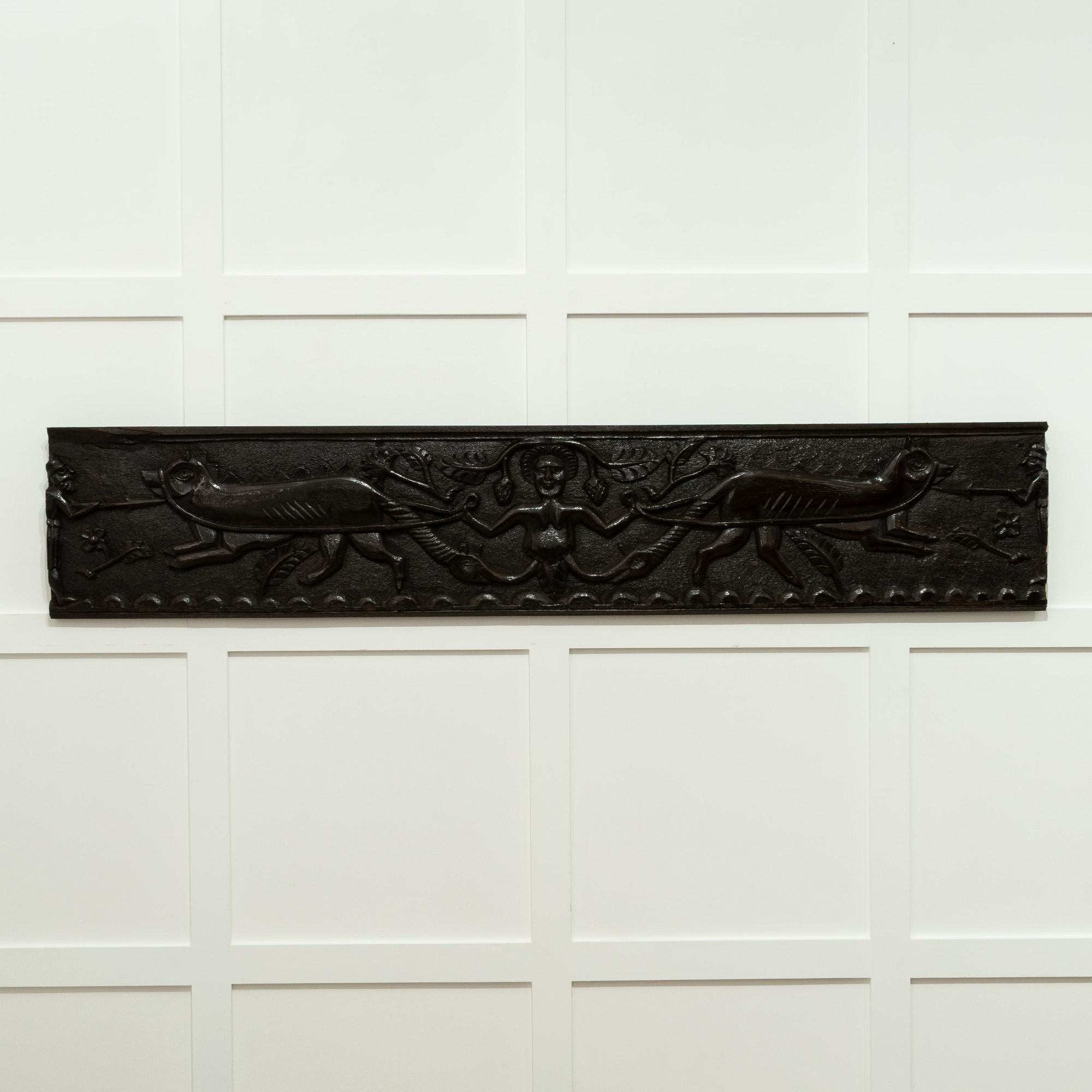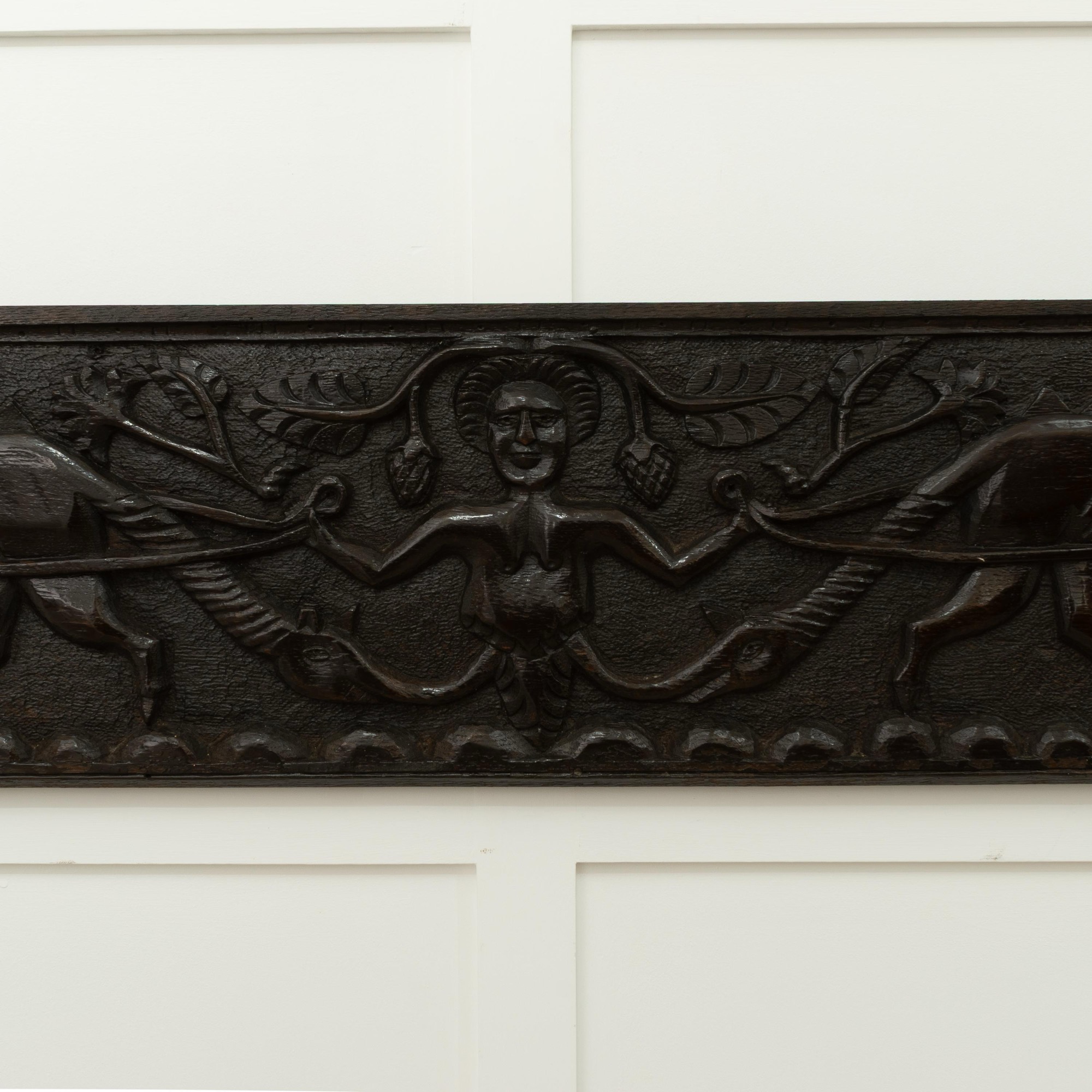 Very possibly originally a fireplace beam from a hunting lodge. See Richard Bebb, 'Welsh Furniture 1250-1950', Vol. I, p. 164 for two comparable fireplace beams. See also the 'Newcourt Cupboard' front, at Cotehele House, Cornwall, illustrated ibid. p. 161, pl. 260a, dated to circa 1515-30, with similarly dressed figures. Further figural comparisons can be drawn with the renowned bedstead of Sir Rhys ap Thomas, circa 1507, ibid., p. 172 & 177