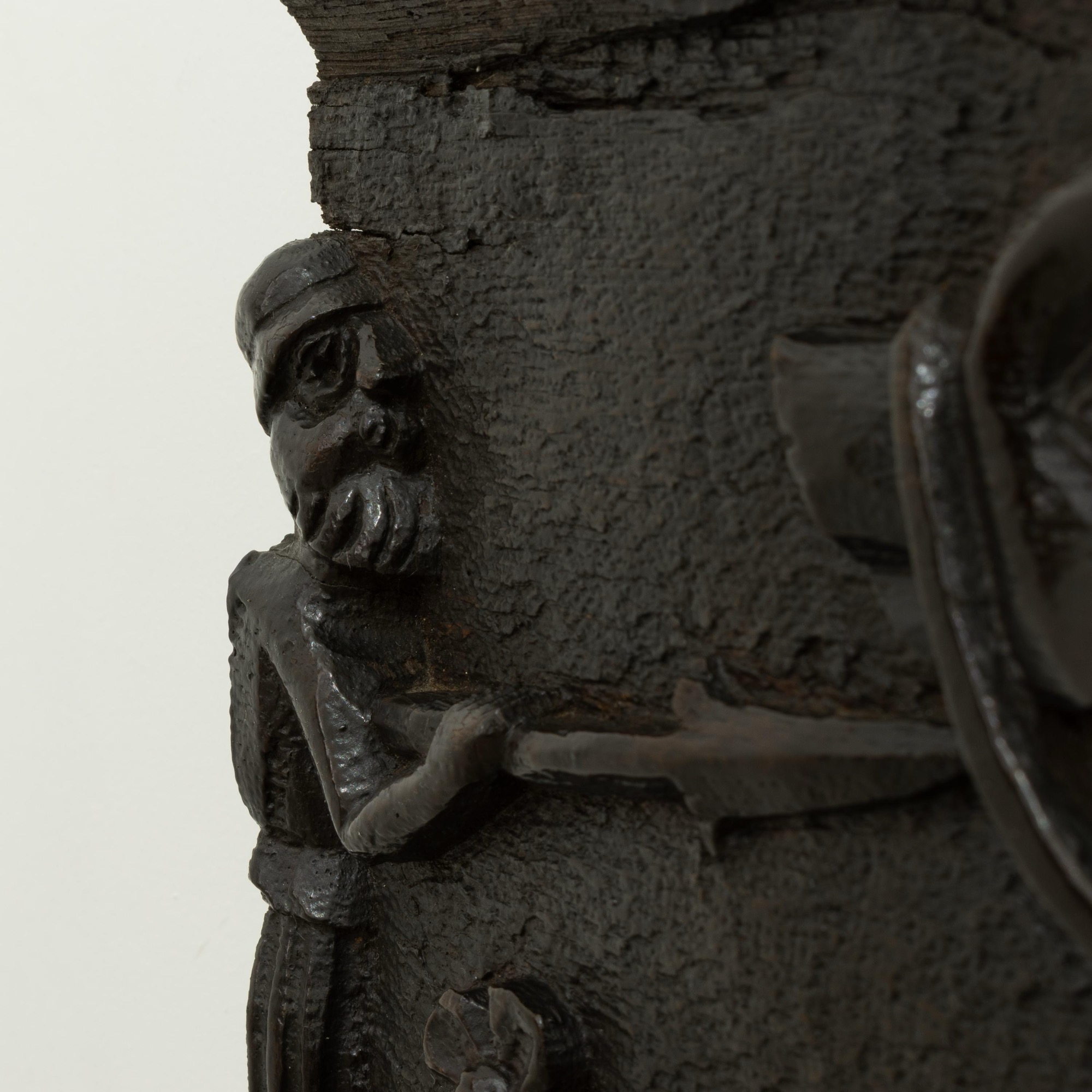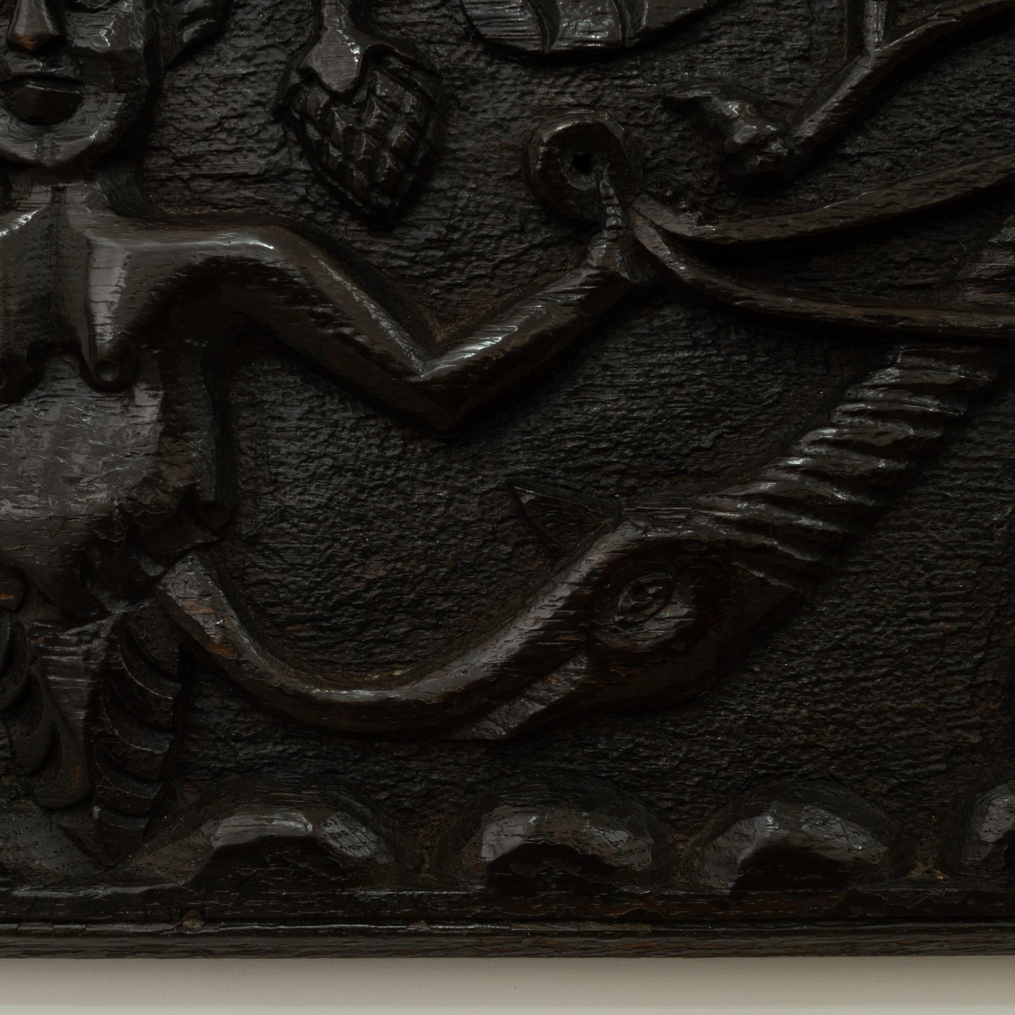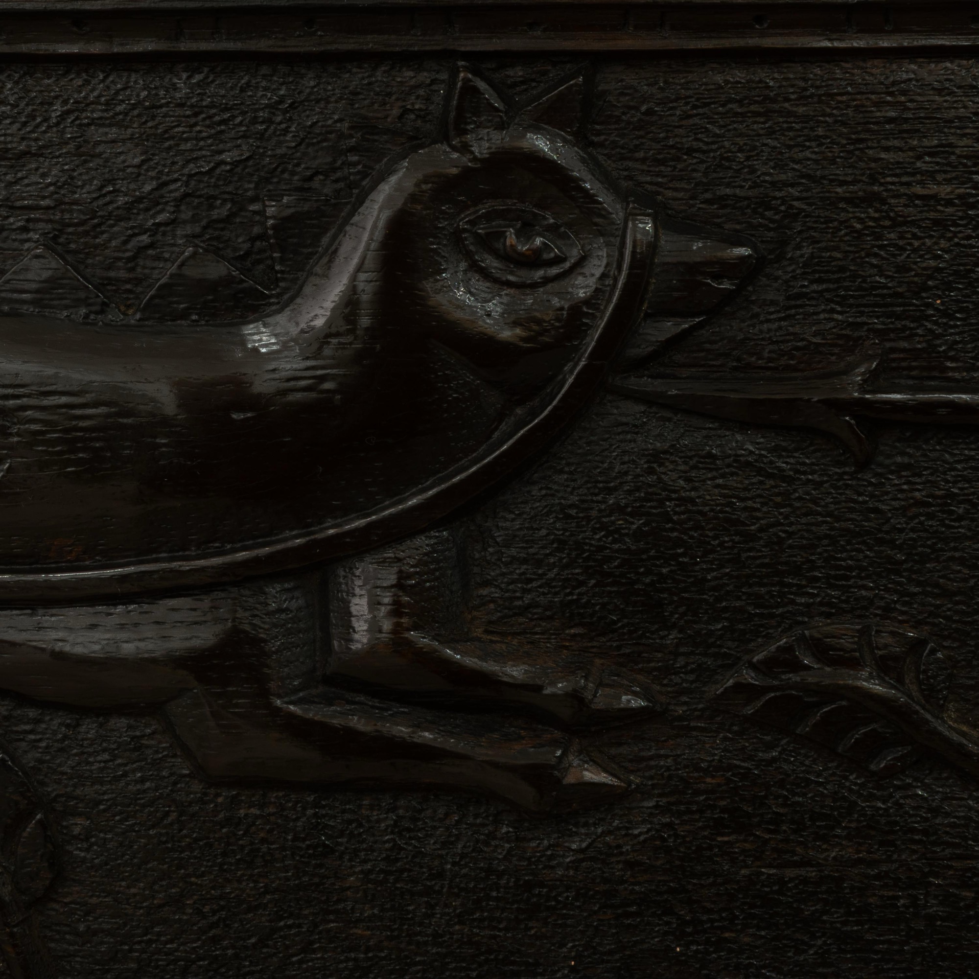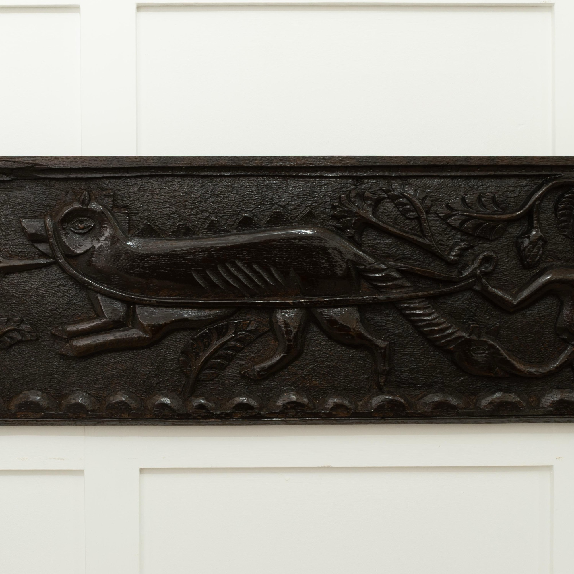 Very possibly originally a fireplace beam from a hunting lodge. See Richard Bebb, 'Welsh Furniture 1250-1950', Vol. I, p. 164 for two comparable fireplace beams. See also the 'Newcourt Cupboard' front, at Cotehele House, Cornwall, illustrated ibid. p. 161, pl. 260a, dated to circa 1515-30, with similarly dressed figures. Further figural comparisons can be drawn with the renowned bedstead of Sir Rhys ap Thomas, circa 1507, ibid., p. 172 & 177