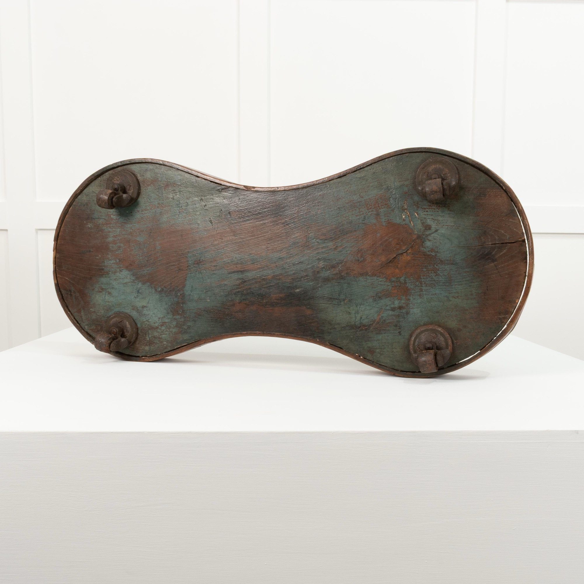 Of typical waisted form, the one-piece thick board carved with radiating drainage channels to a circular well, bentwood sides, traces of historic powder-blue paint, iron castors