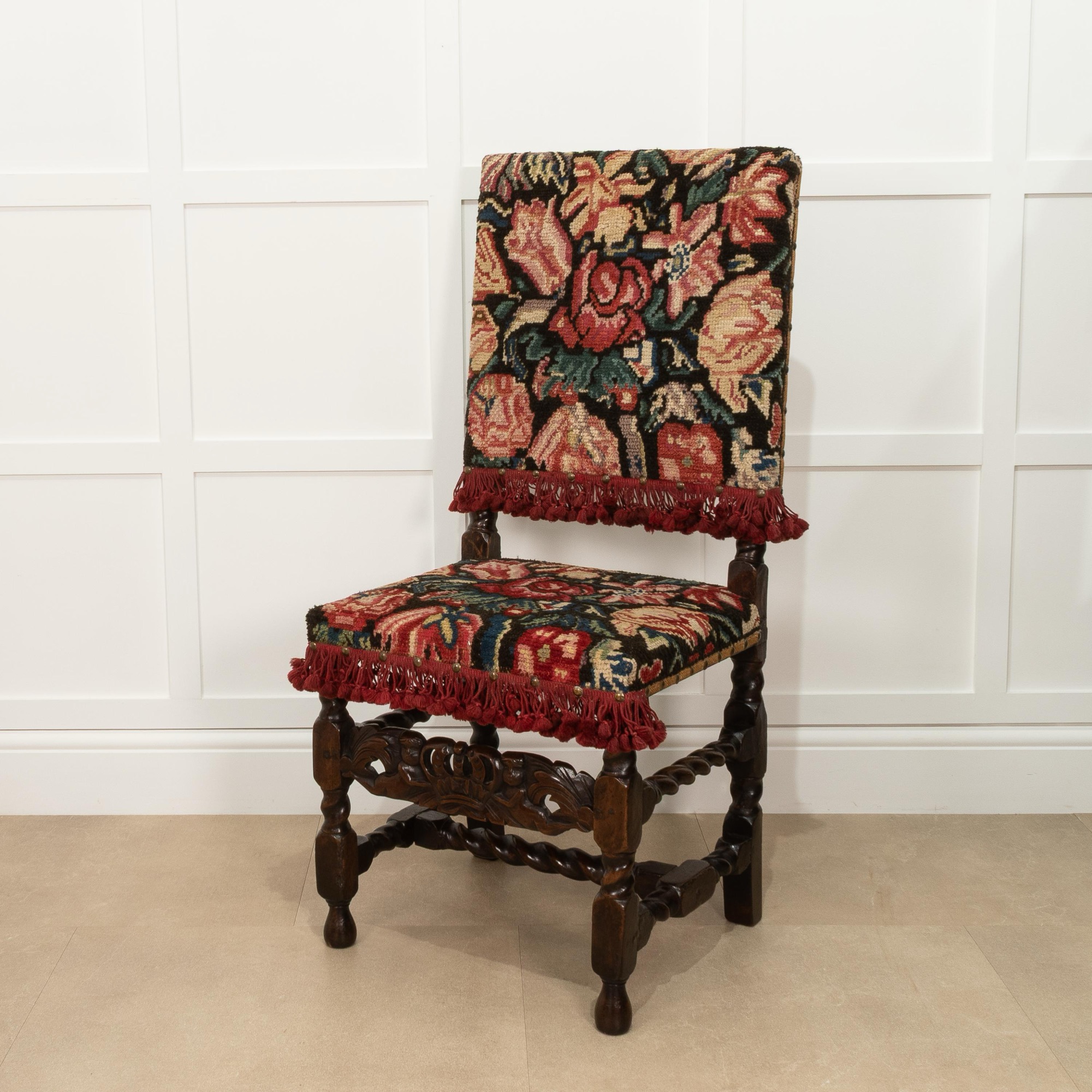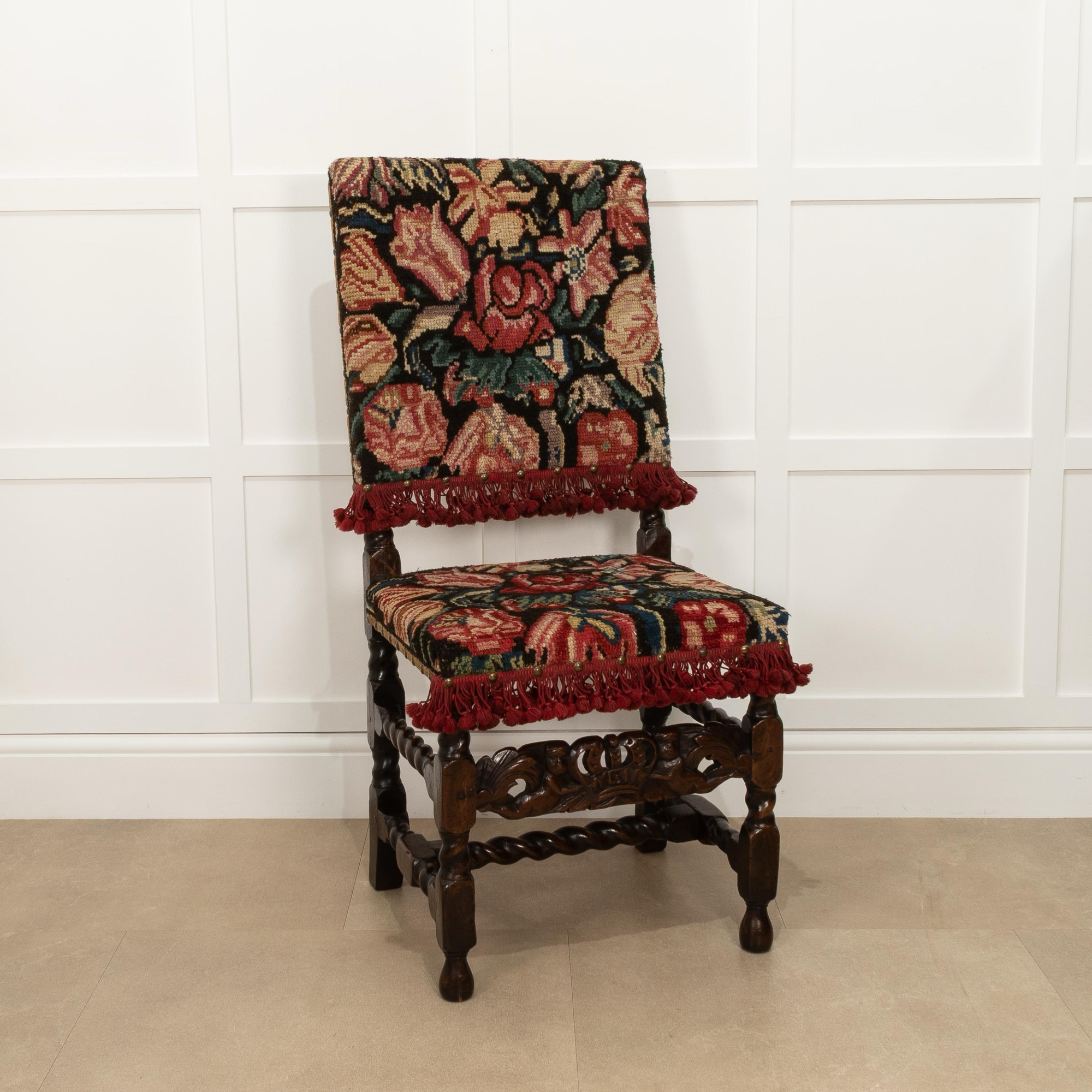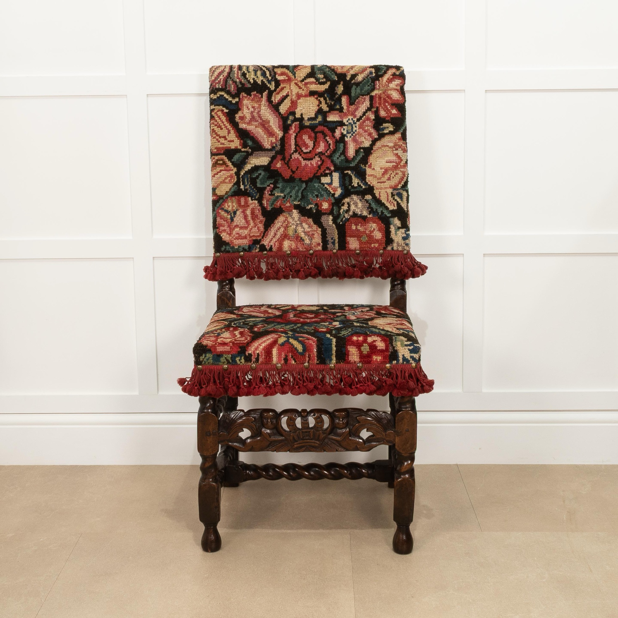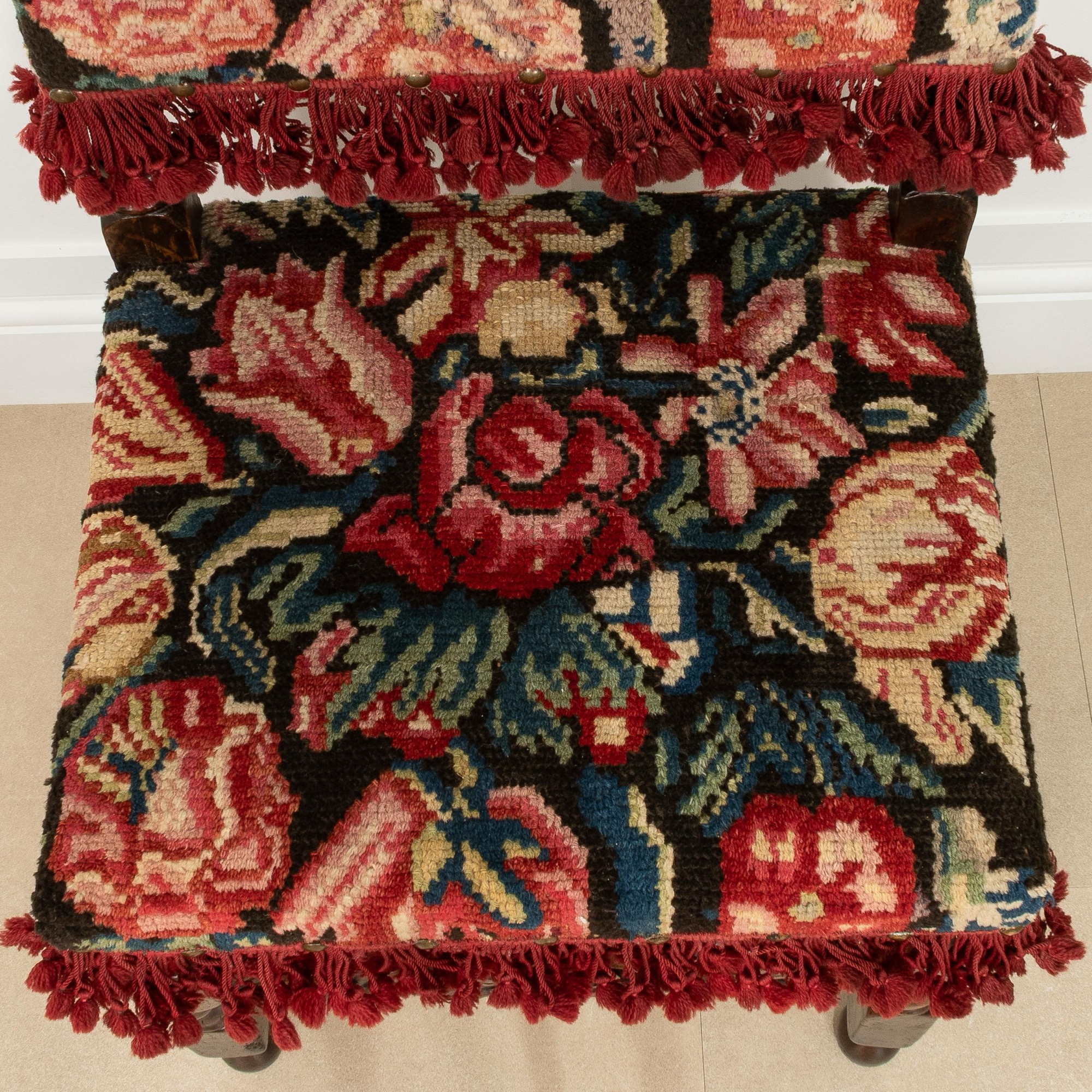 Upholstered in rare 17th century knotted wool turkeywork, on block and spiral-turned legs, joined by a crown-carved forerail and conforming turned side and low H-form stretchers