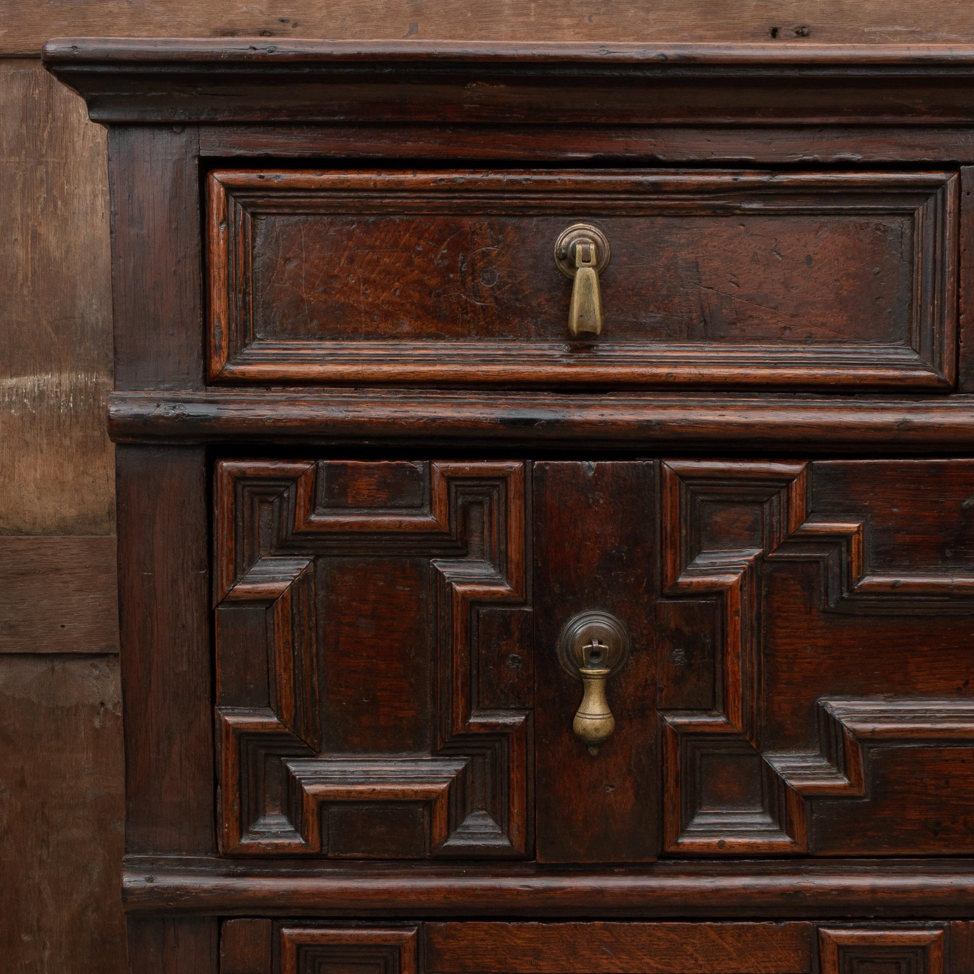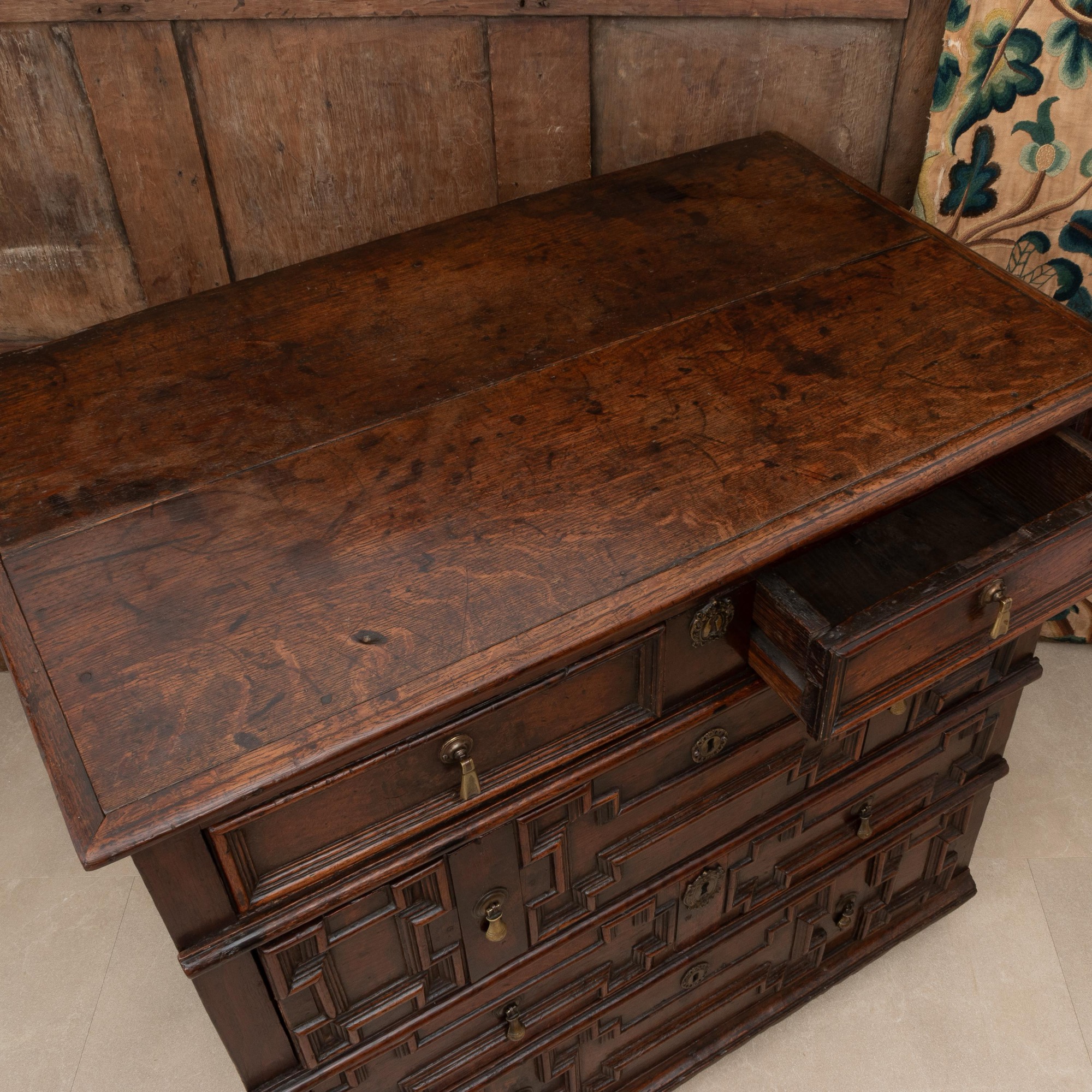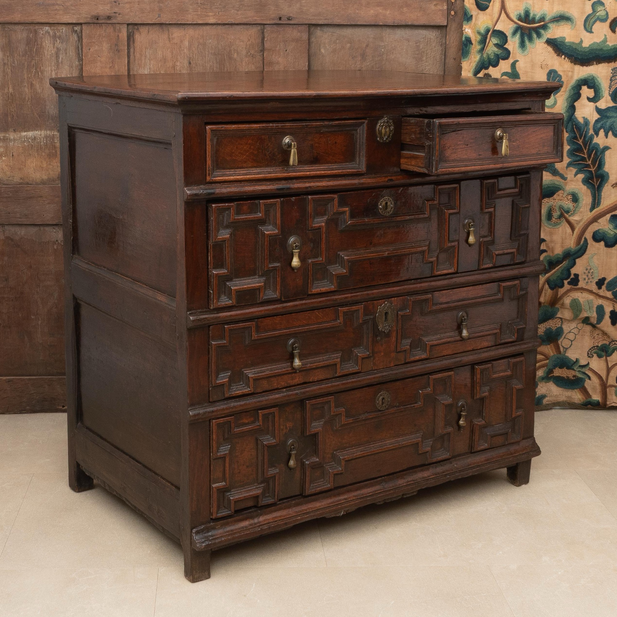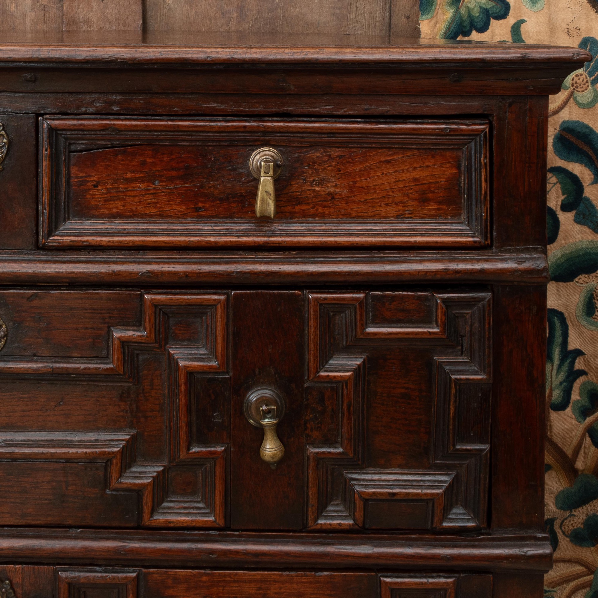The boarded top with applied moulded edge, having two short over three long drawers on extended stile supports