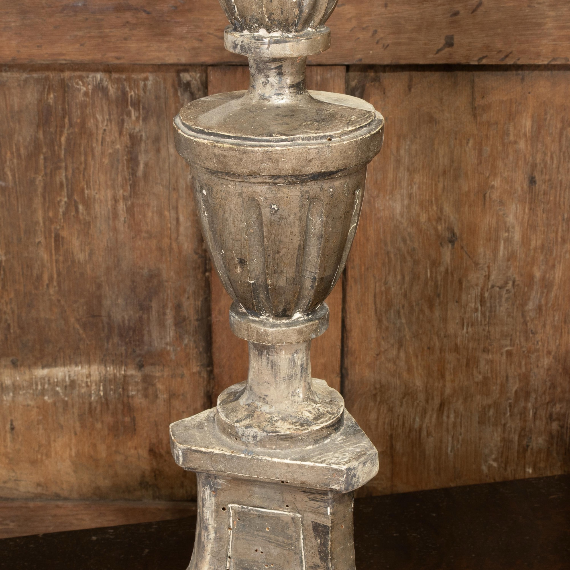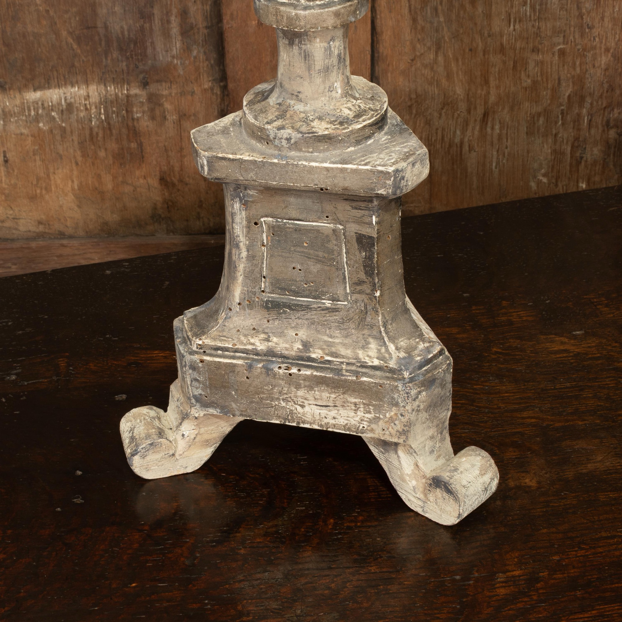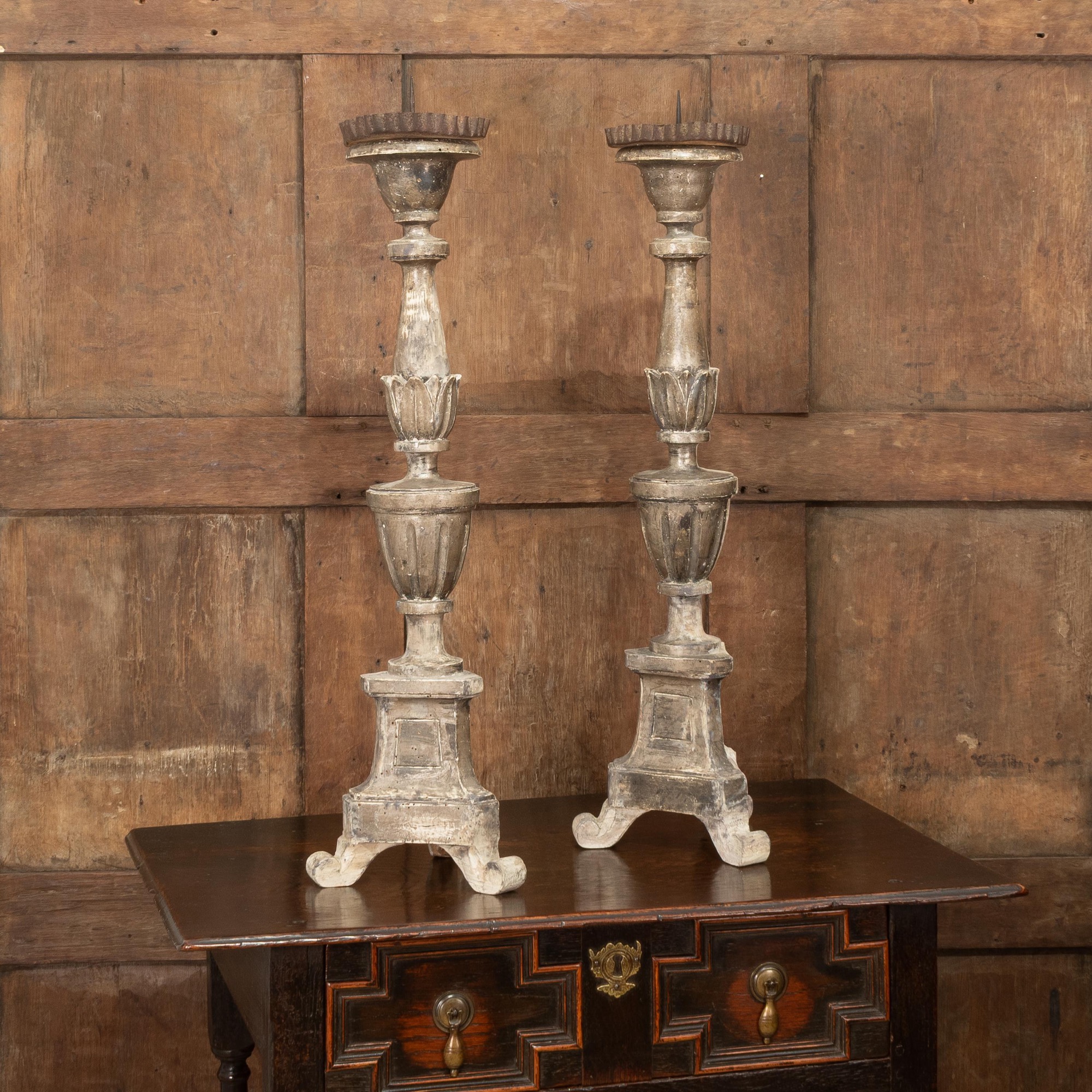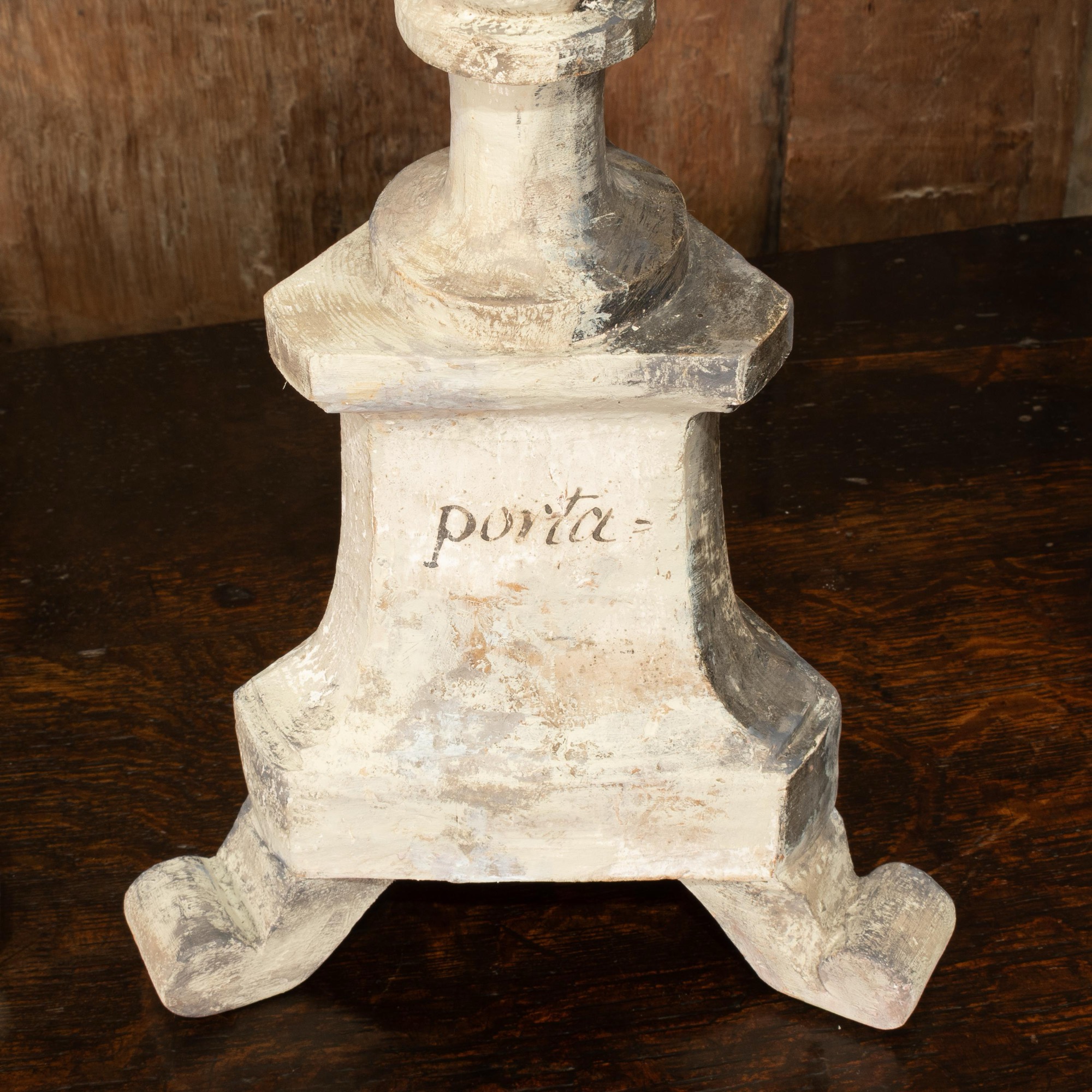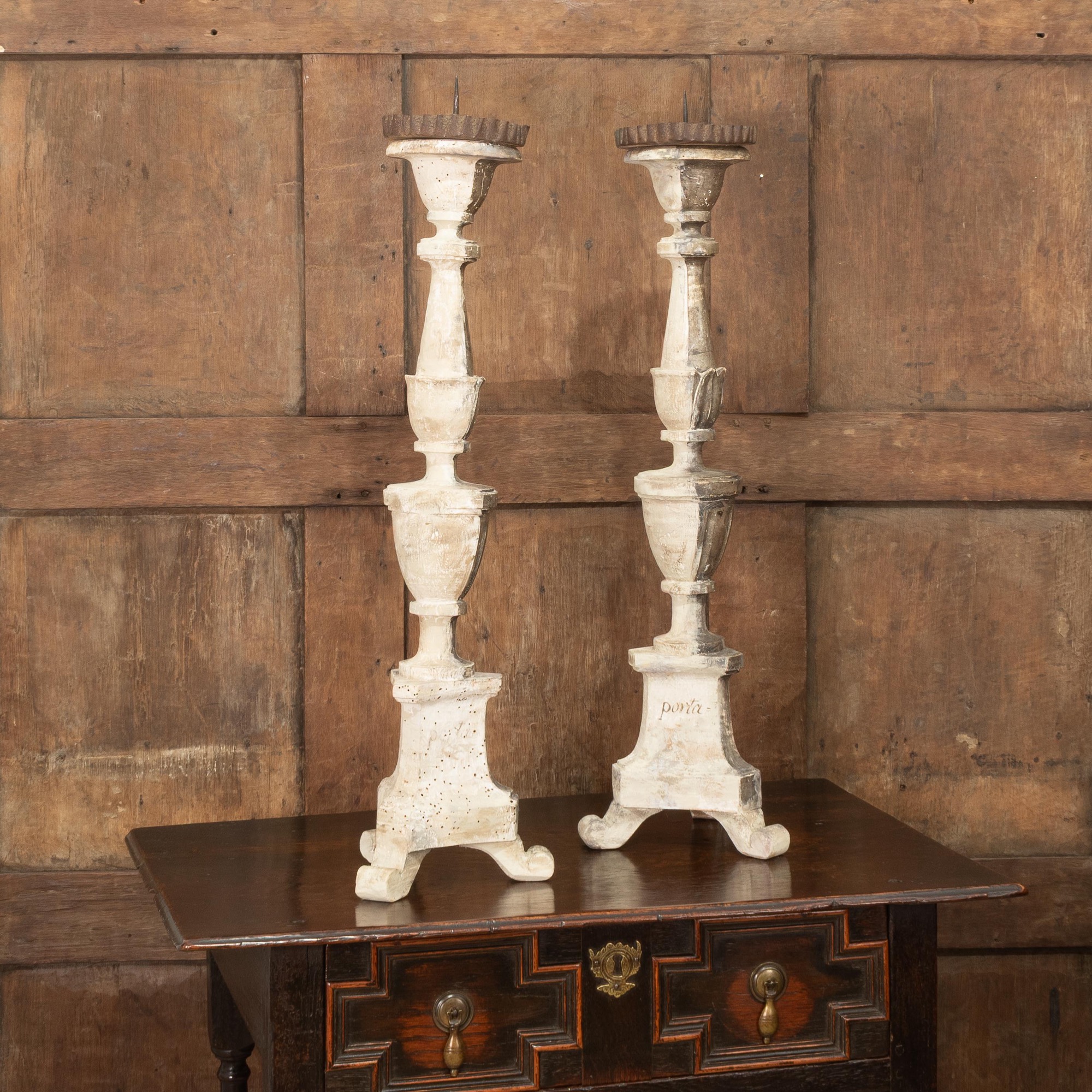 Silver-gesso and cream-painted, each with a sheet-iron crimped and circular drip-pan centred by a pricket, on turned and fluted-carved stems, the triform base inscribed 'porta' (door) on scroll feet, (2)