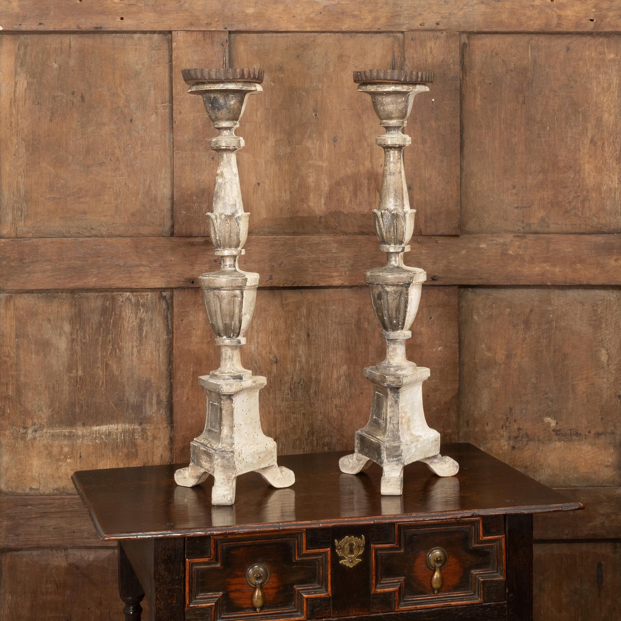 A pair of giltwood and painted pricket candlesticks, Italian, circa 1800