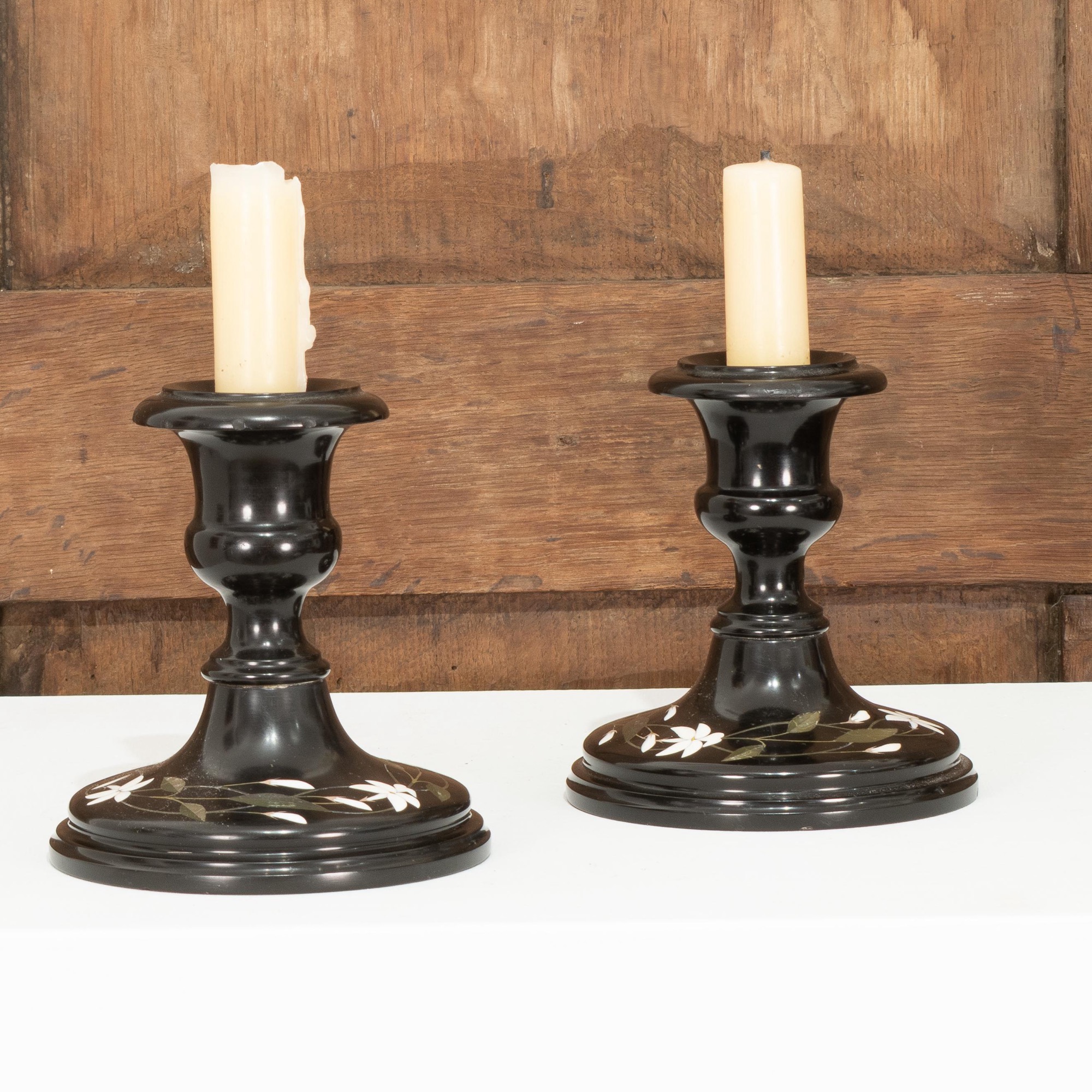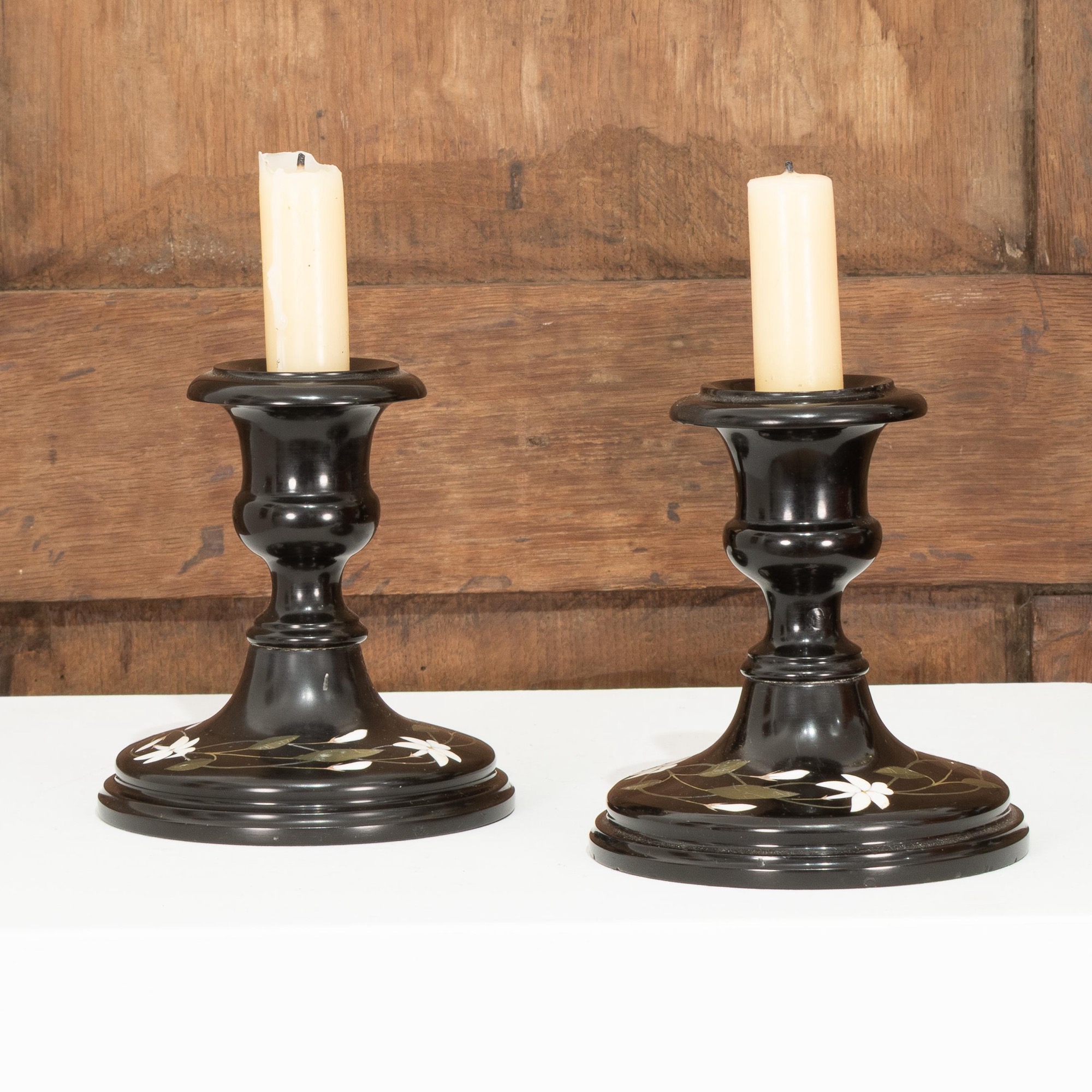 Each having a campana-shaped candle socket, short stem and spreading circular base inlaid, in the pietra dura manner, with white flowers and foliage, (2)