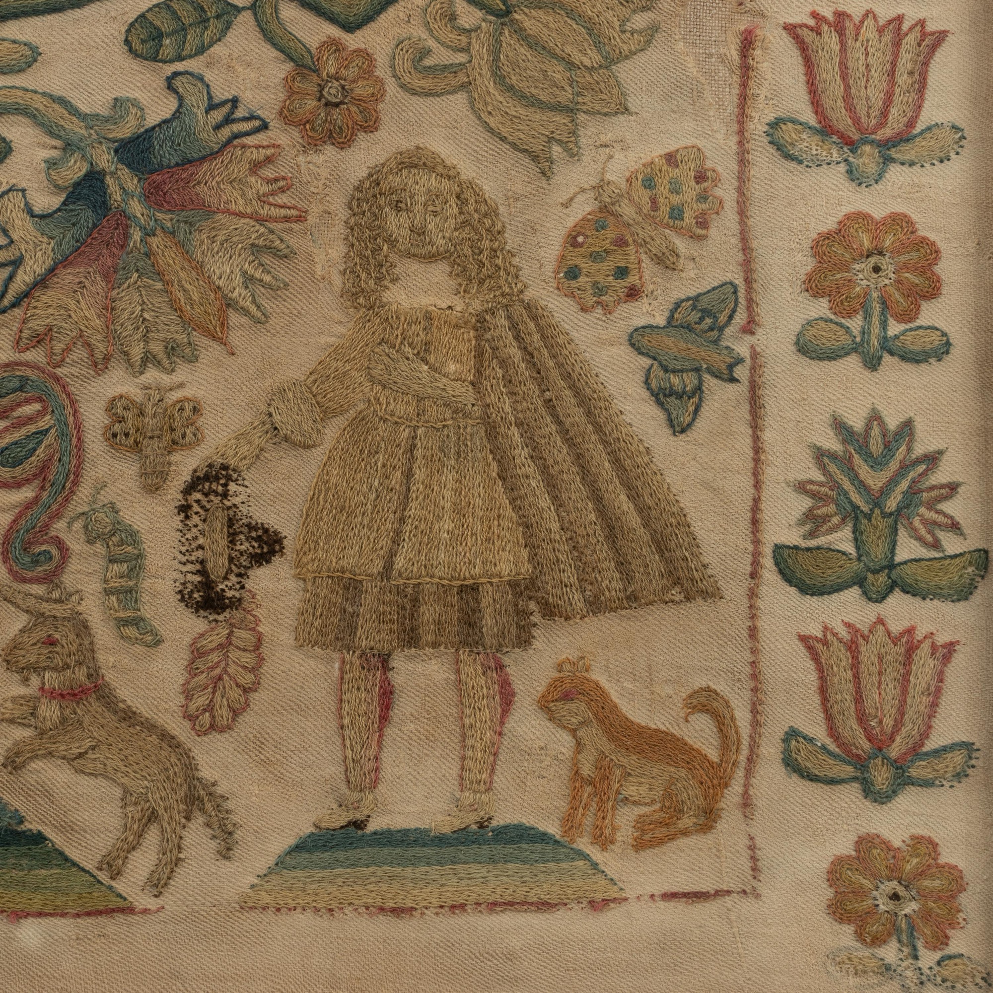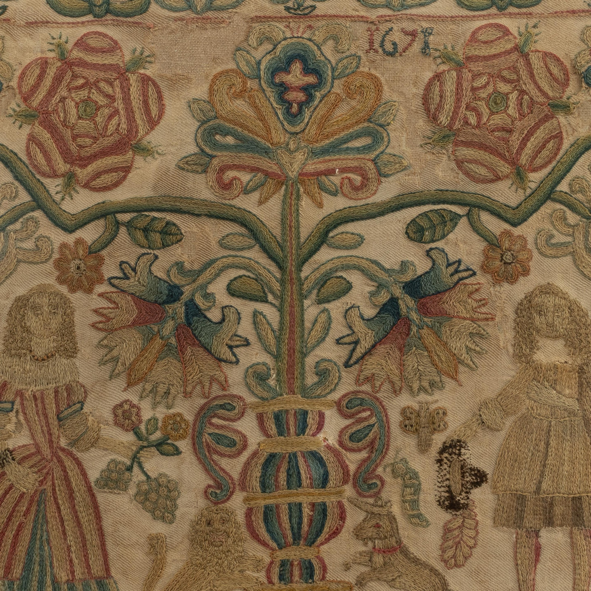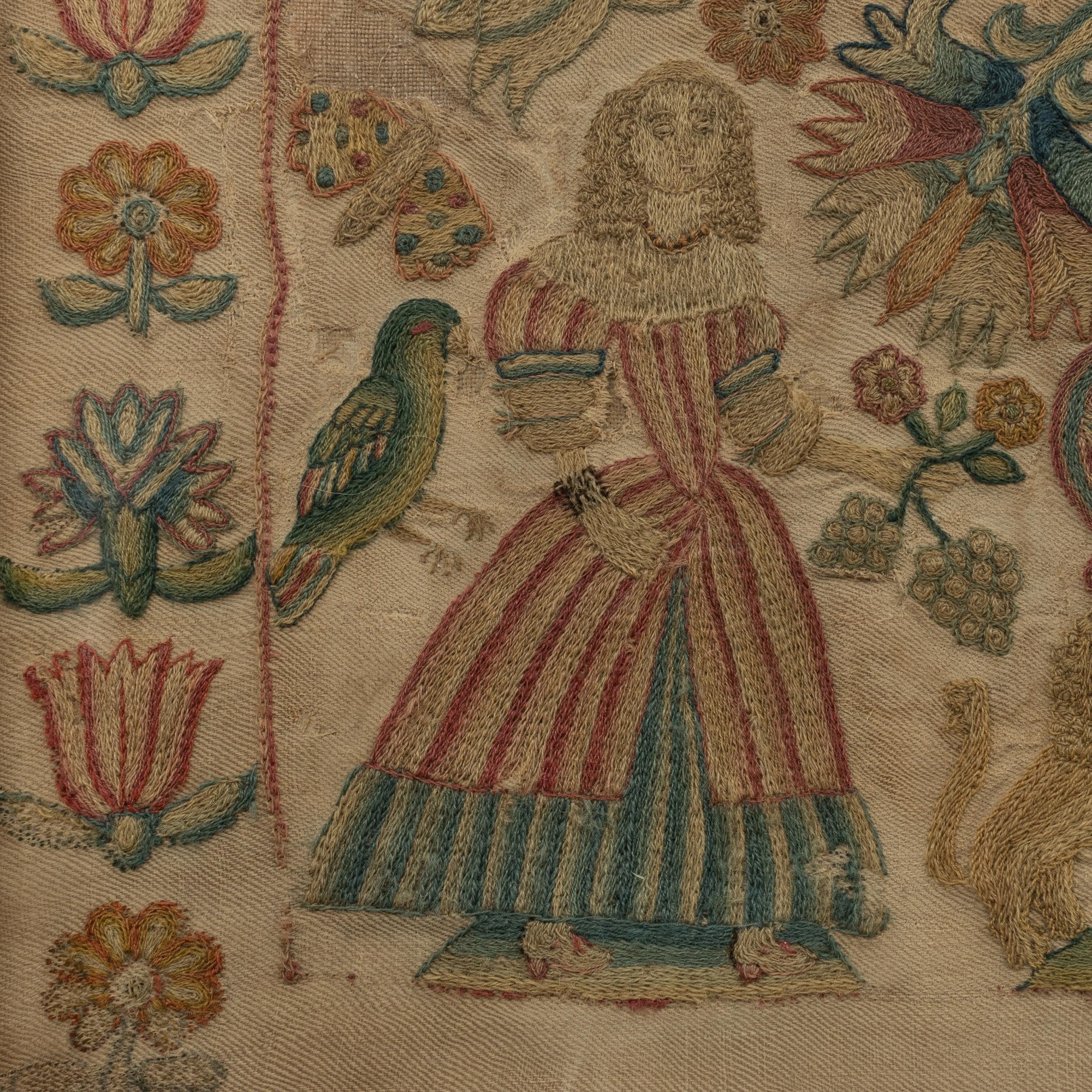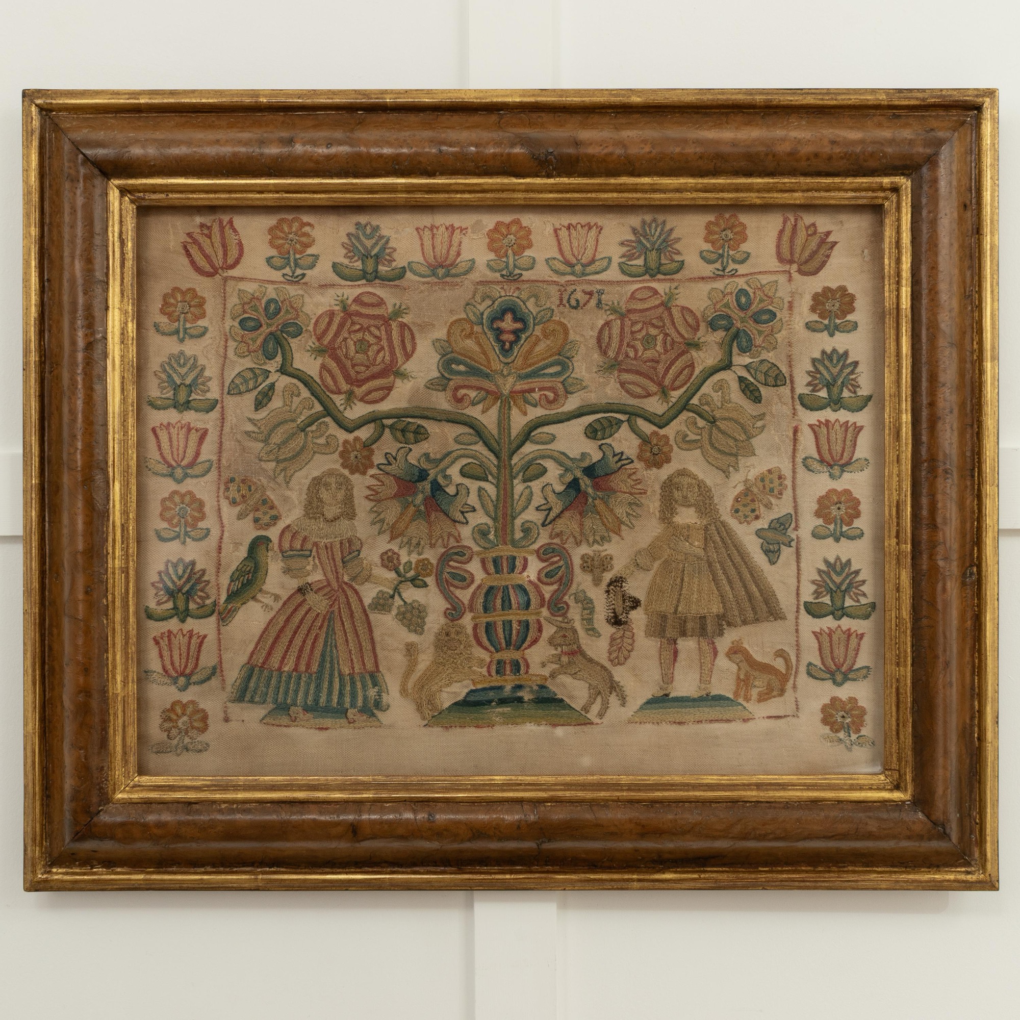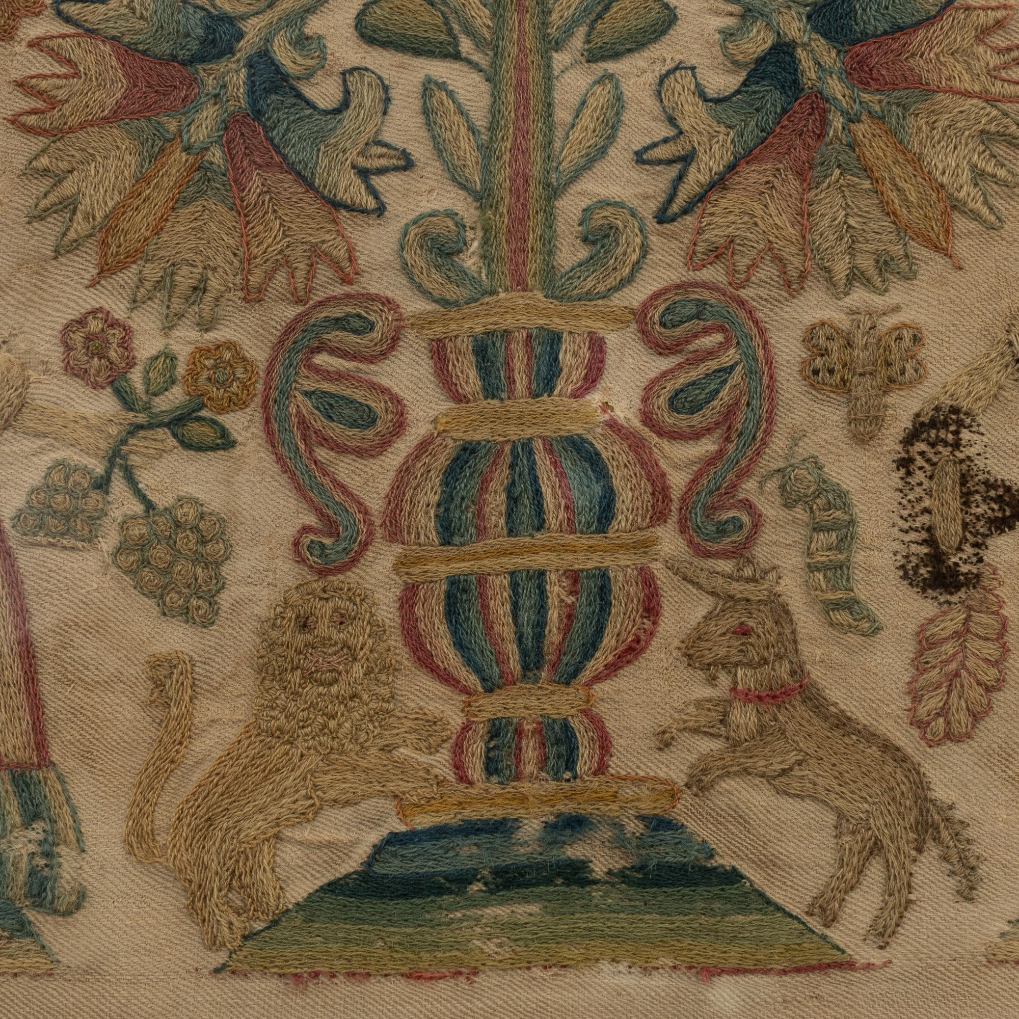 Worked in coloured wools on a linen twill ground, designed with a finely dressed couple, she holding a flowering and fruiting vine, he his feathered hat, either side an urn flanked by a lion and unicorn, the urn issuing a stylised floral 'tree of life', interspersed with a parrot, a cat or dog, butterflies and insects, the whole within a floral border, framed and glazed, dimensions include frame