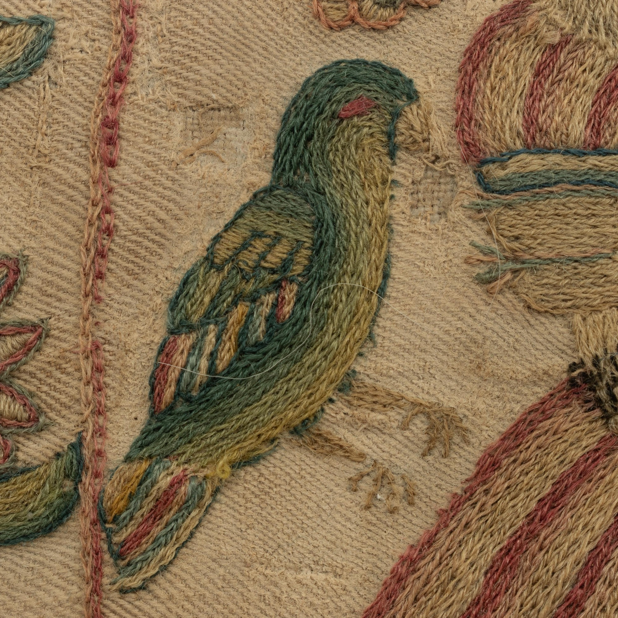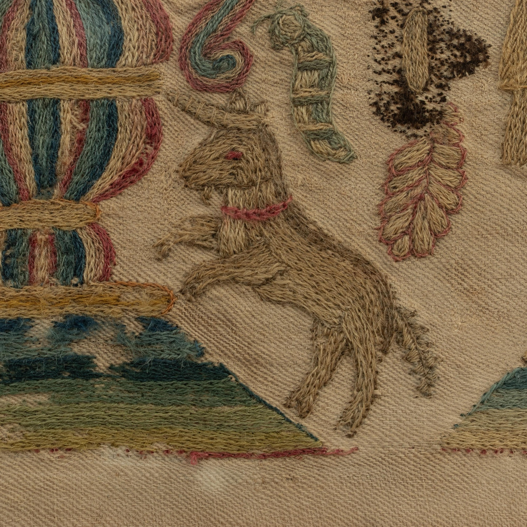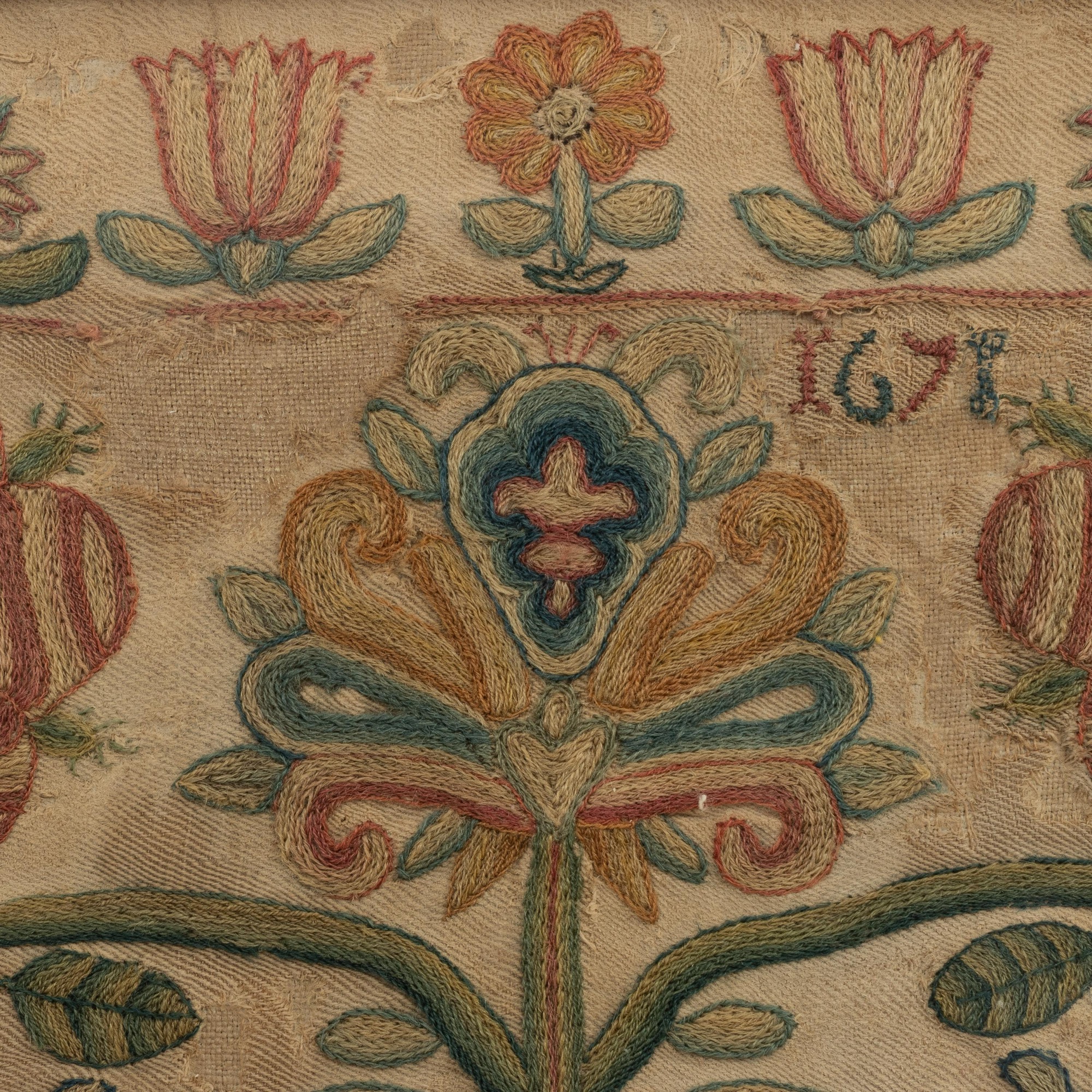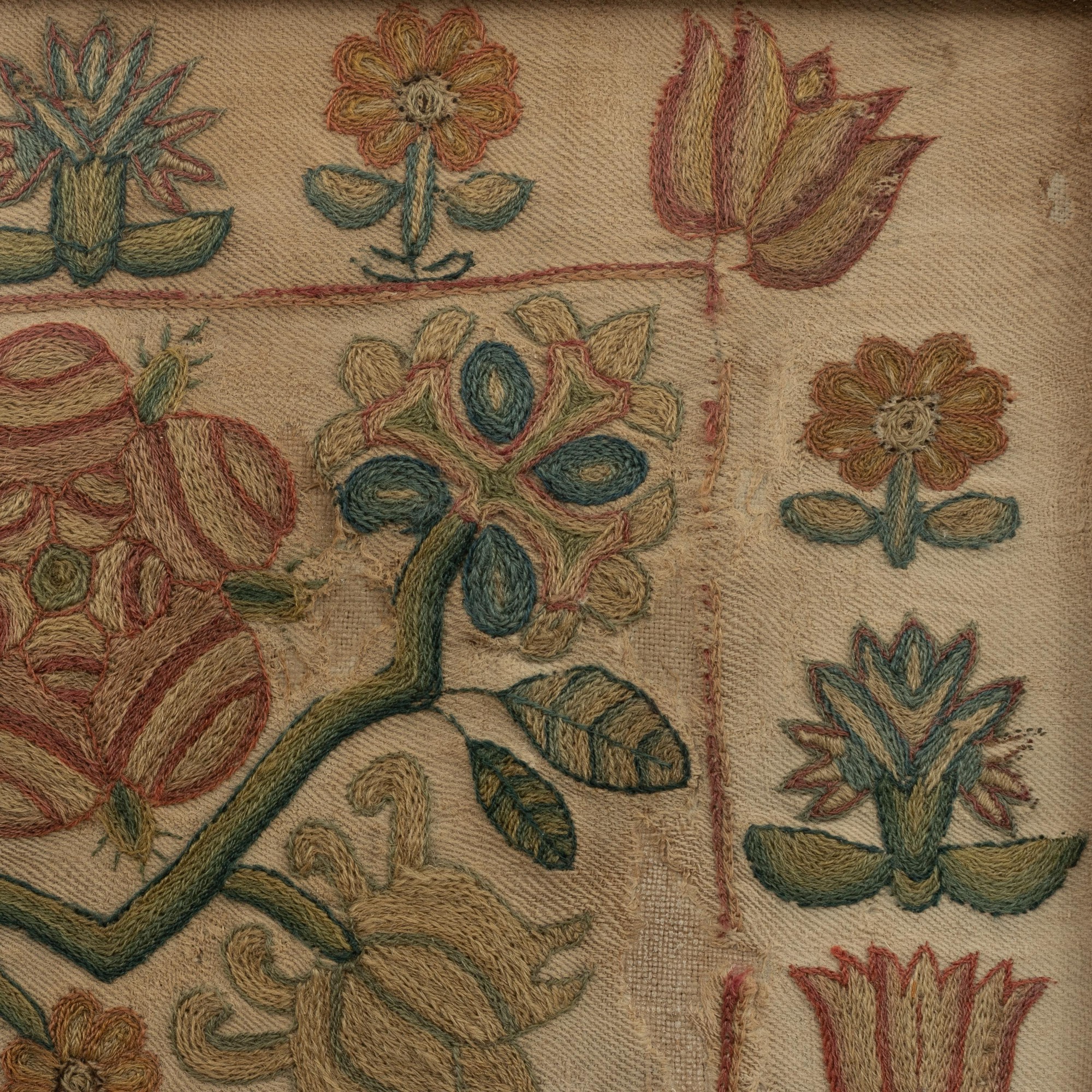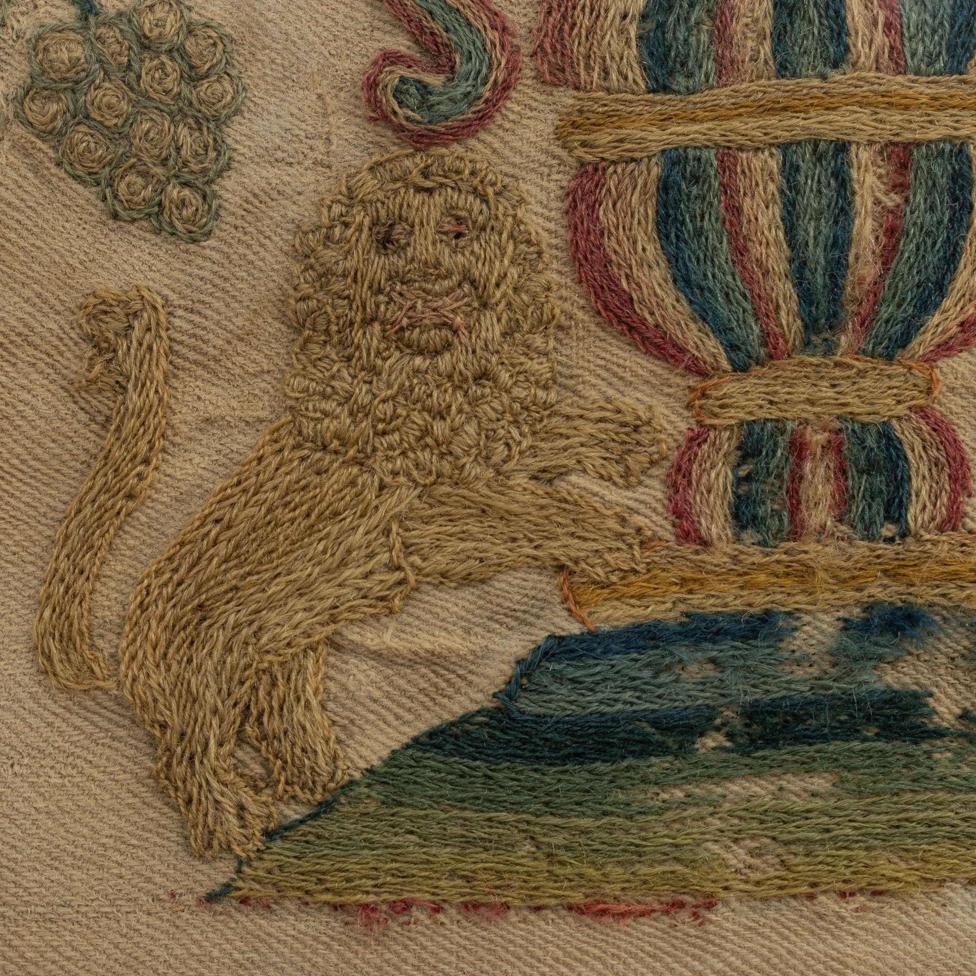 Worked in coloured wools on a linen twill ground, designed with a finely dressed couple, she holding a flowering and fruiting vine, he his feathered hat, either side an urn flanked by a lion and unicorn, the urn issuing a stylised floral 'tree of life', interspersed with a parrot, a cat or dog, butterflies and insects, the whole within a floral border, framed and glazed, dimensions include frame