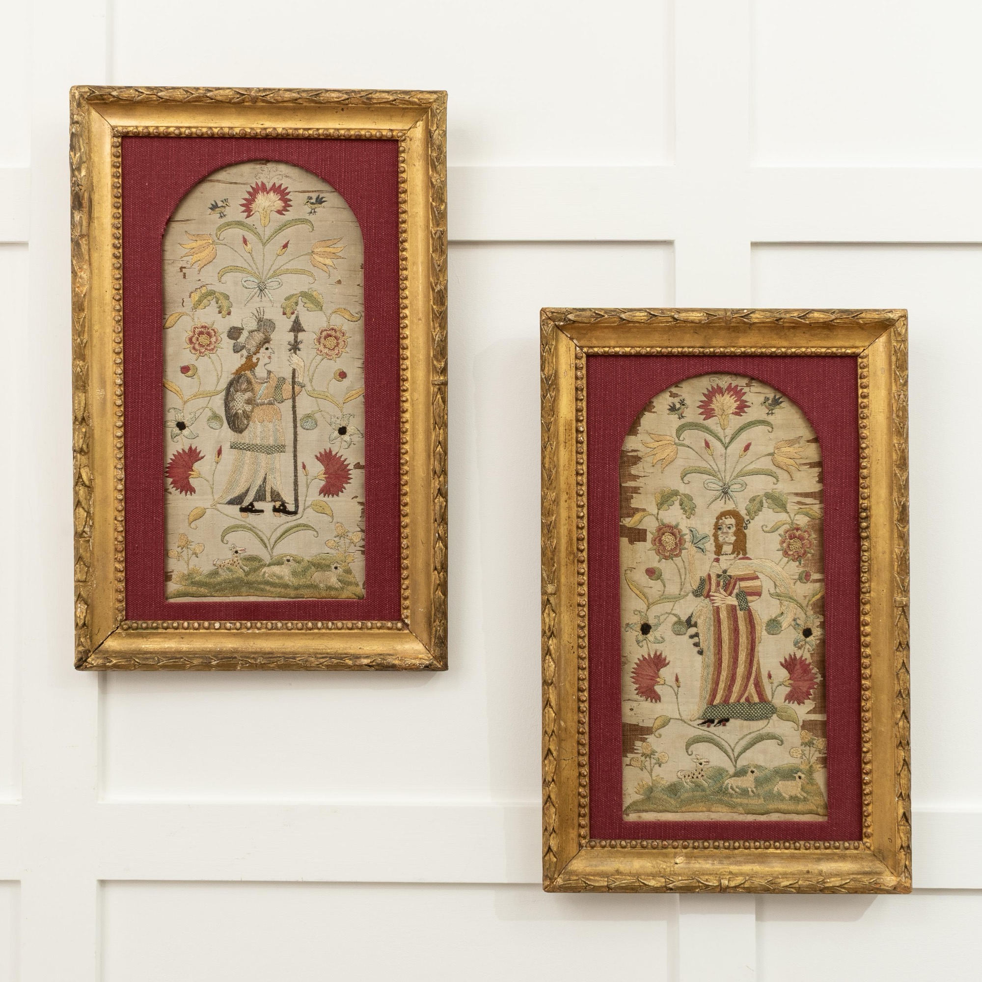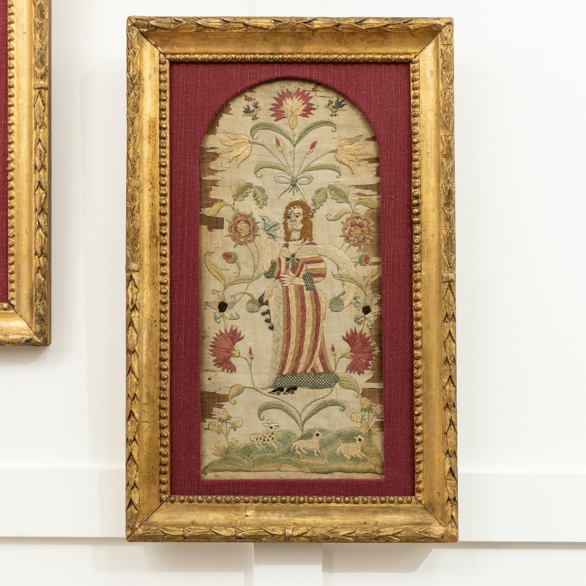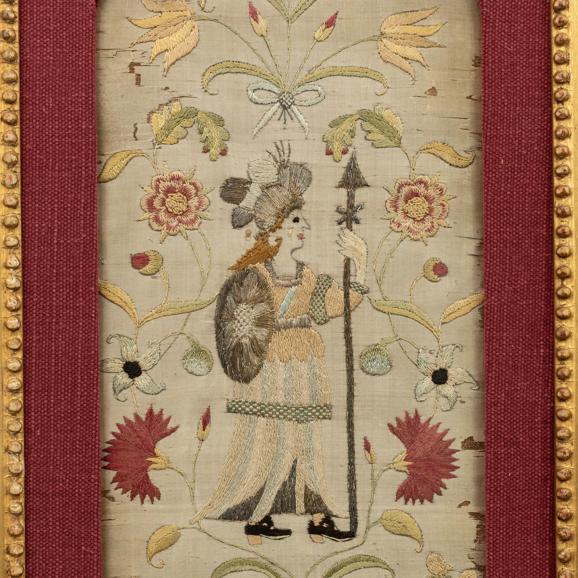 Each worked in coloured silk and metal threads on a fine cream silk ground, one designed to the centre with a female warrior holding a shield and spear, to represent Britannia, Victory or Valour, the other with a female holding a flower, representing Flora or Summer, beneath a beribboned posy flanked by birds, surrounded by meandering flower sprays issuing from grassy mounds on which stand two sheep with dogs, glazed and with arched linen-covered mounts within giltwood frames, (2), dimensions include frame