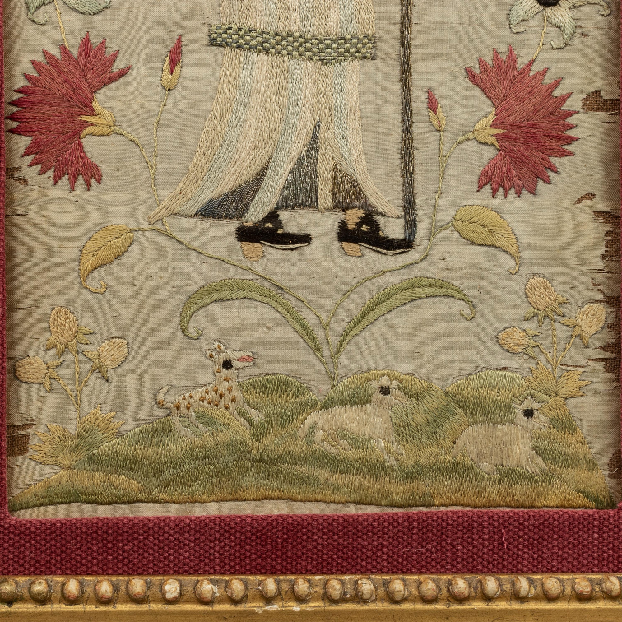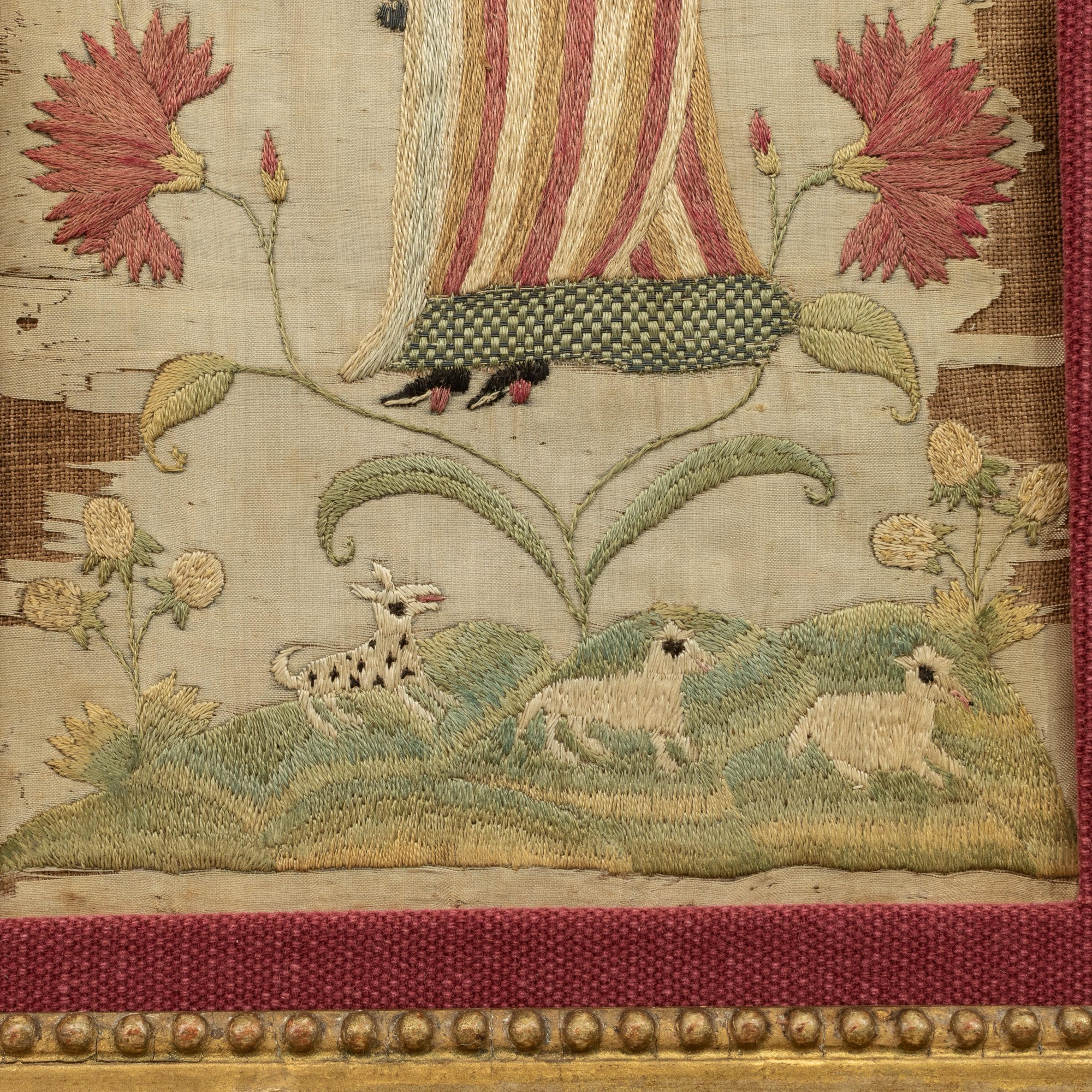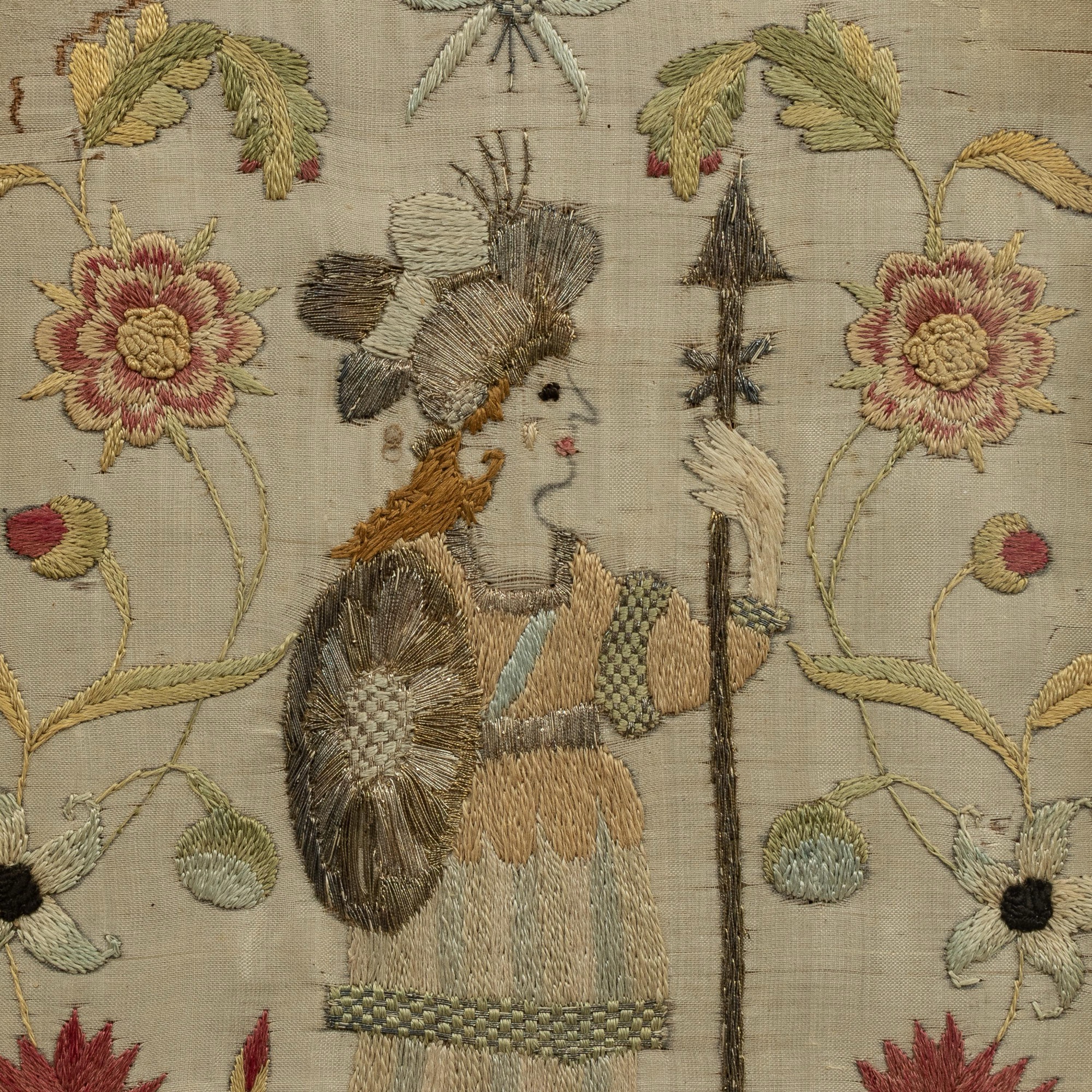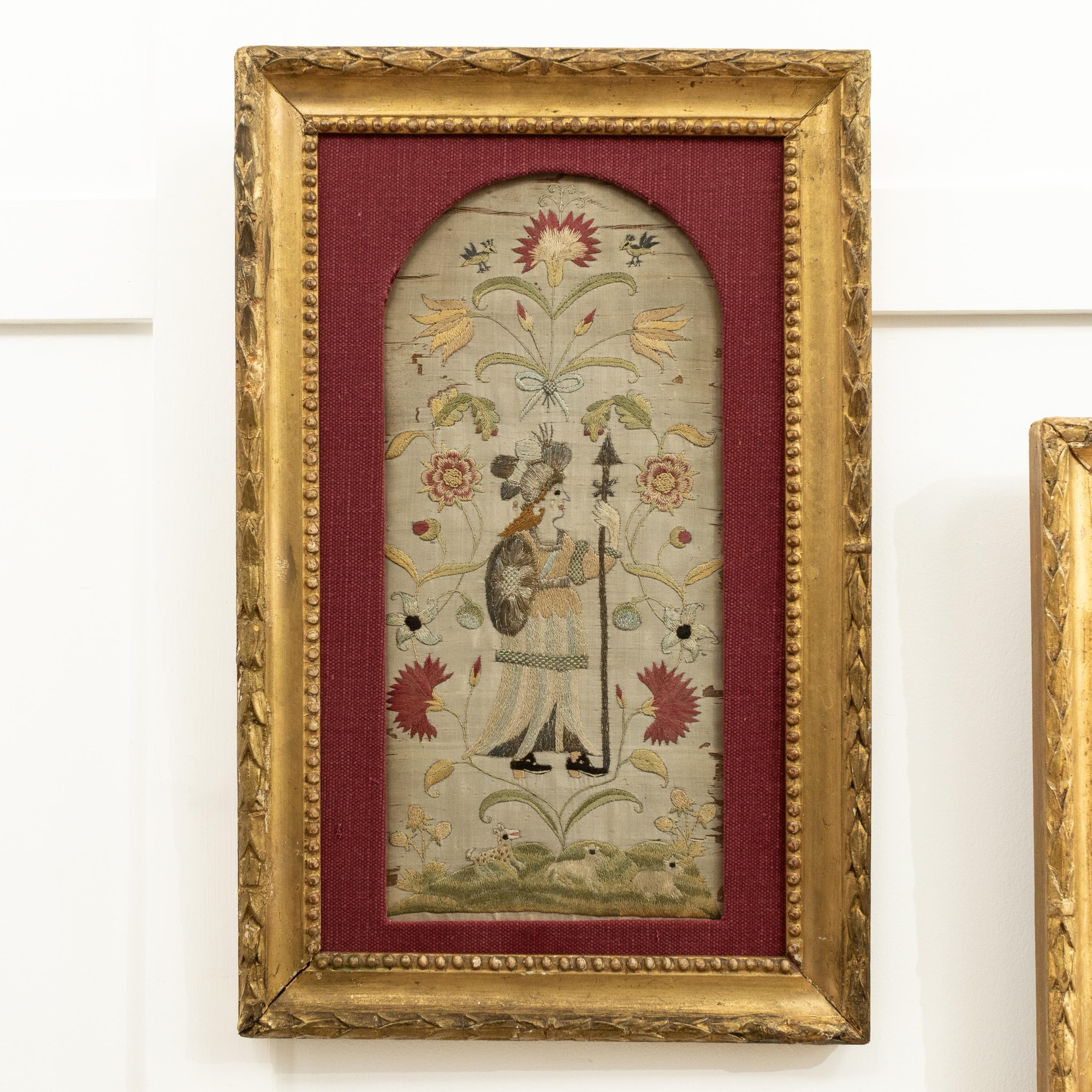 Each worked in coloured silk and metal threads on a fine cream silk ground, one designed to the centre with a female warrior holding a shield and spear, to represent Britannia, Victory or Valour, the other with a female holding a flower, representing Flora or Summer, beneath a beribboned posy flanked by birds, surrounded by meandering flower sprays issuing from grassy mounds on which stand two sheep with dogs, glazed and with arched linen-covered mounts within giltwood frames, (2), dimensions include frame