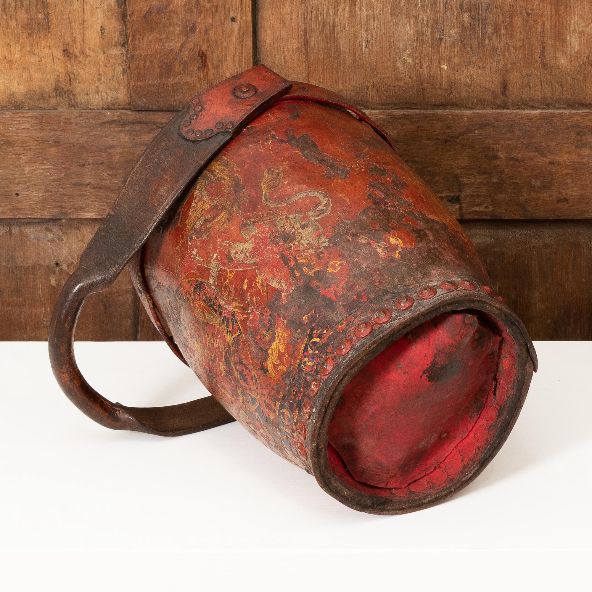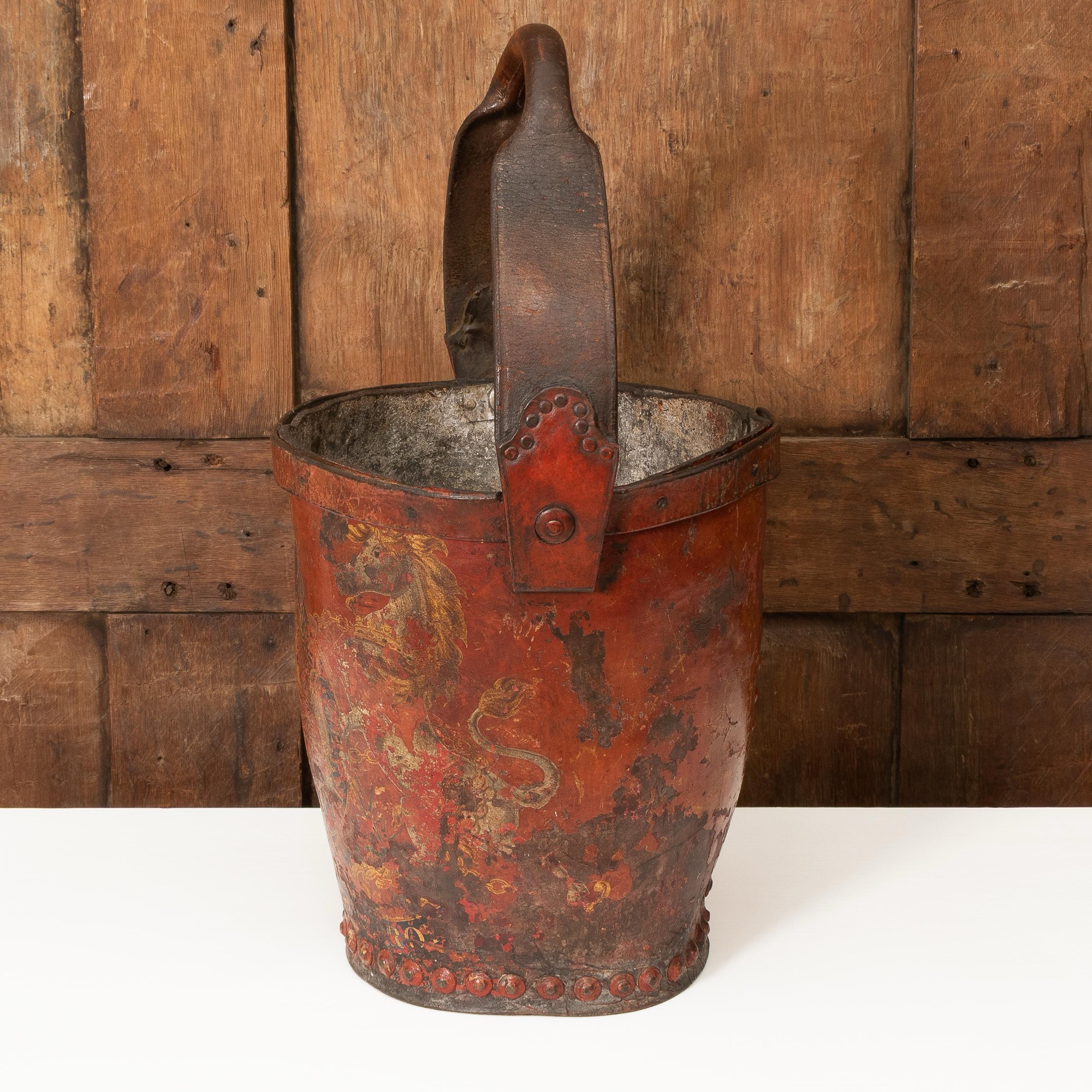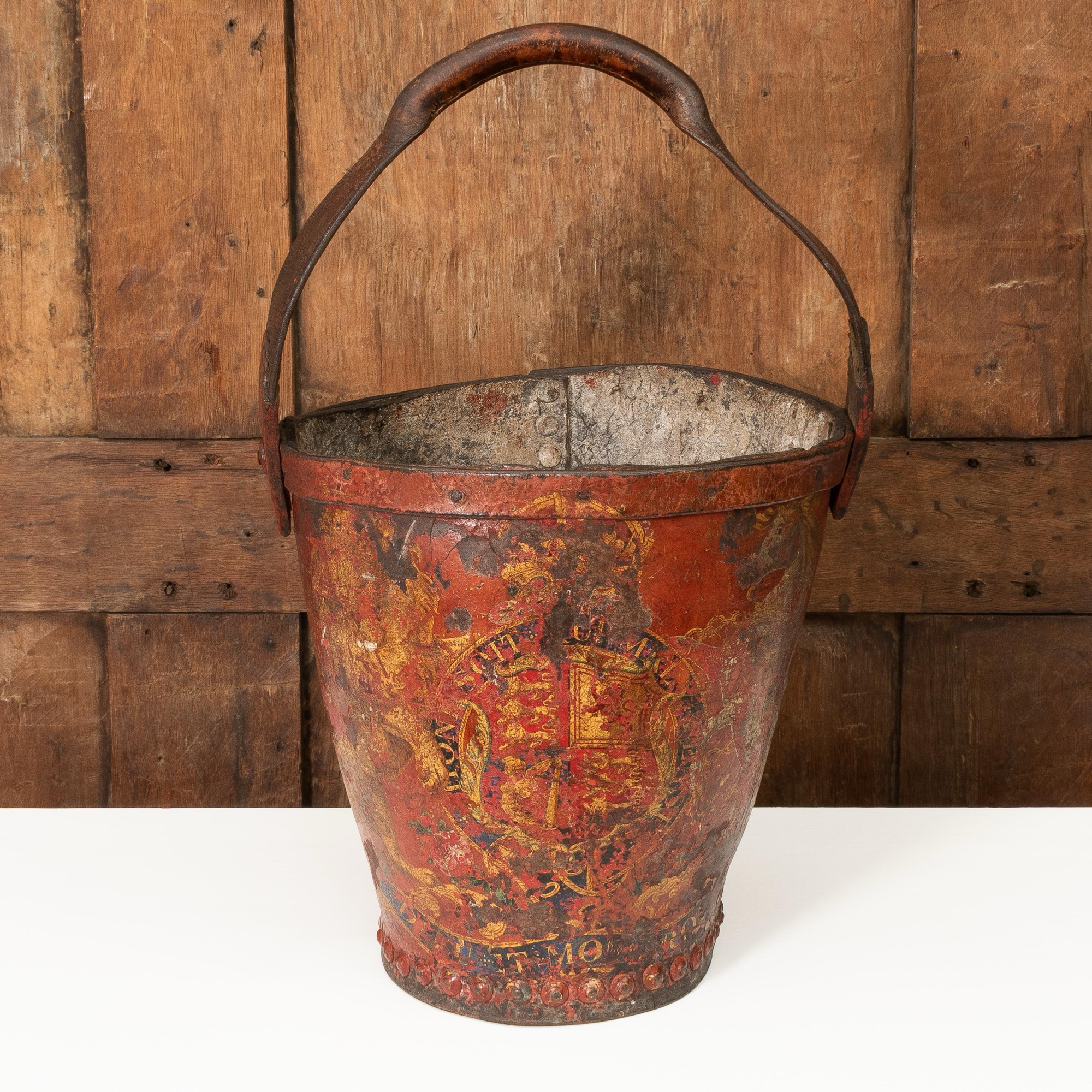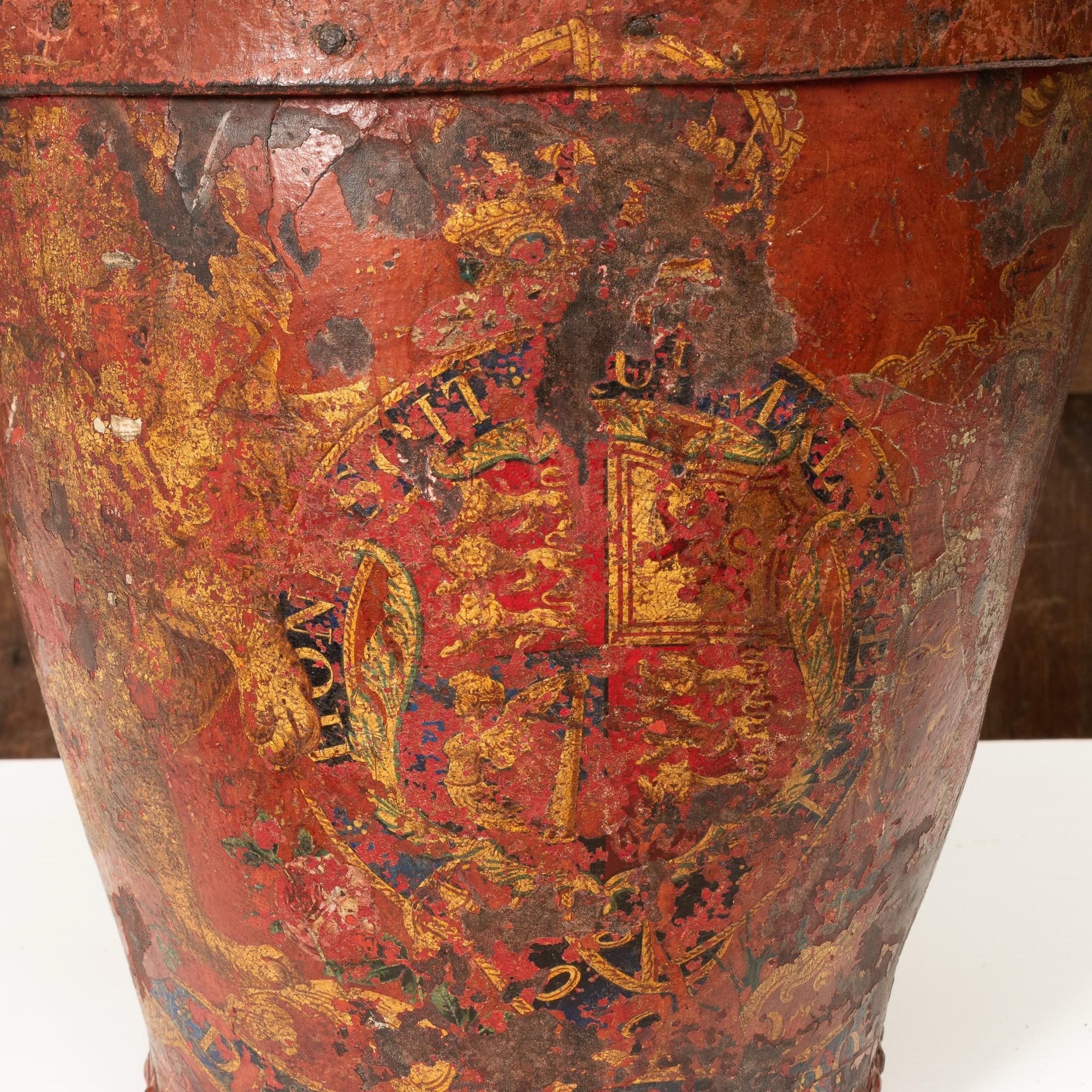 The tapering body polychrome-painted with the Royal Coat of Arms, close-nailed base, leather strap swing-handle