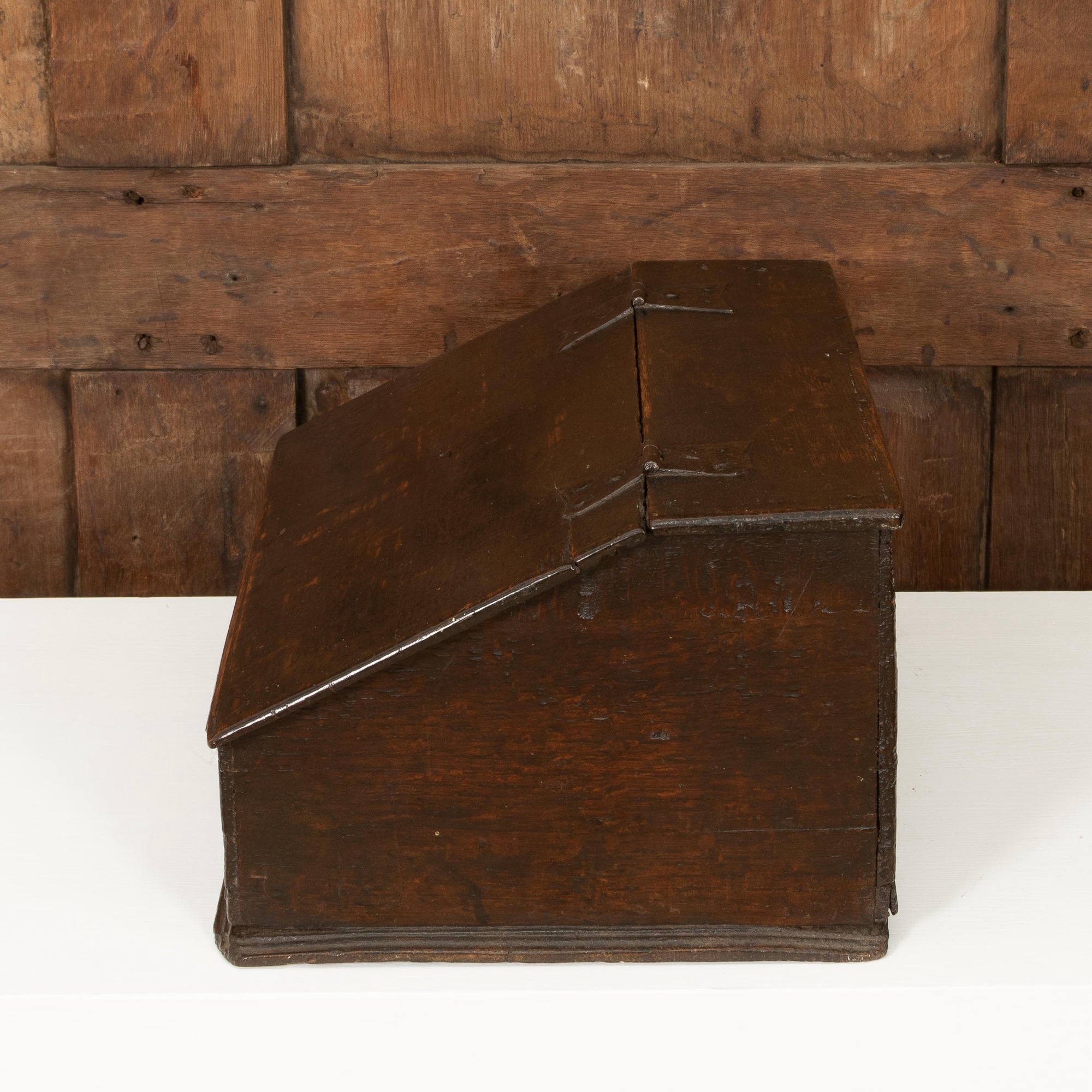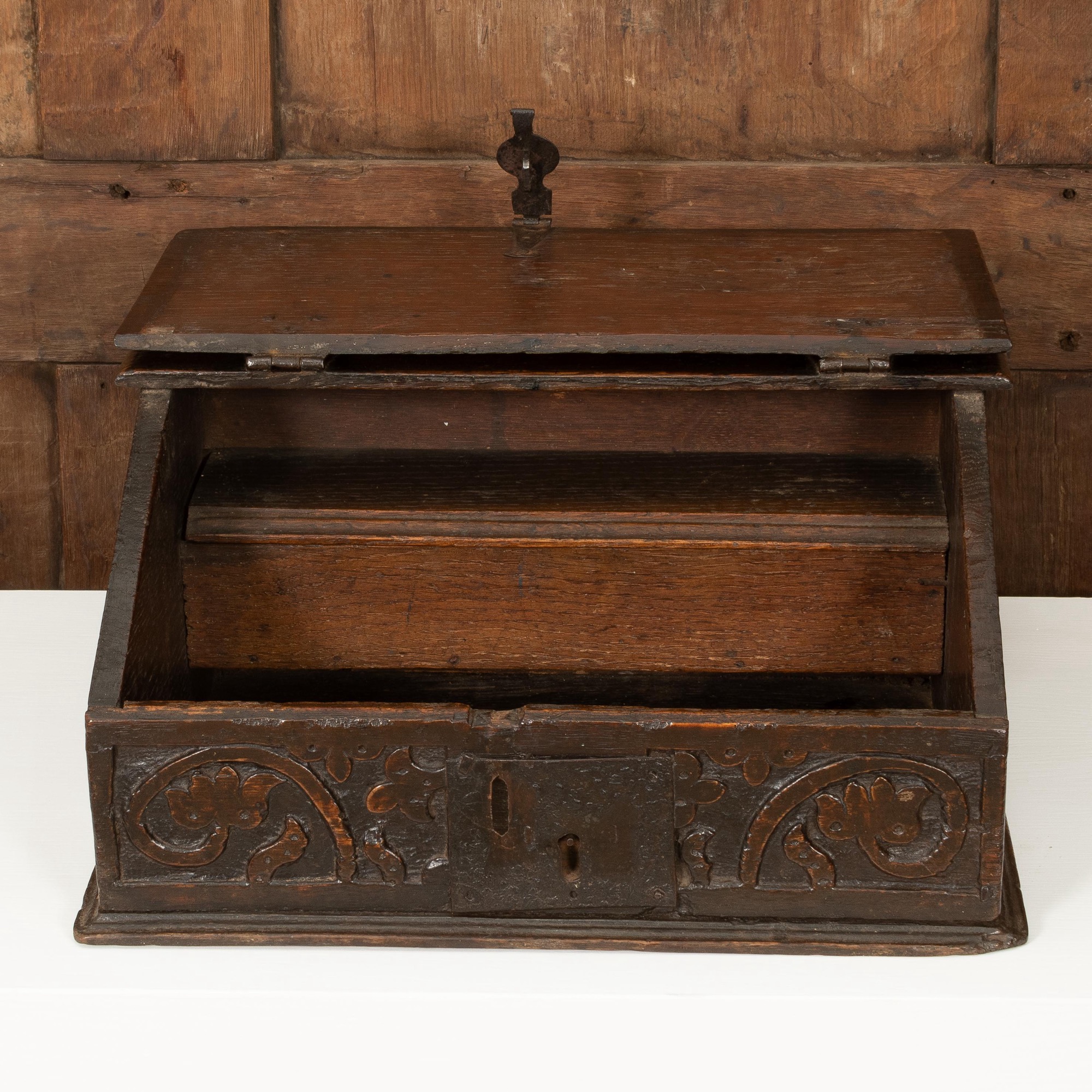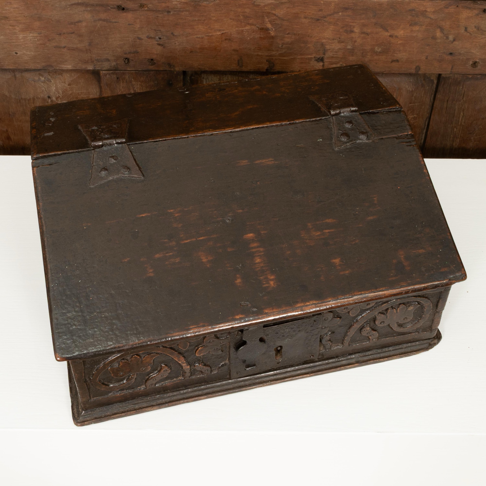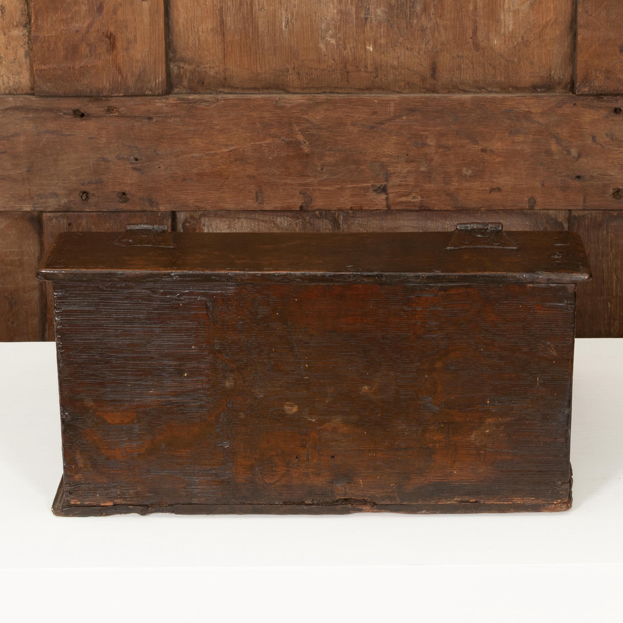 An exceptionally small Charles II boarded oak table desk box, North Country, circa 1660