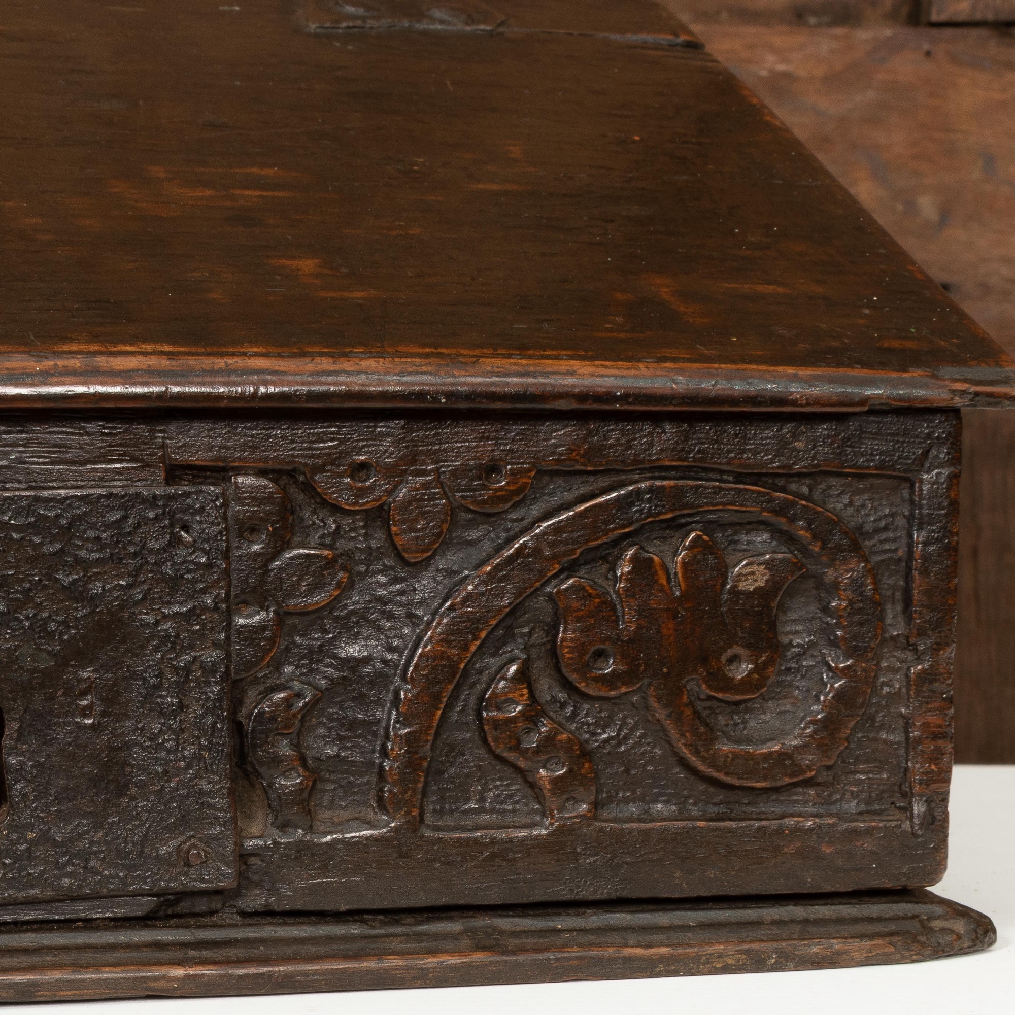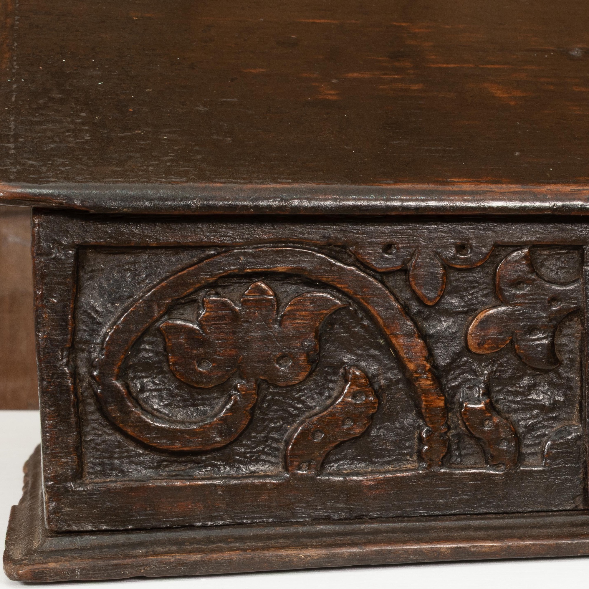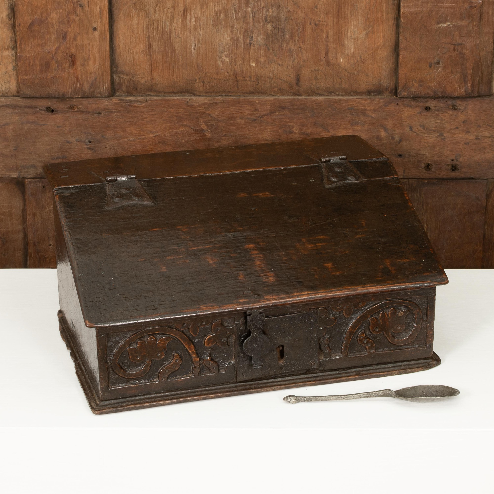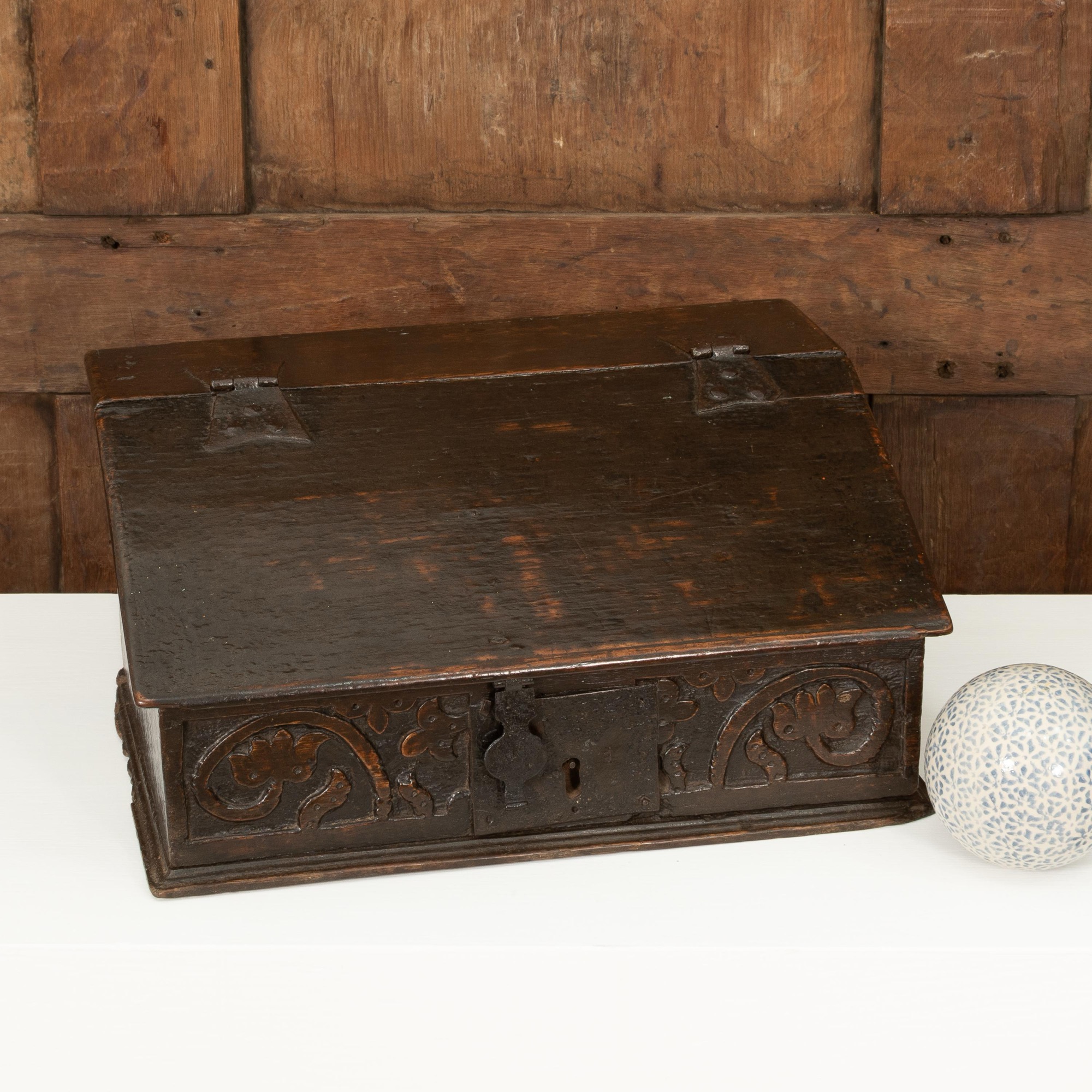An exceptionally small Charles II boarded oak table desk box, North Country, circa 1660
