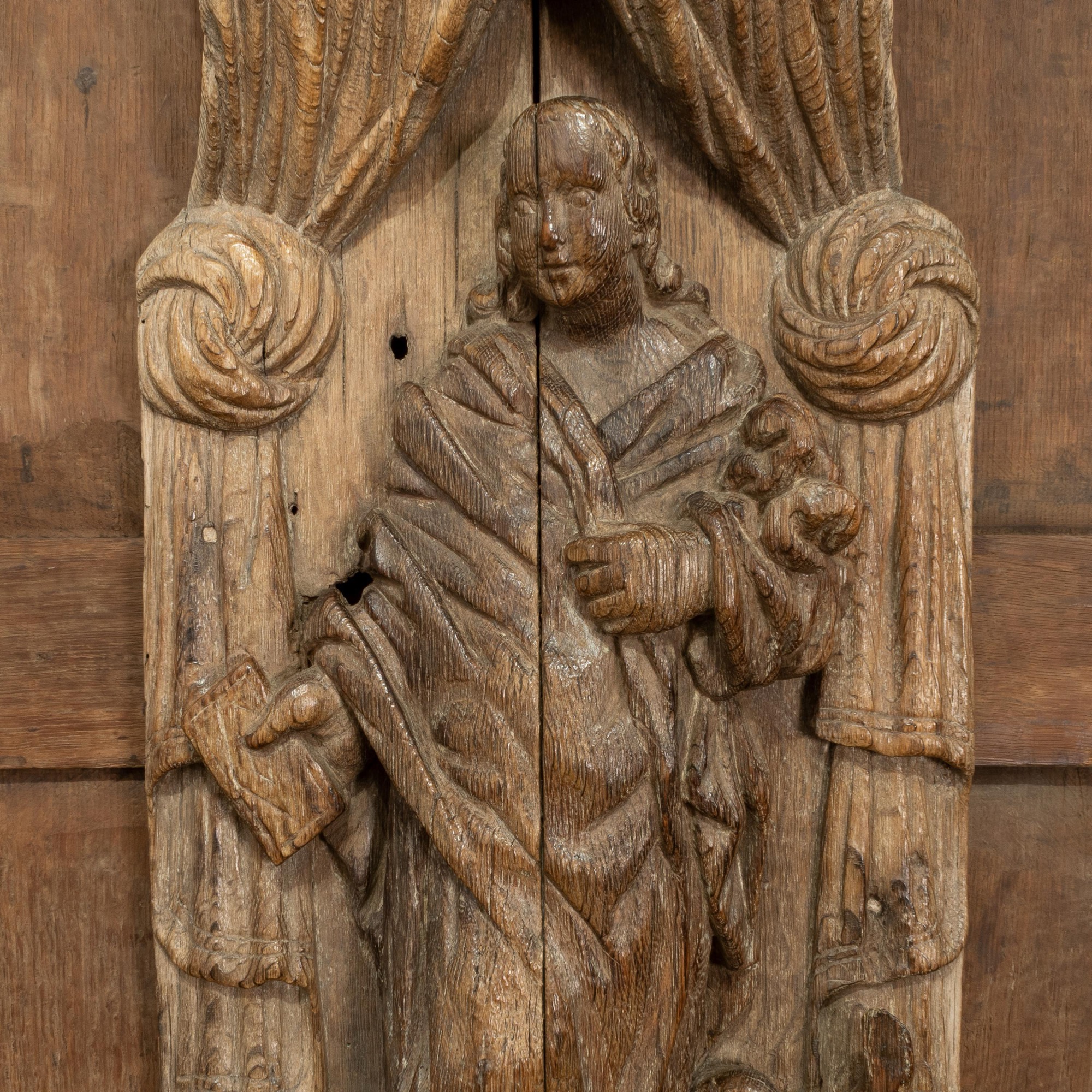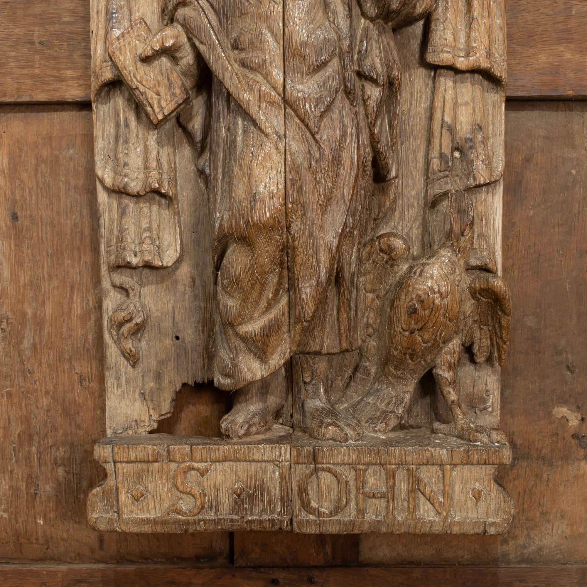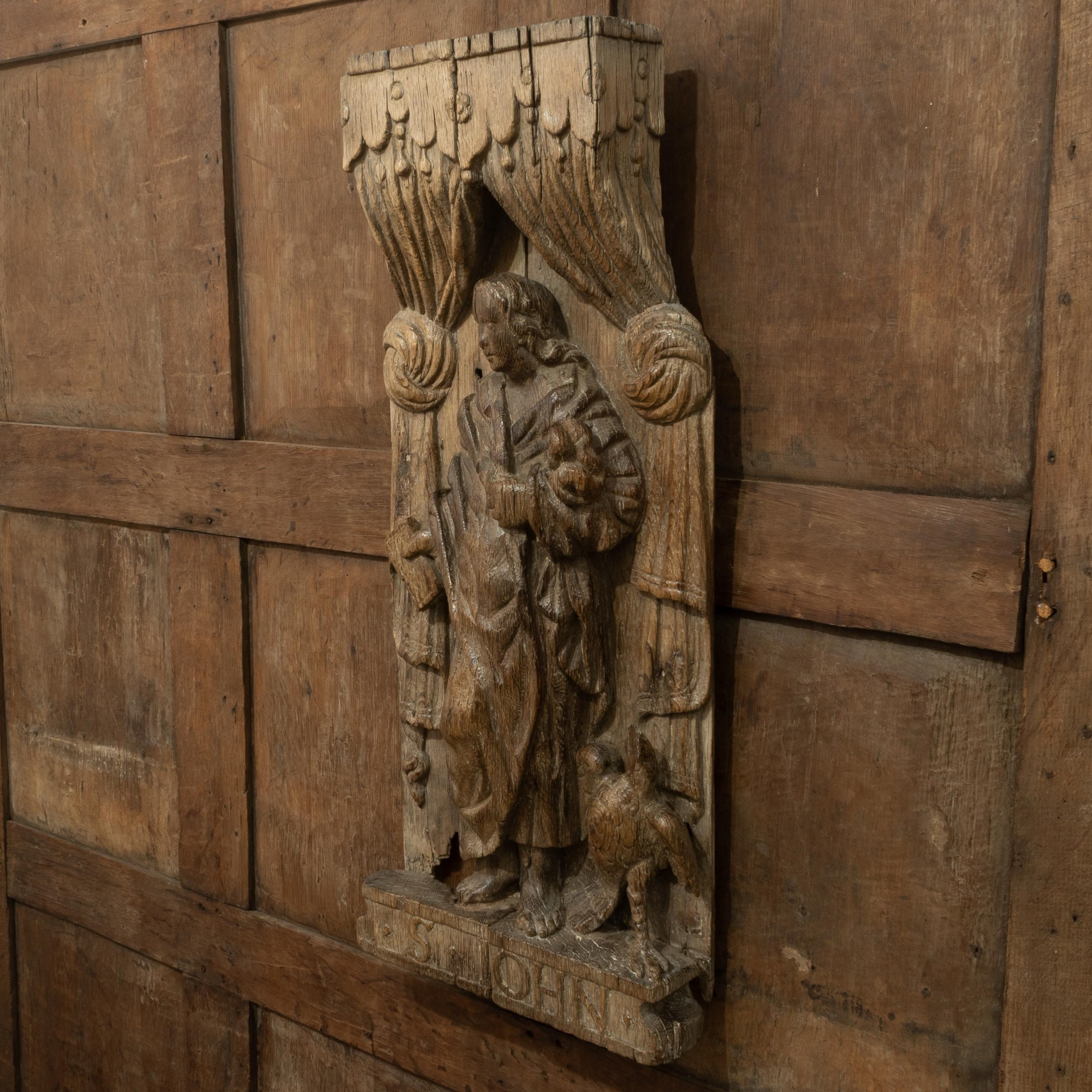 A carved oak panel depicting St. John, English, circa 1500-70