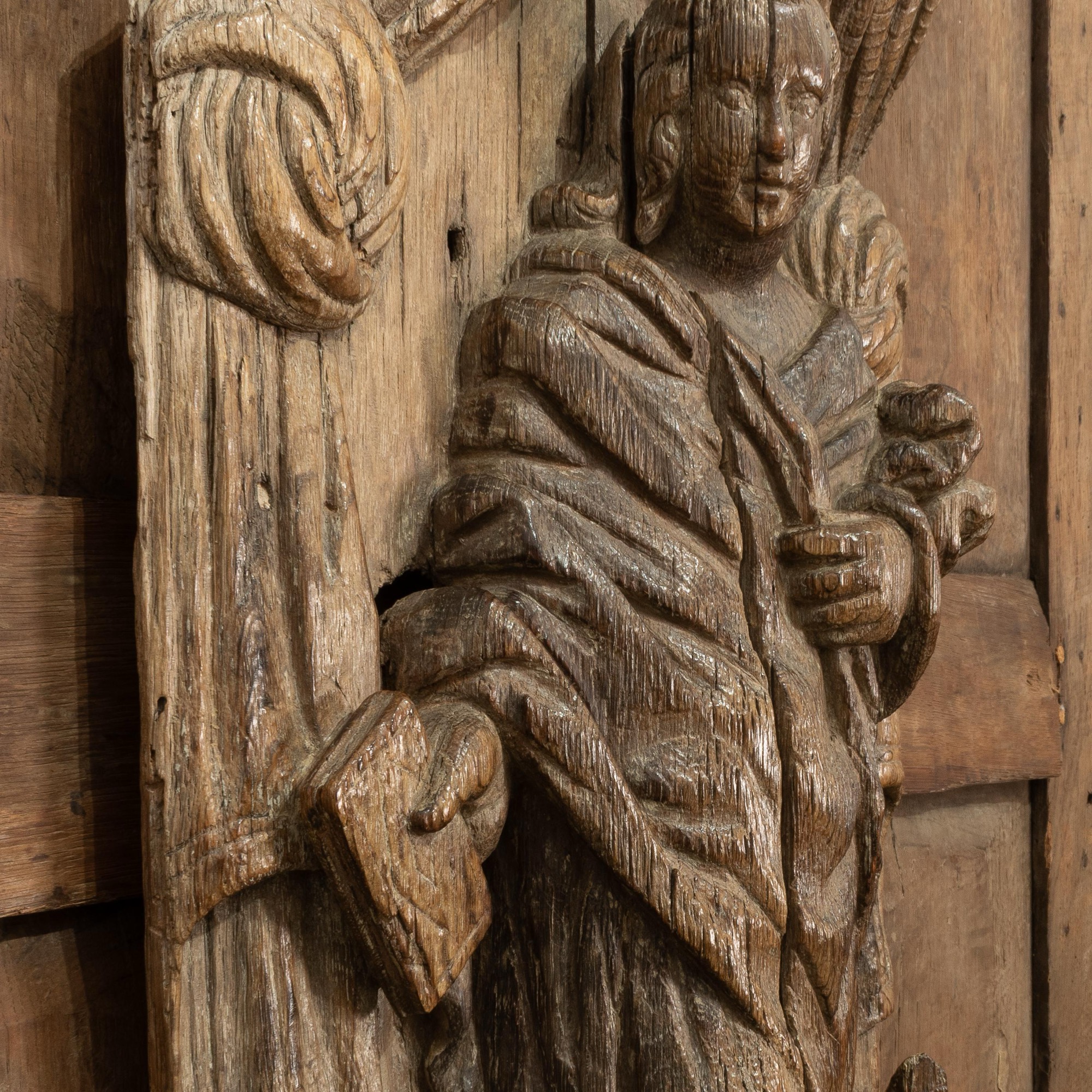 Apart from the possibility of this panel being a former stall end, the fabric draped canopy may suggest it was originally part of a pulpit or rood loft as examples with relief superstructures over carved saints endure on both. See for example the pulpit at Kenton, Devon, illustrated H. Cescinsky, 'English Furniture from Gothic to Sheraton' (1937), p. 9 and the rood loft at Llananno, Radnor, illustrated F. E. Howard & F. H. Crossley, 'English Church Woodwork' (1933), p. 42