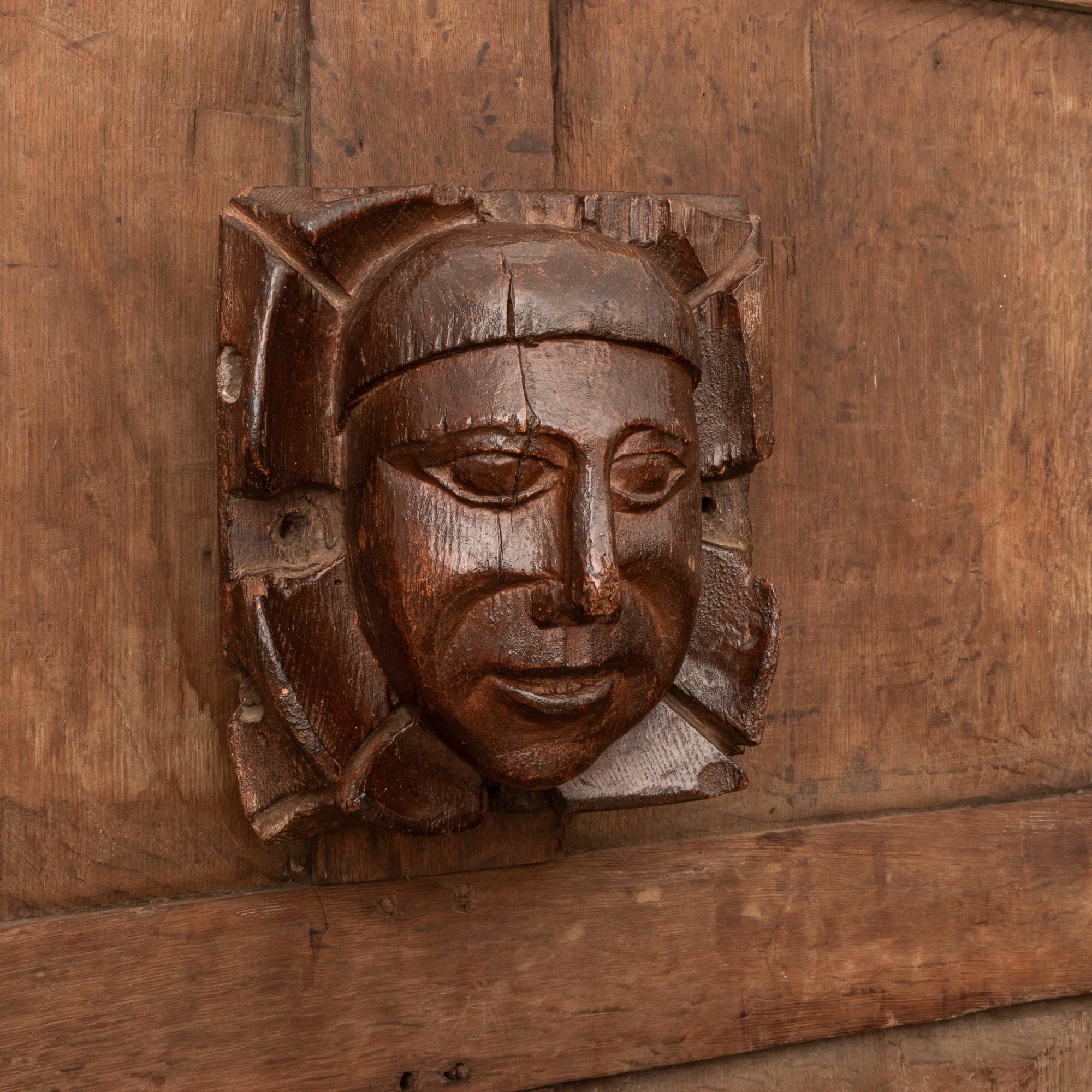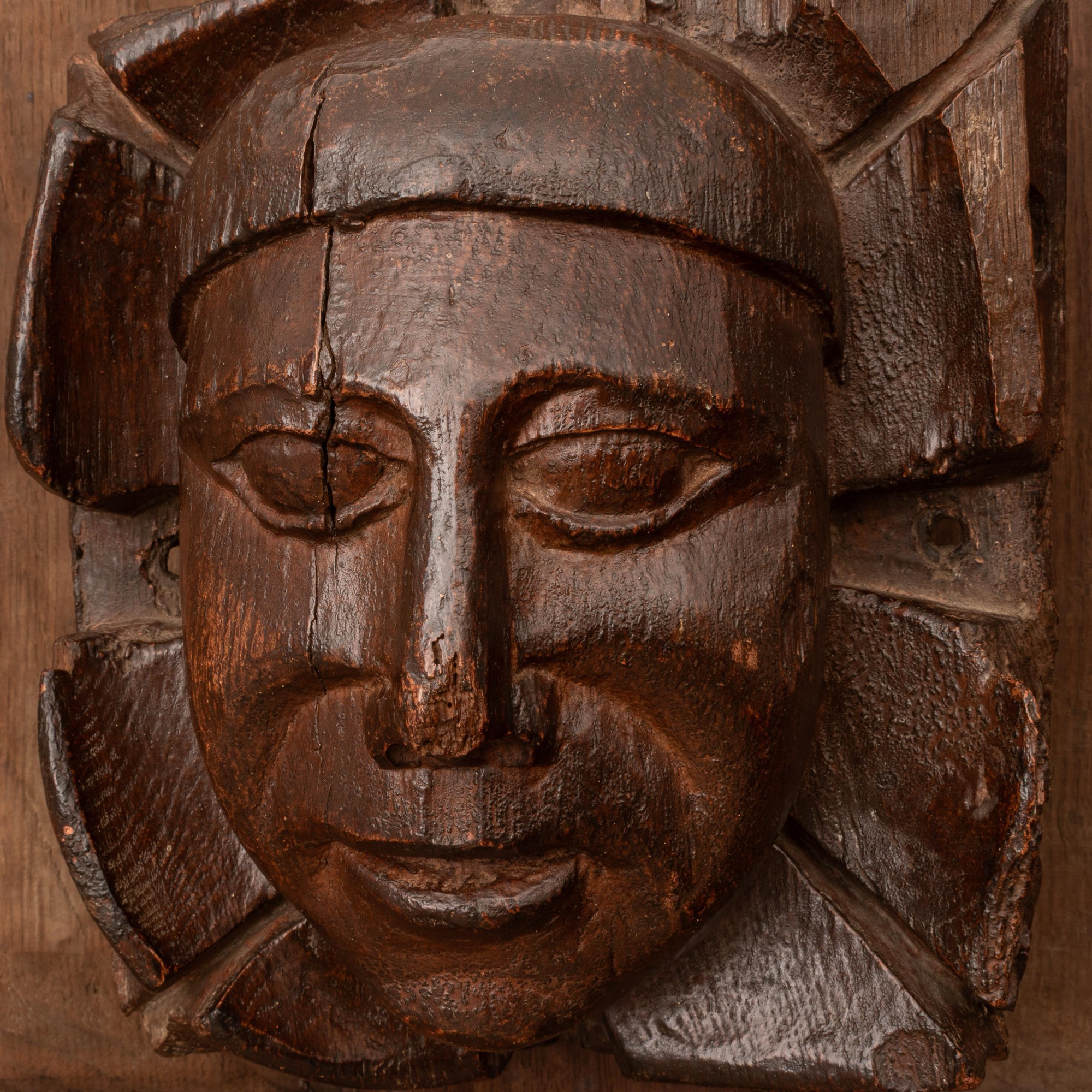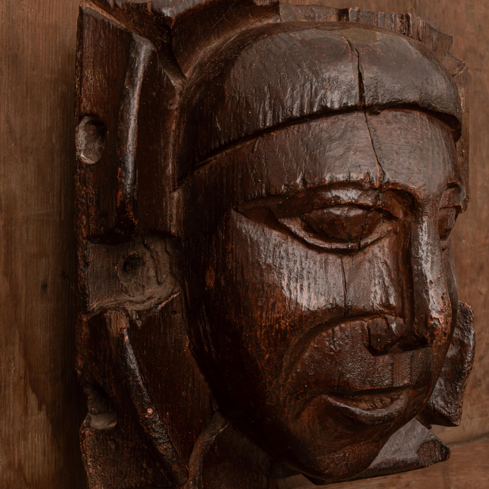 An arresting oak boss carved with the head of a man, Devon, circa 1450-1500