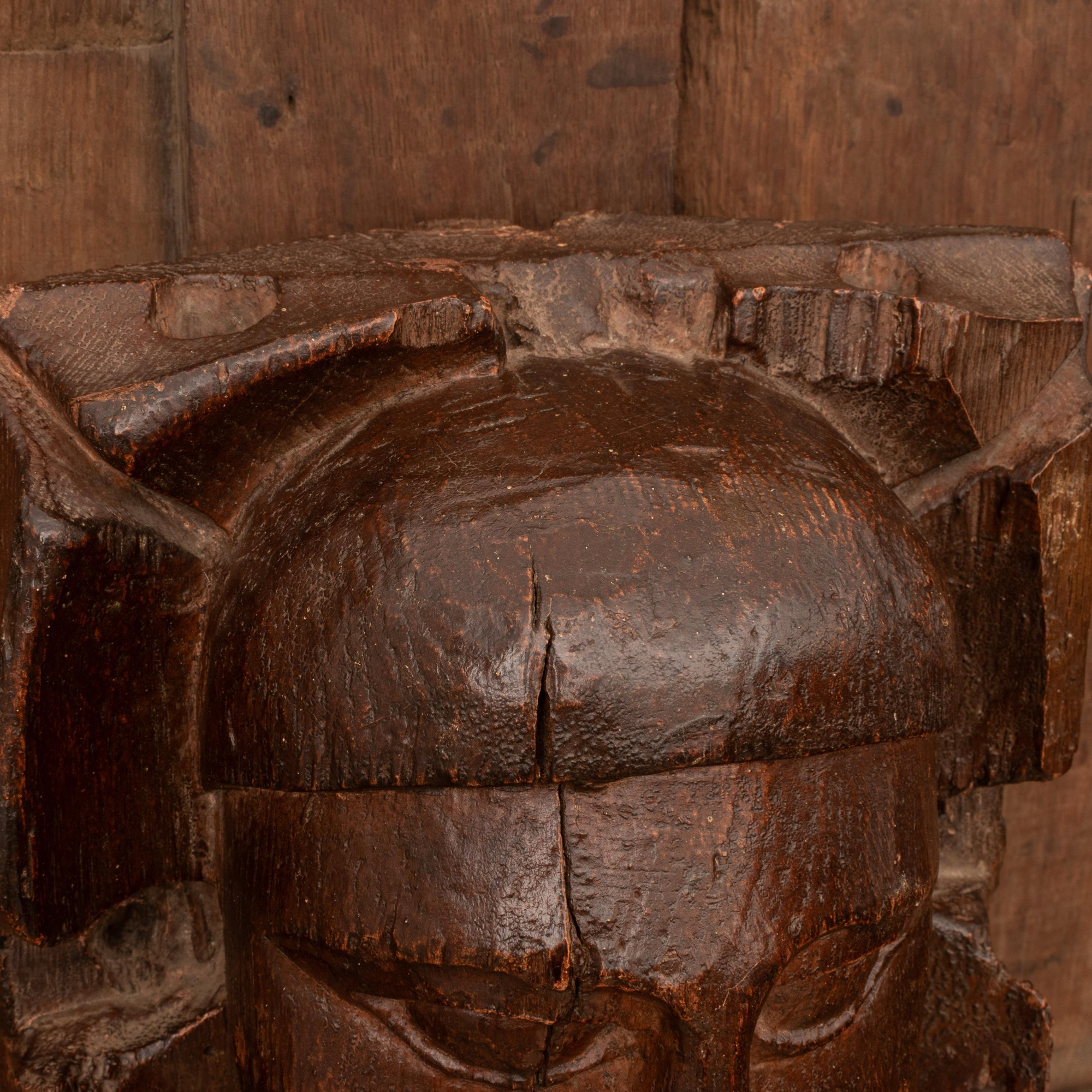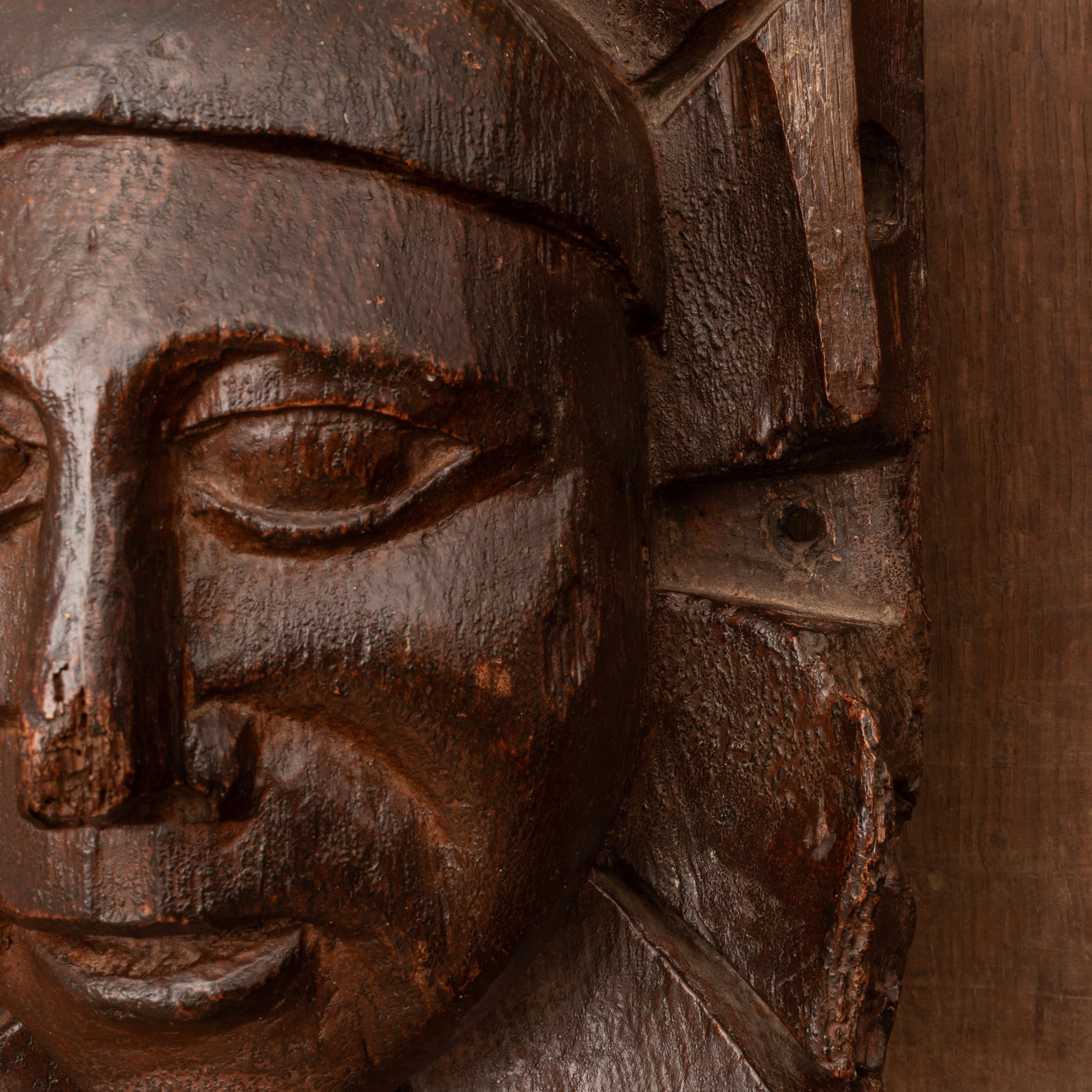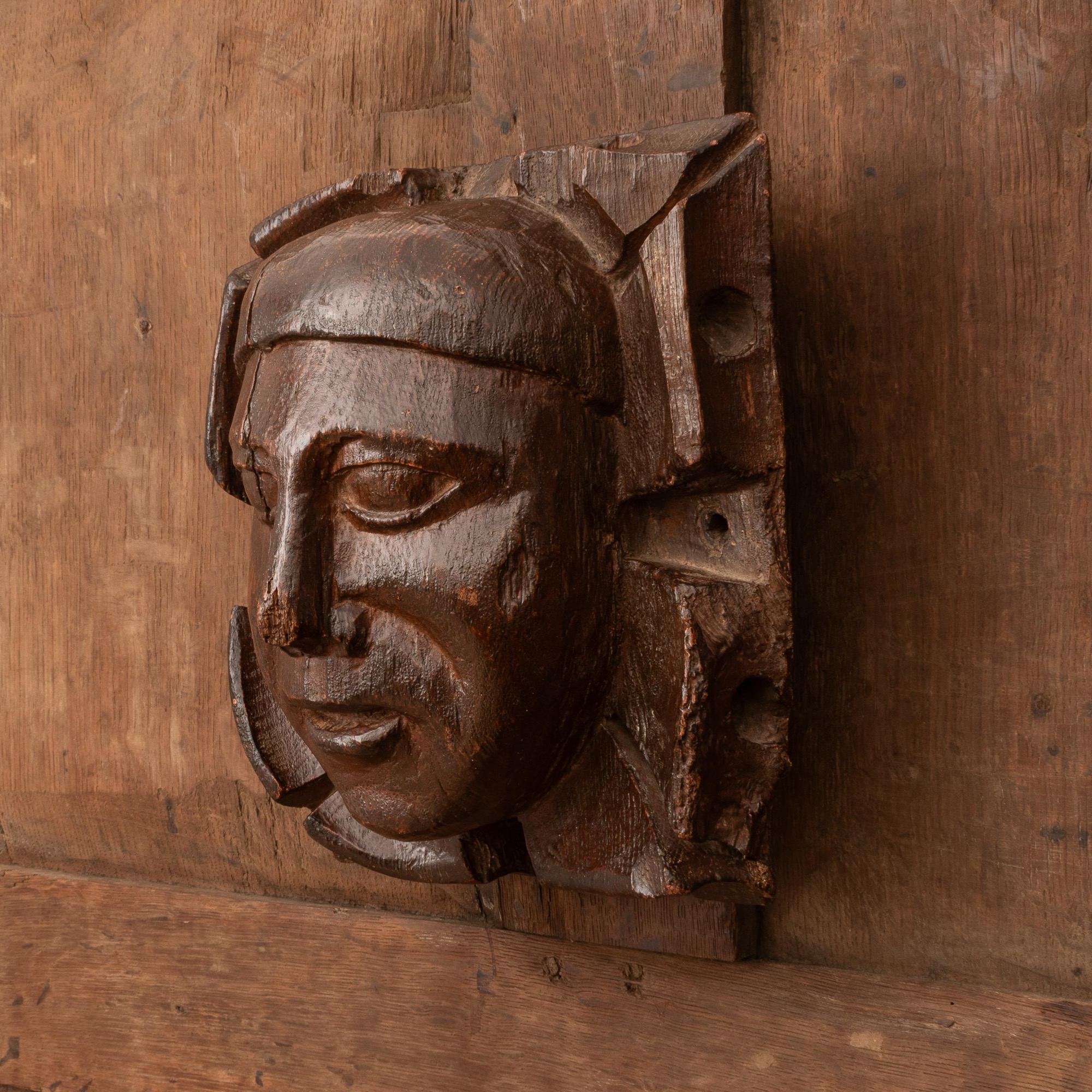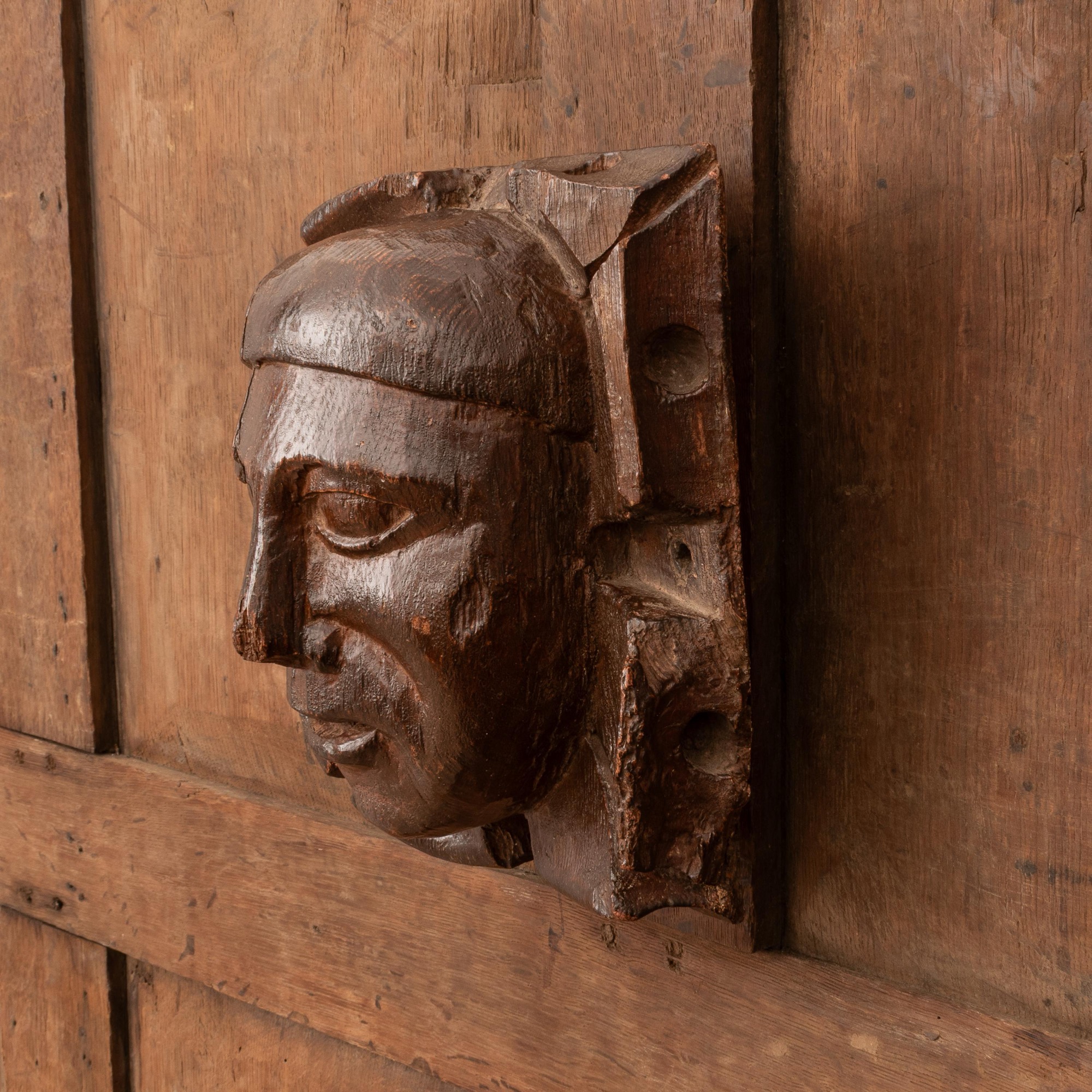 An arresting oak boss carved with the head of a man, Devon, circa 1450-1500