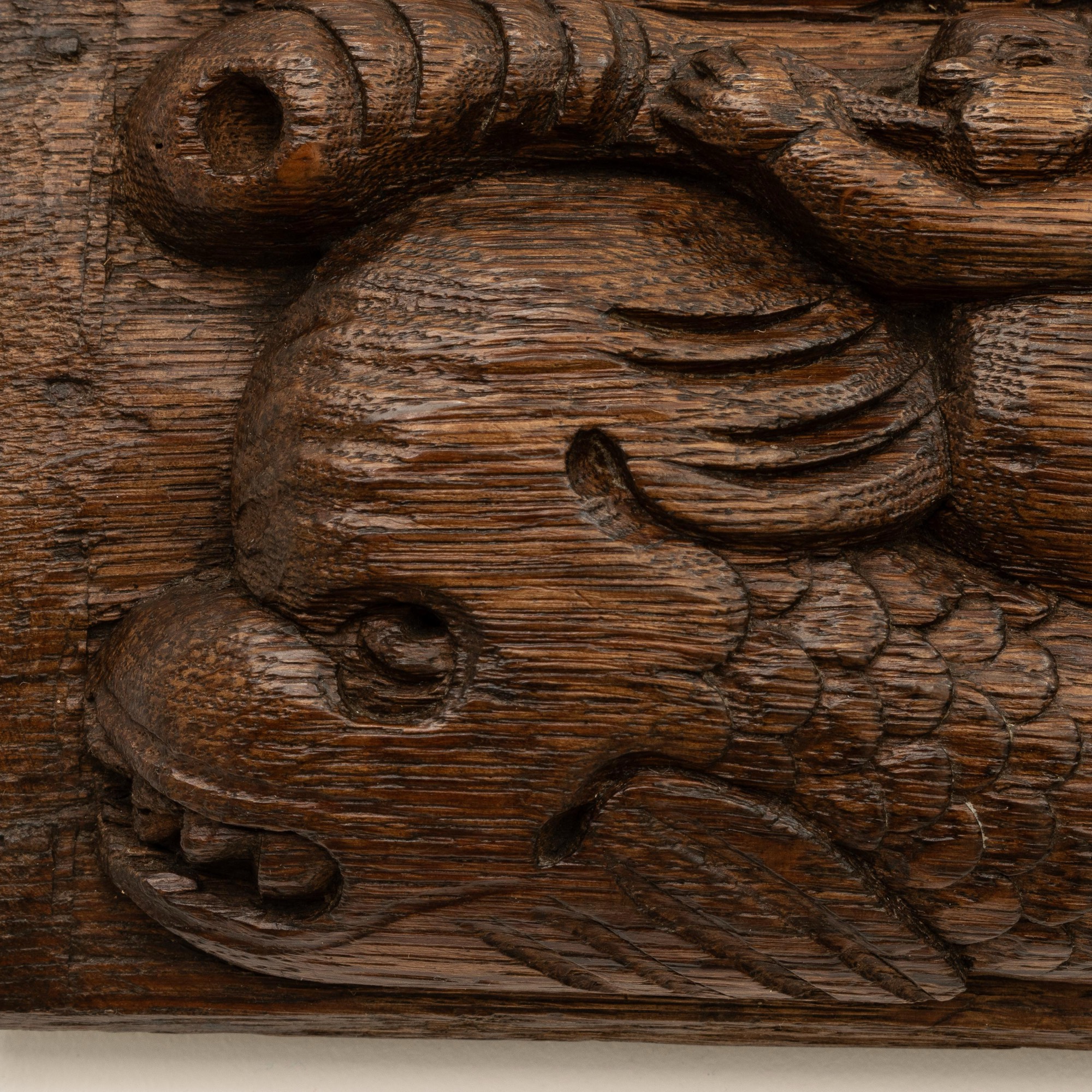 Carved with a cherub, riding a monster dolphin, whilst blowing a horn, the tail of the sea monster forming leafy-scrolls, with dog-head terminal and two exotic birds (eagles), the upper edge with egg-and-dart carving