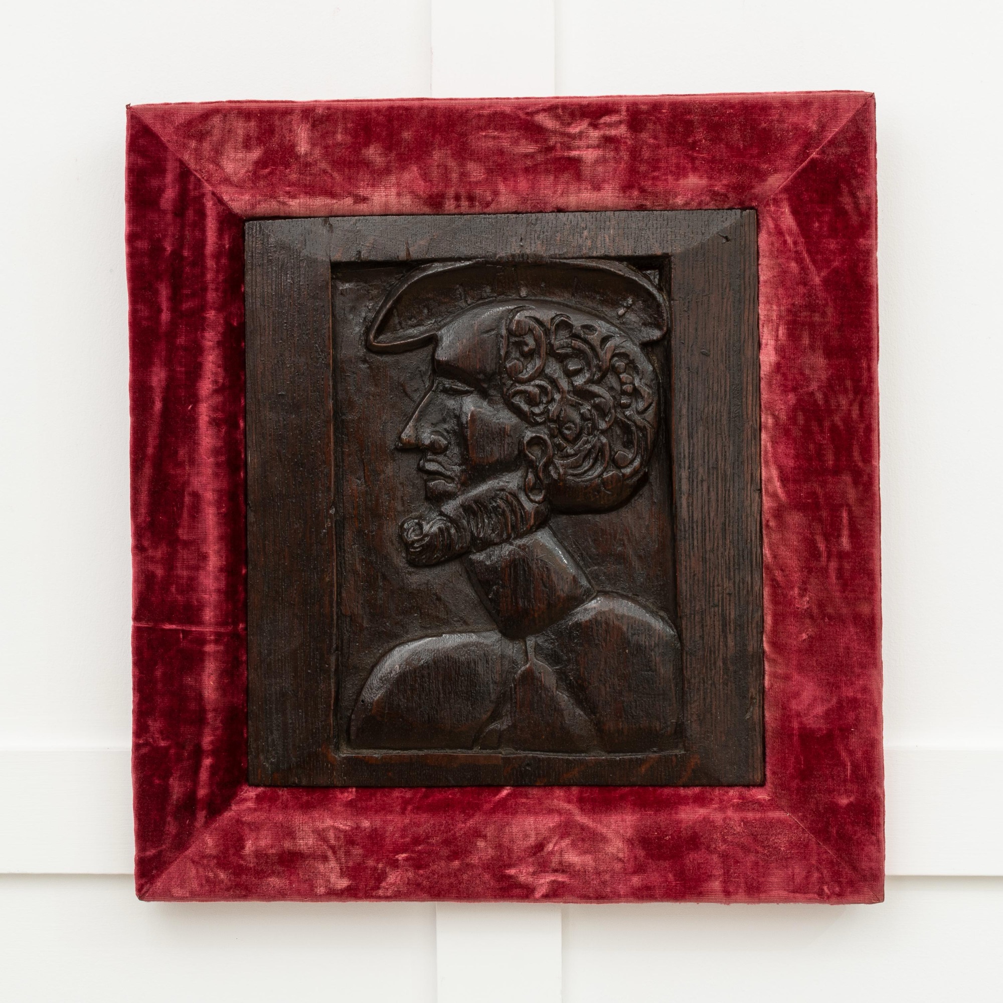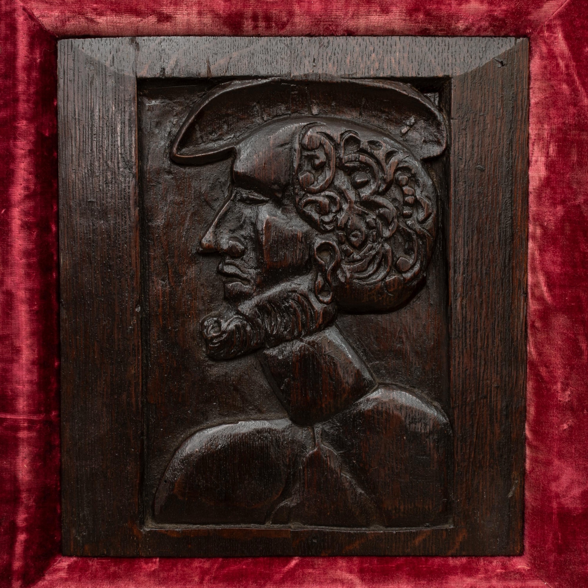 The panel appears to be an attempt of a realistic portrait depiction, far rarer than the common 'Romayne' type carved portrait panels of the period