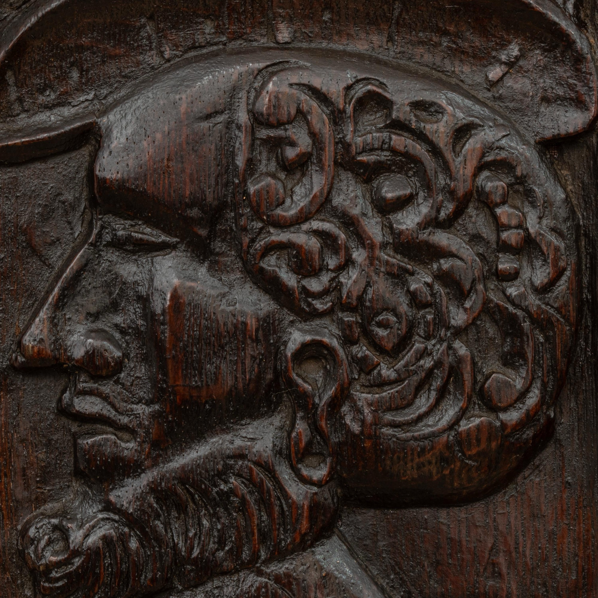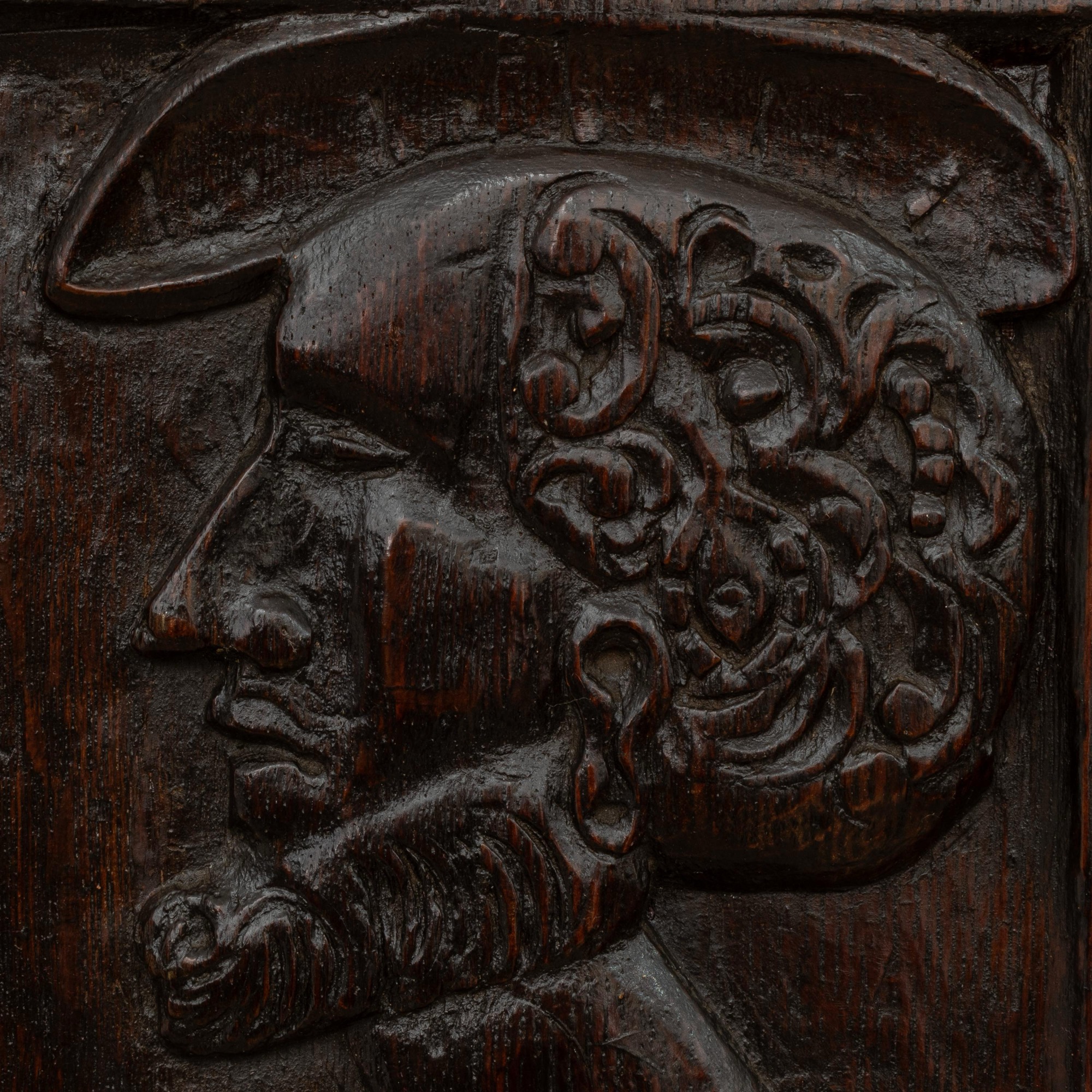 Carved with the bust of a male, facing to dexter, wearing a brimmed 'bejewelled' hat, his hair unusually formed from a bizarre arrangement of C-scrolls, gauge-work and beading, the projecting jaw-length beard more naturalistically formed, with exaggerated long narrow neck, dimensions overall: height 31.6cm, width 29.5cm