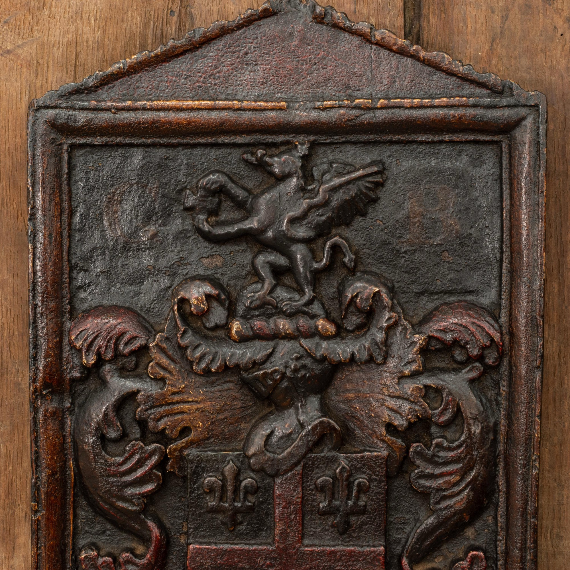 The single-piece pedimented board designed with the arms and crest of the family of Banks (alternate spelling Banke or Bankes)