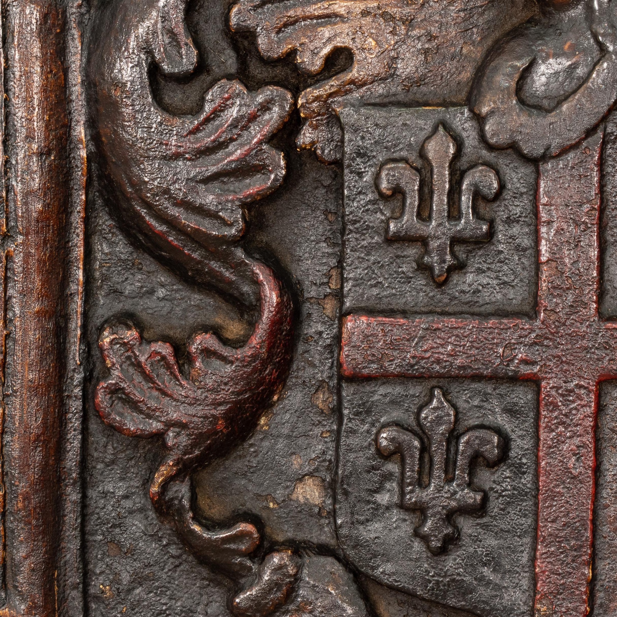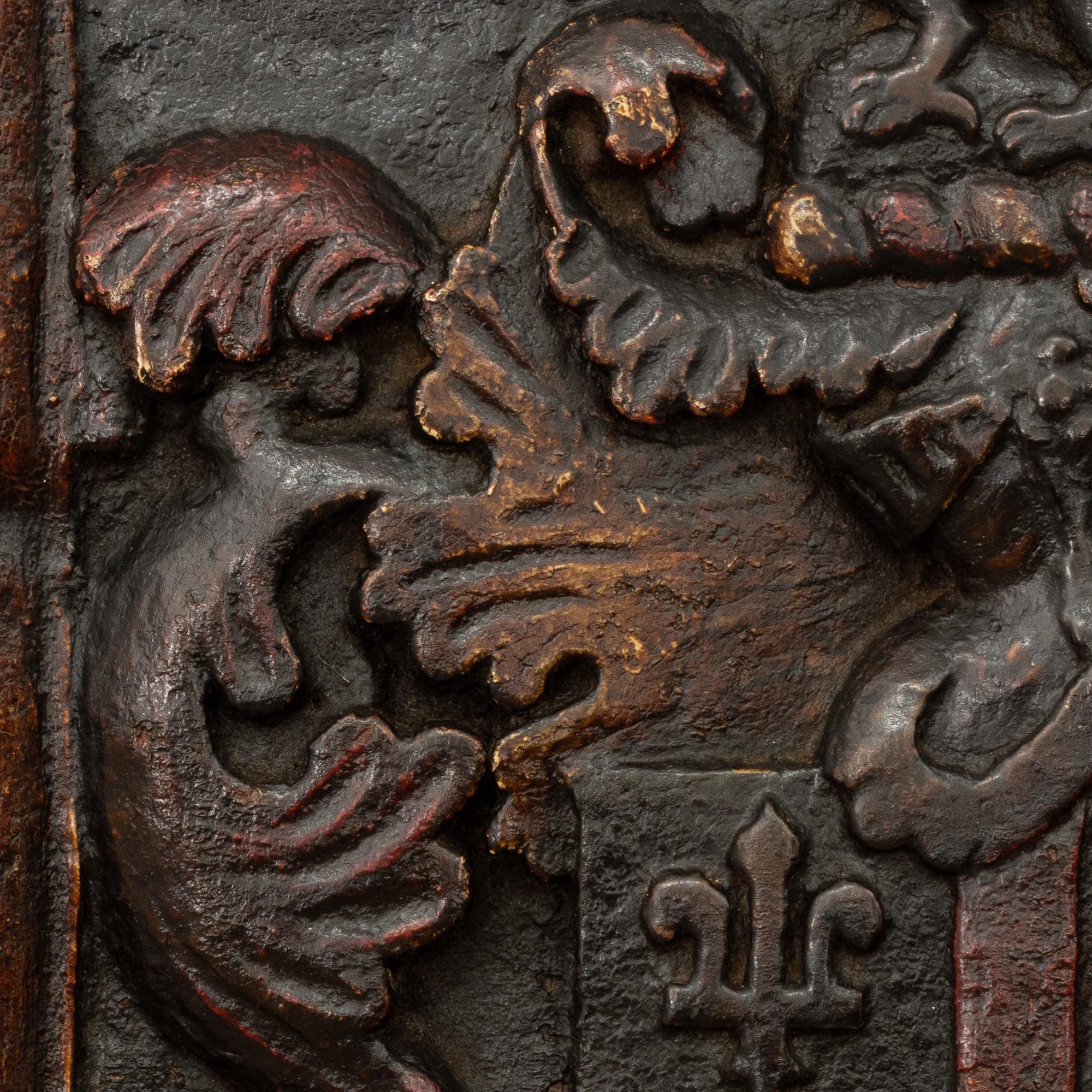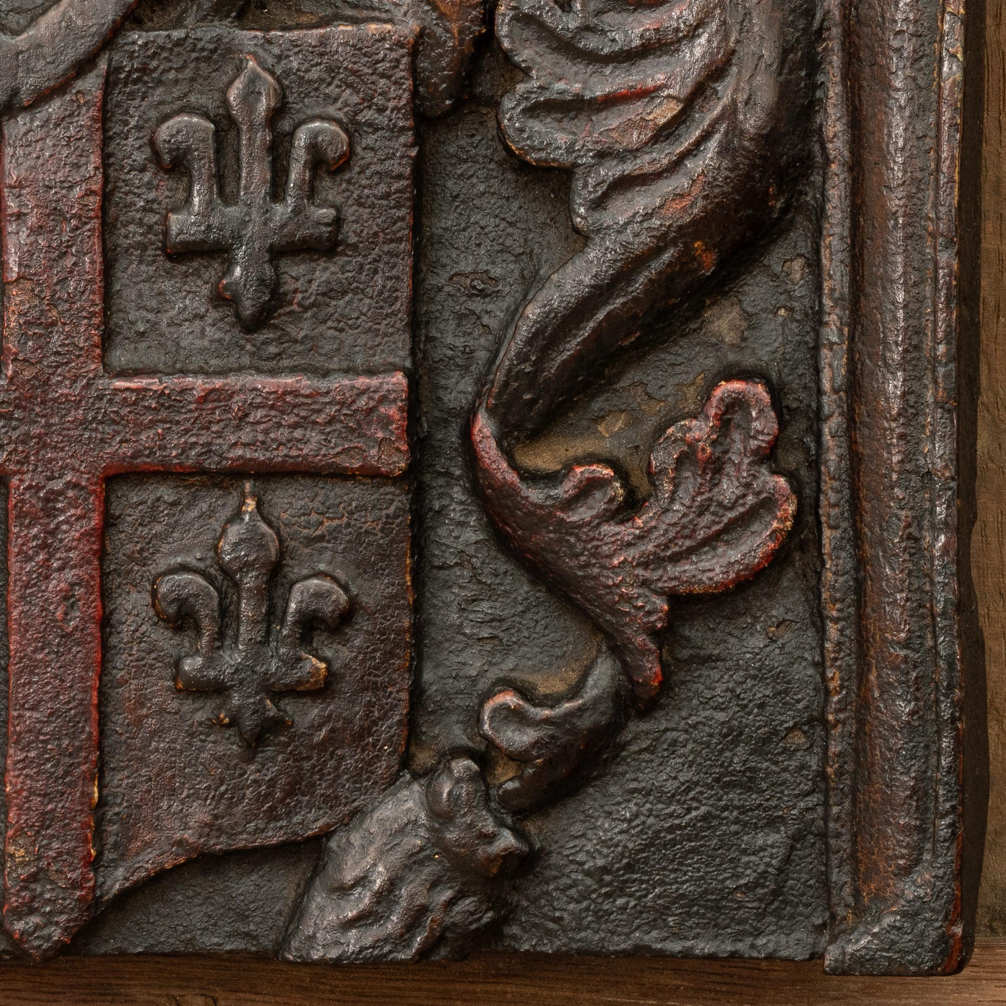 The Arms of Bank: A Charles II oak and polychrome-decorated armorial panel, Yorkshire/Lancashire, circa 1660