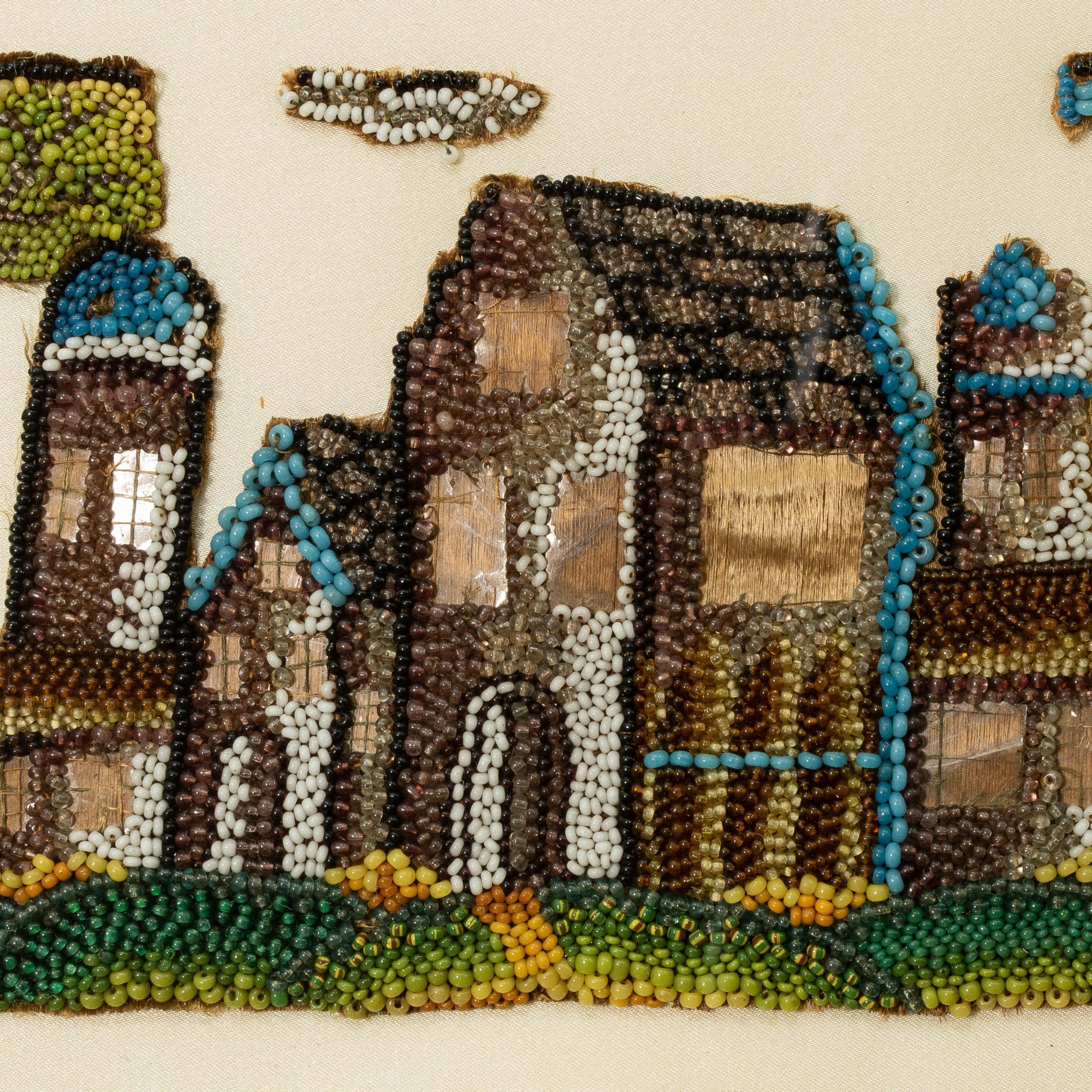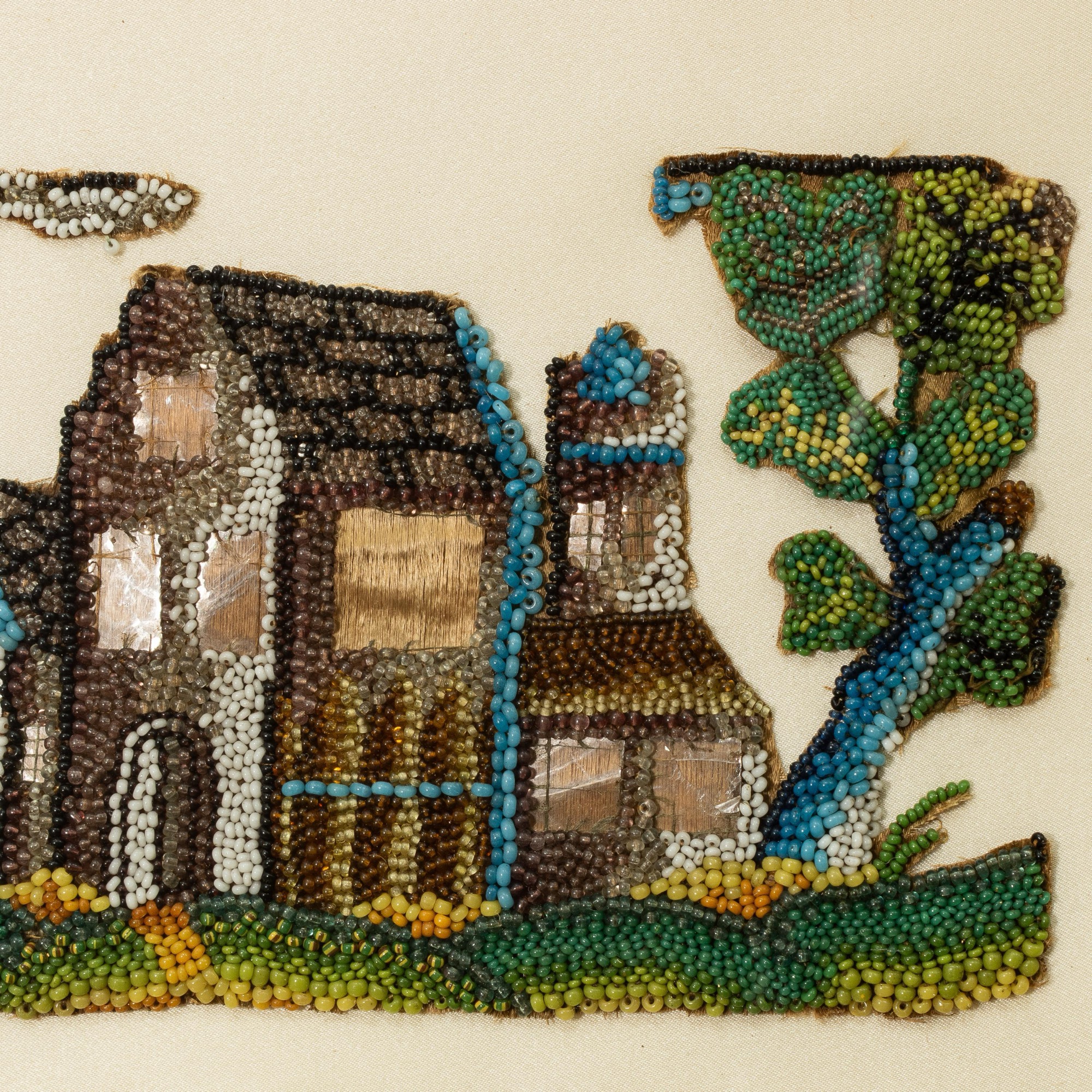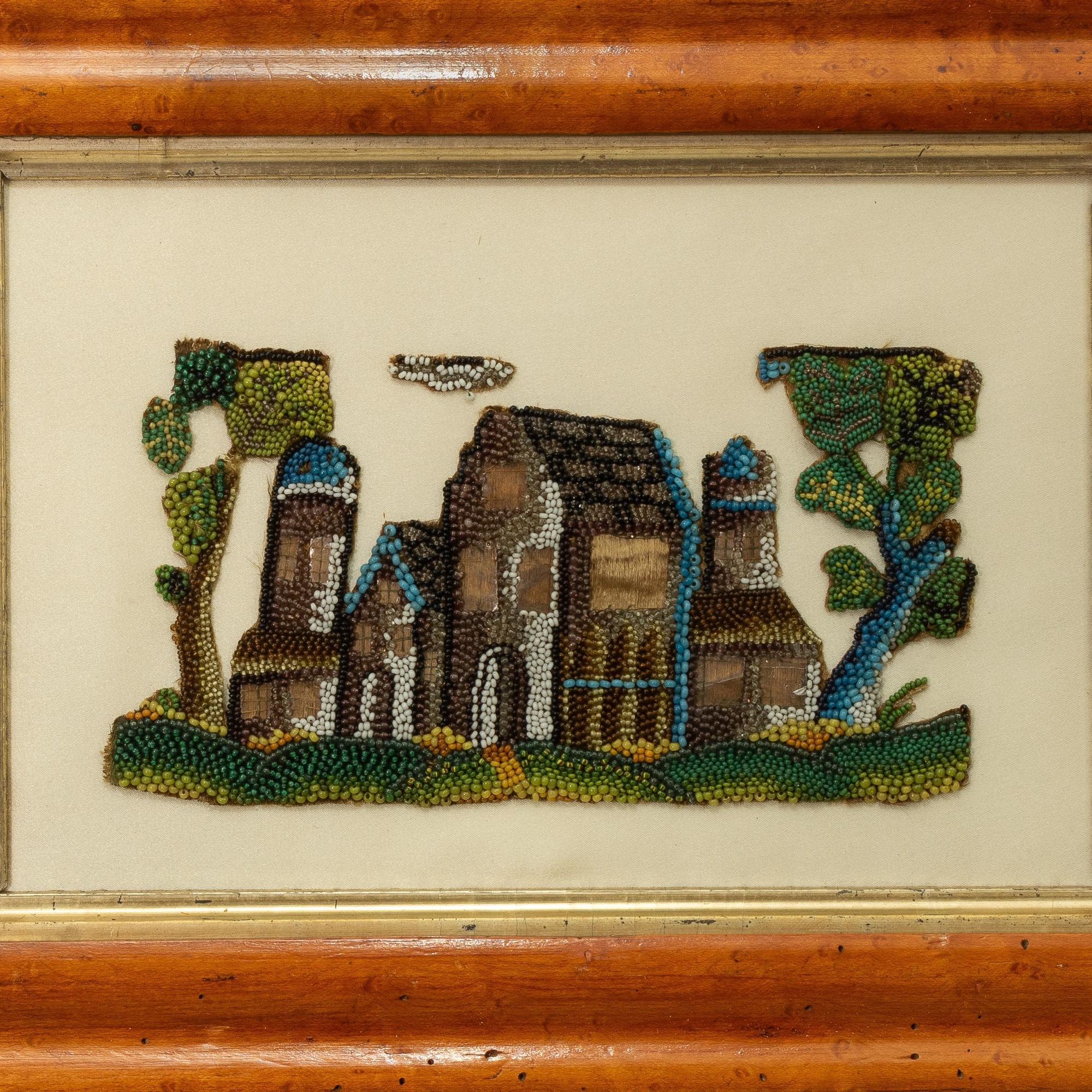 Worked in coloured glass beads on a silk ground, designed as a grand turreted house, flanked by trees, pasture to the fore, the windows picked out with fragments of mica, smoke trailing above the (now lacking) chimney at the main gable end, applied to a modern silk, in a Victorian maple frame, glazed, dimensions are overall