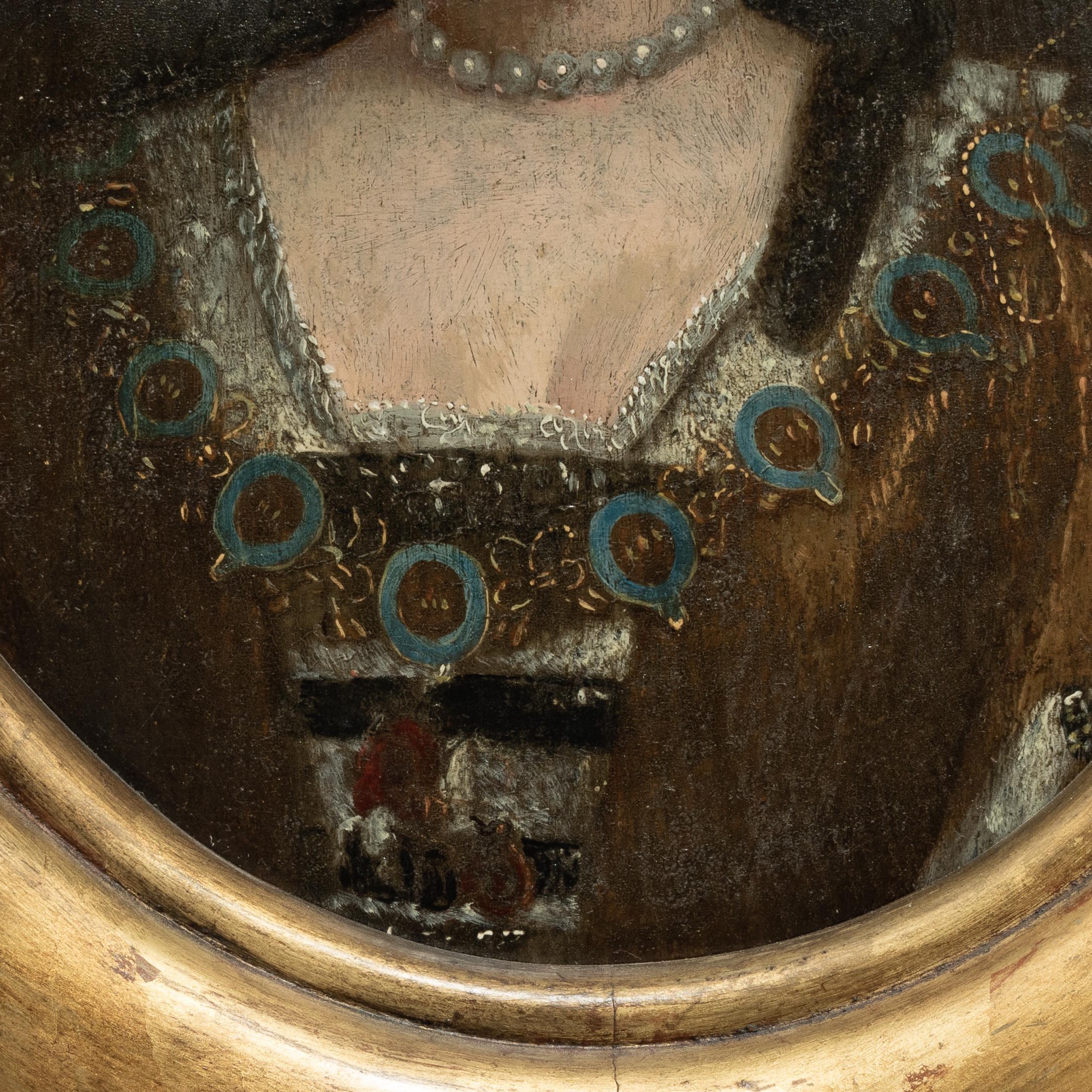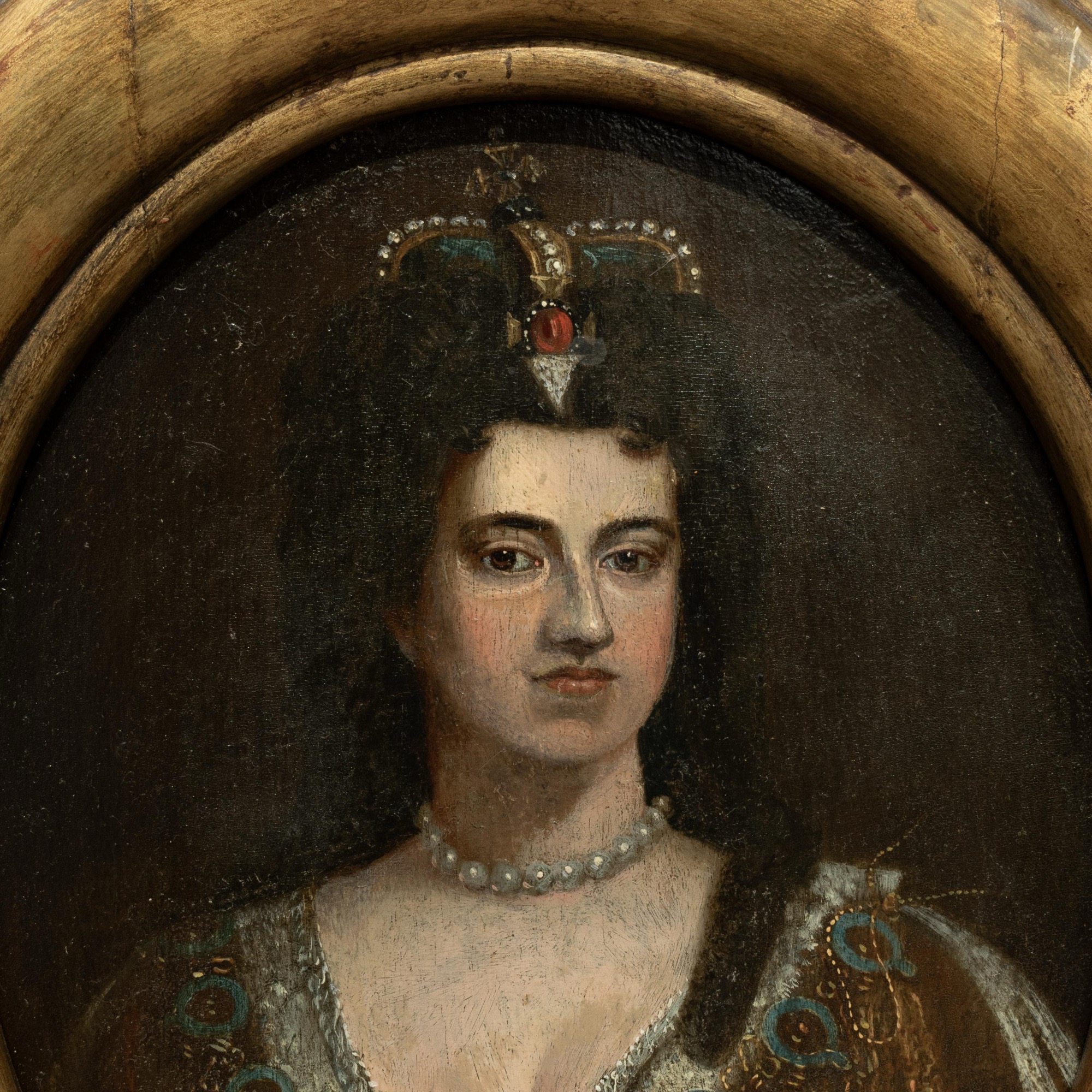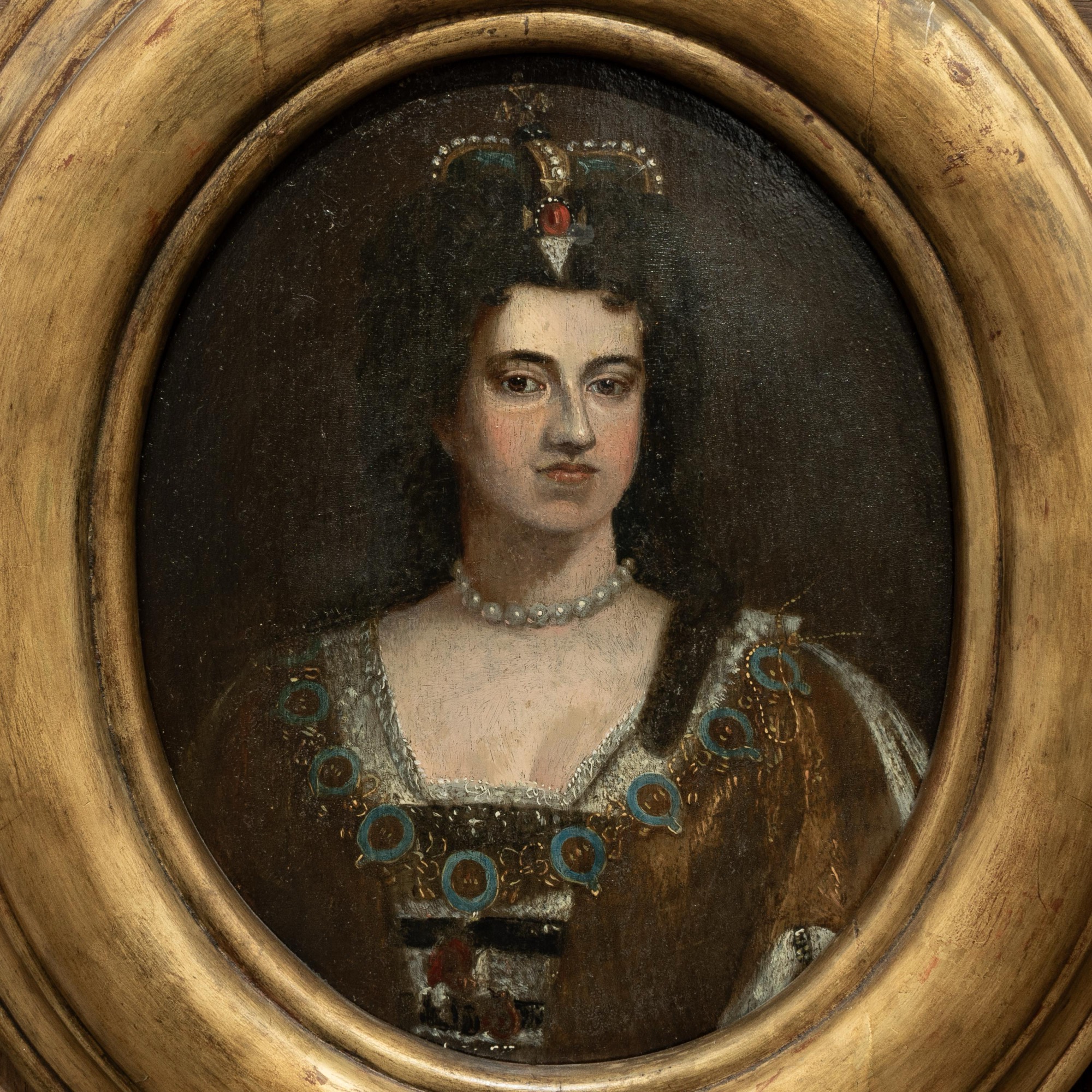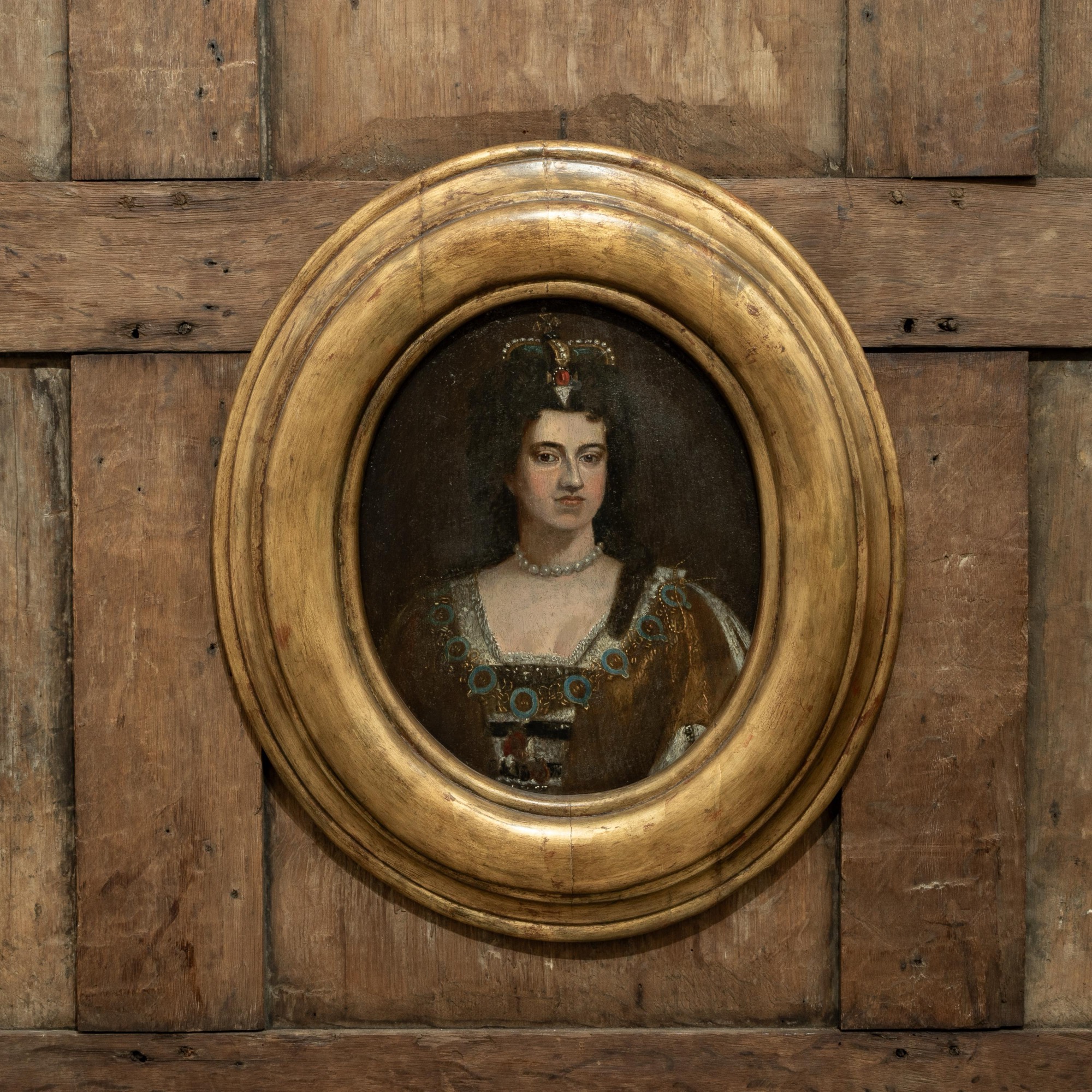 Portrait of Queen Anne (1665-1714), bust-length, wearing a crown and jewelled garter chain with medallion of St George and the Dragon, oval, oil on panel, inventory stencil verso, dimensions including giltwood cushion-moulded frame