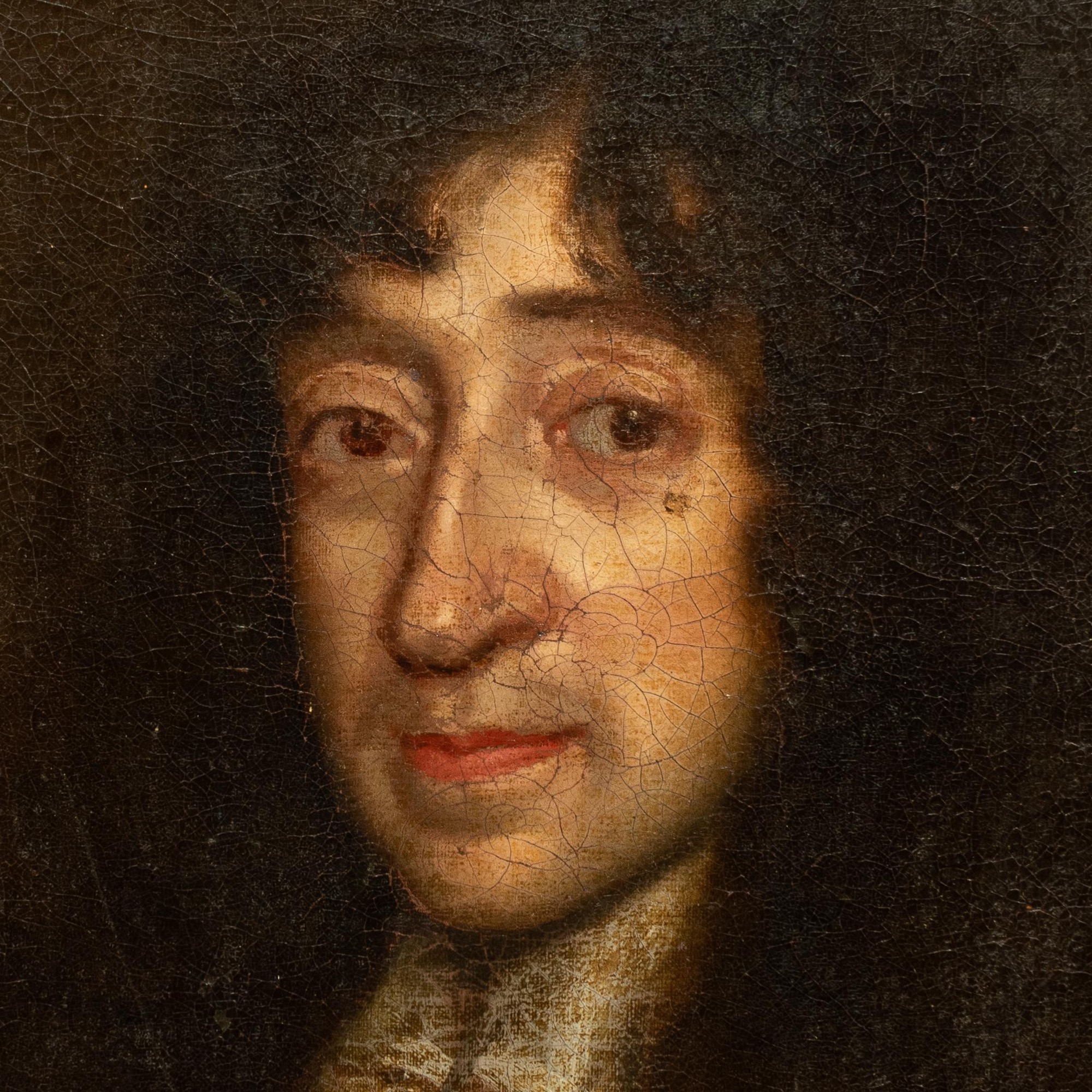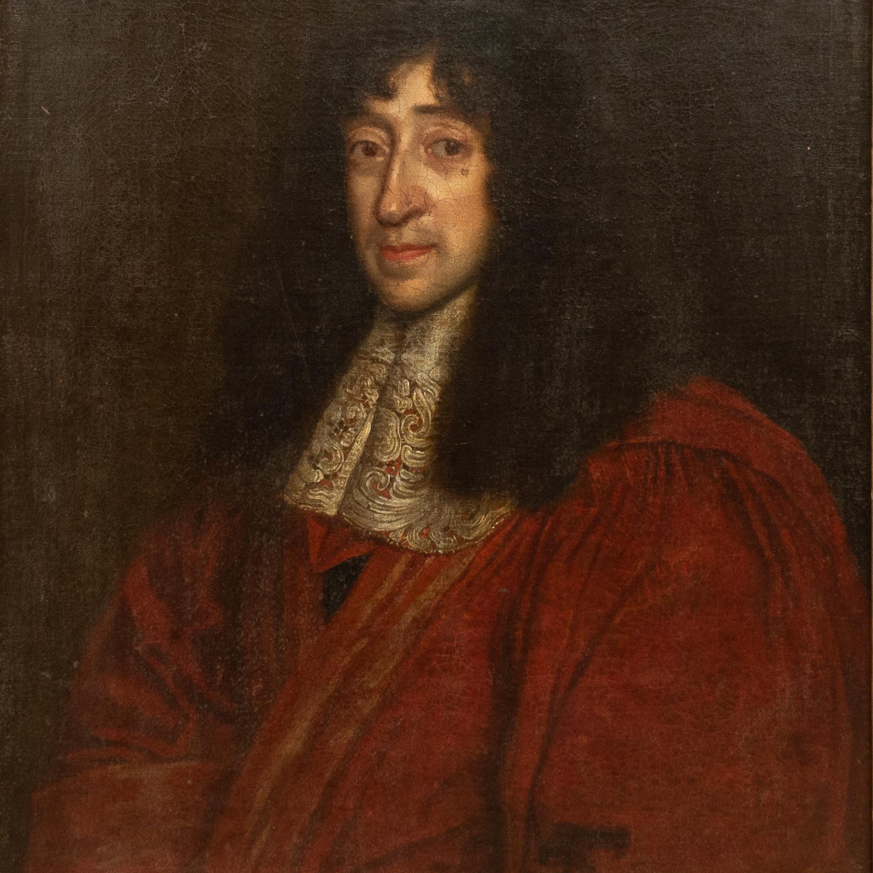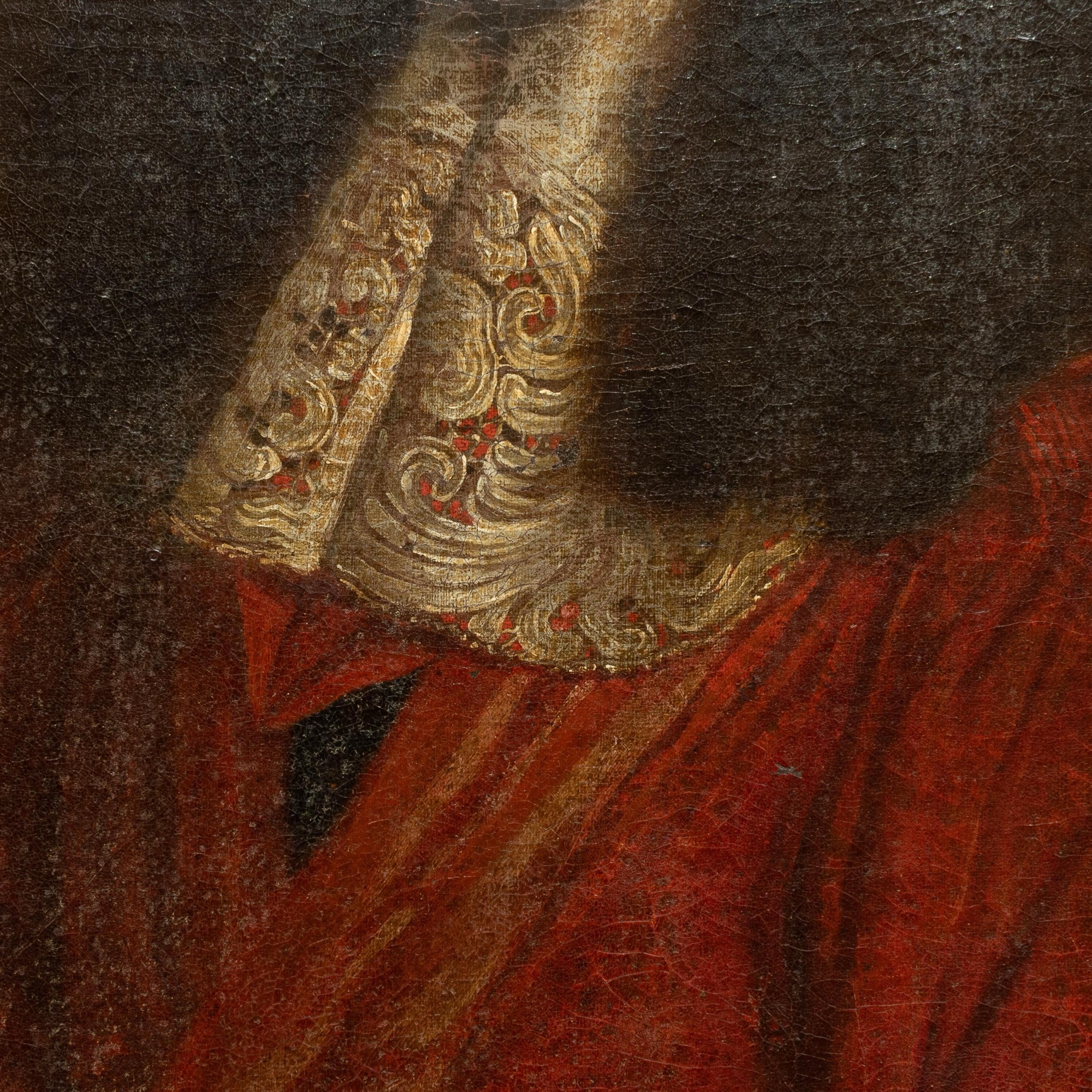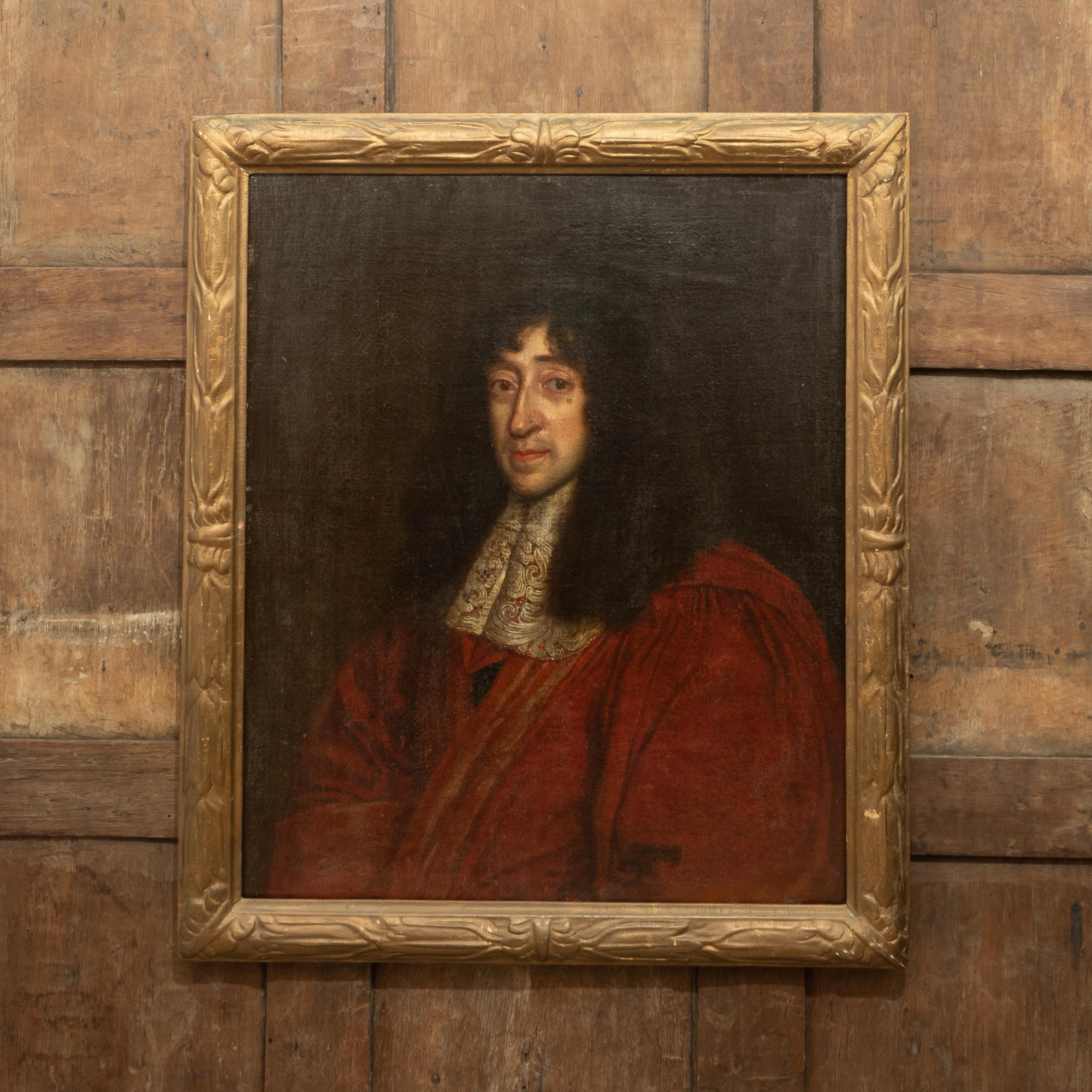 Portrait of a nobleman, half-length, wearing crimson robes and a fine tied lace cravat, dimensions include giltwood frame