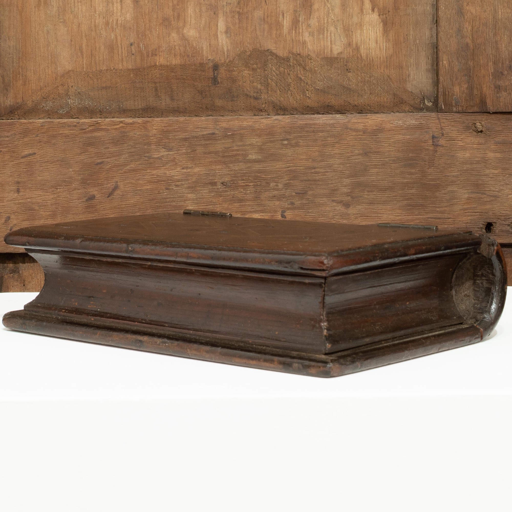 The hinged lid geometric inlaid with various specimen timbers, and highlighted with chip-carving, the semi-circular 'spine' linear inlaid and the sides of convex-form to represent pages